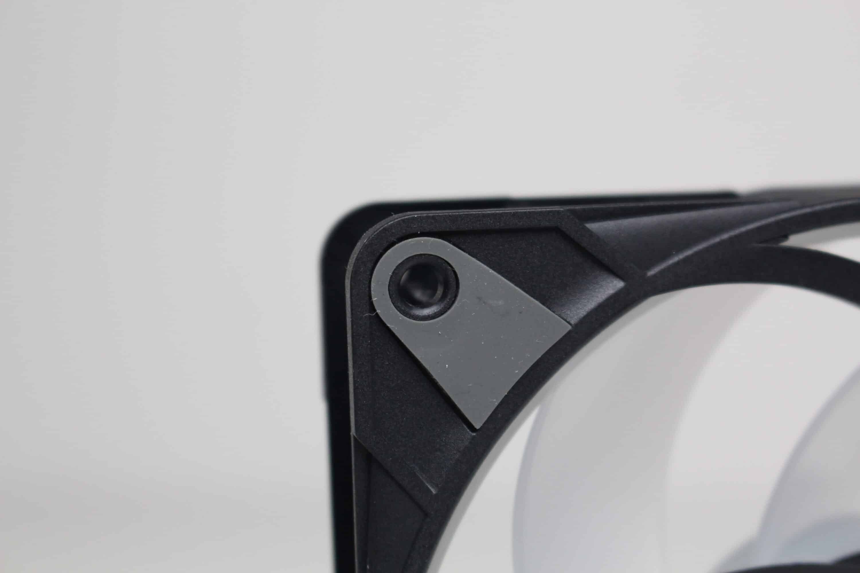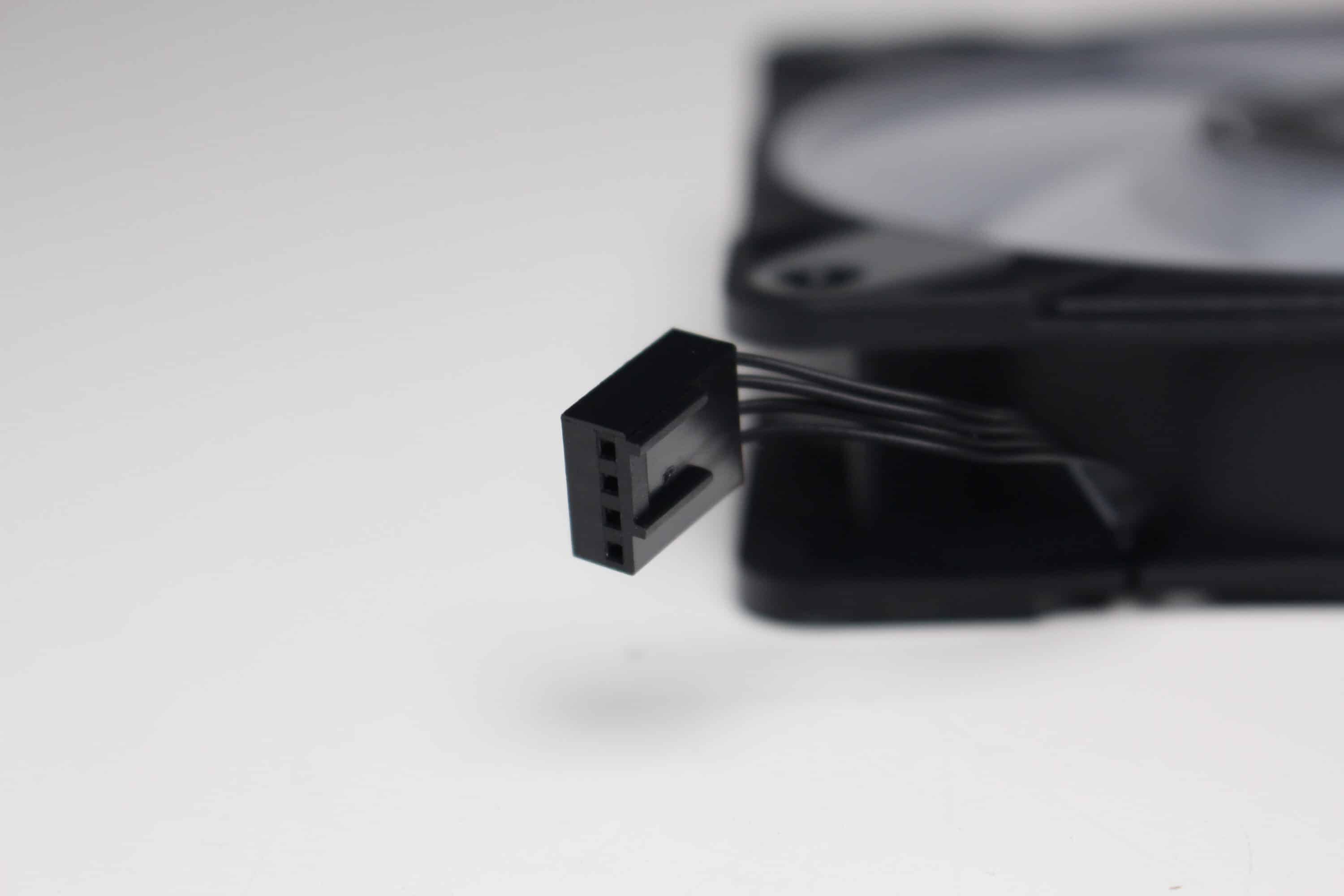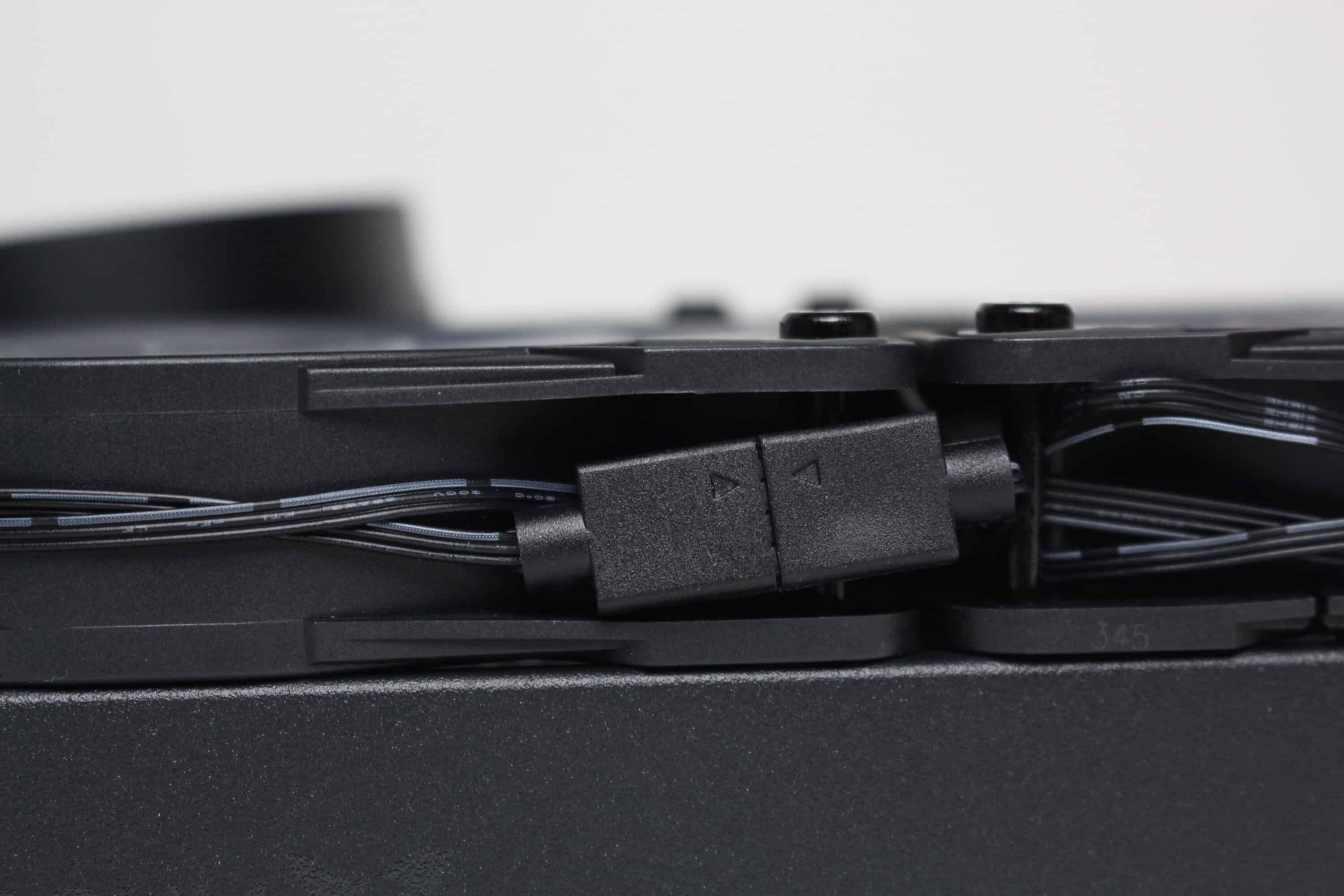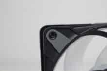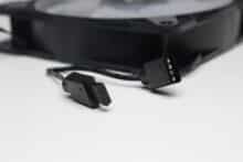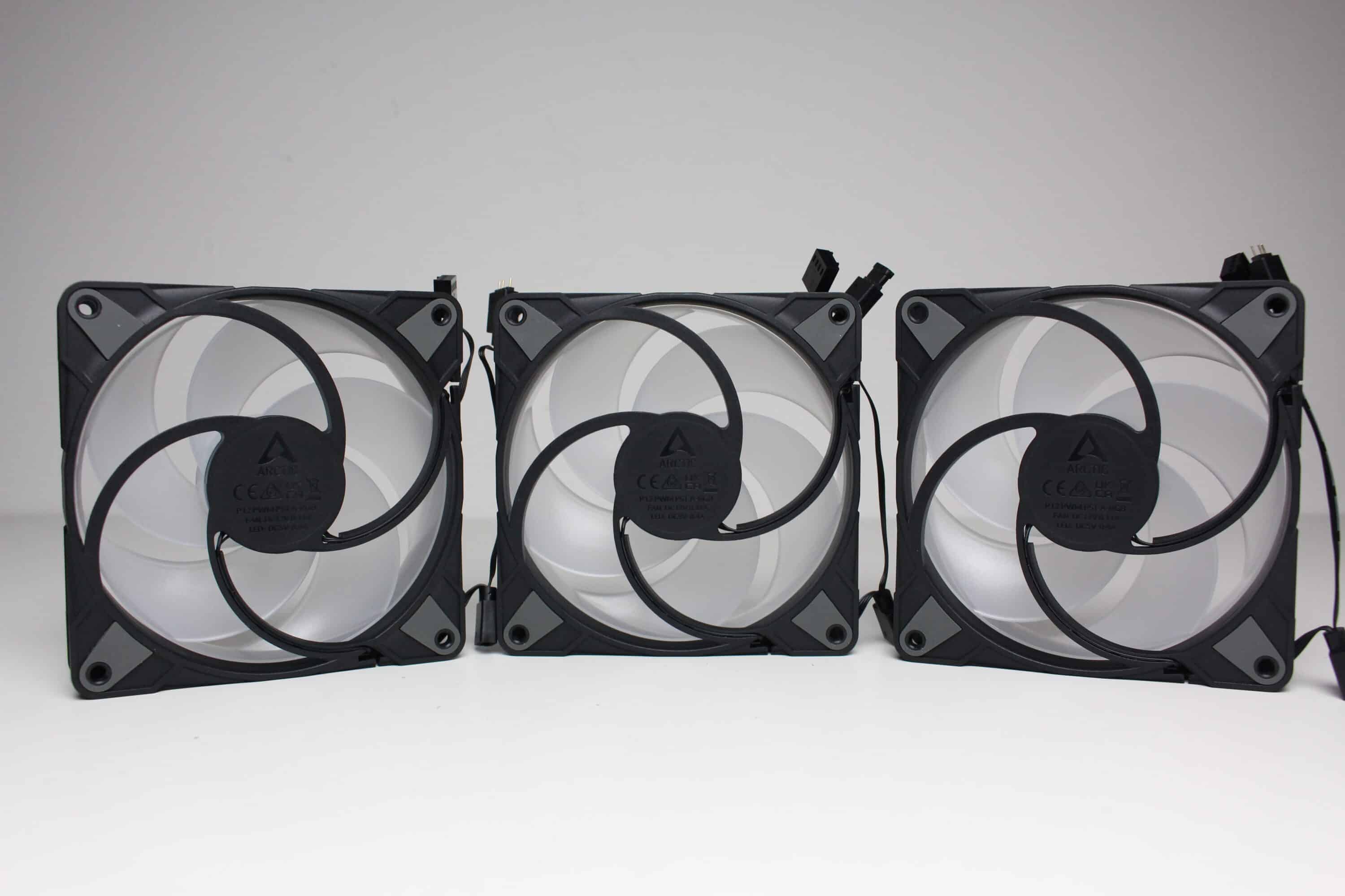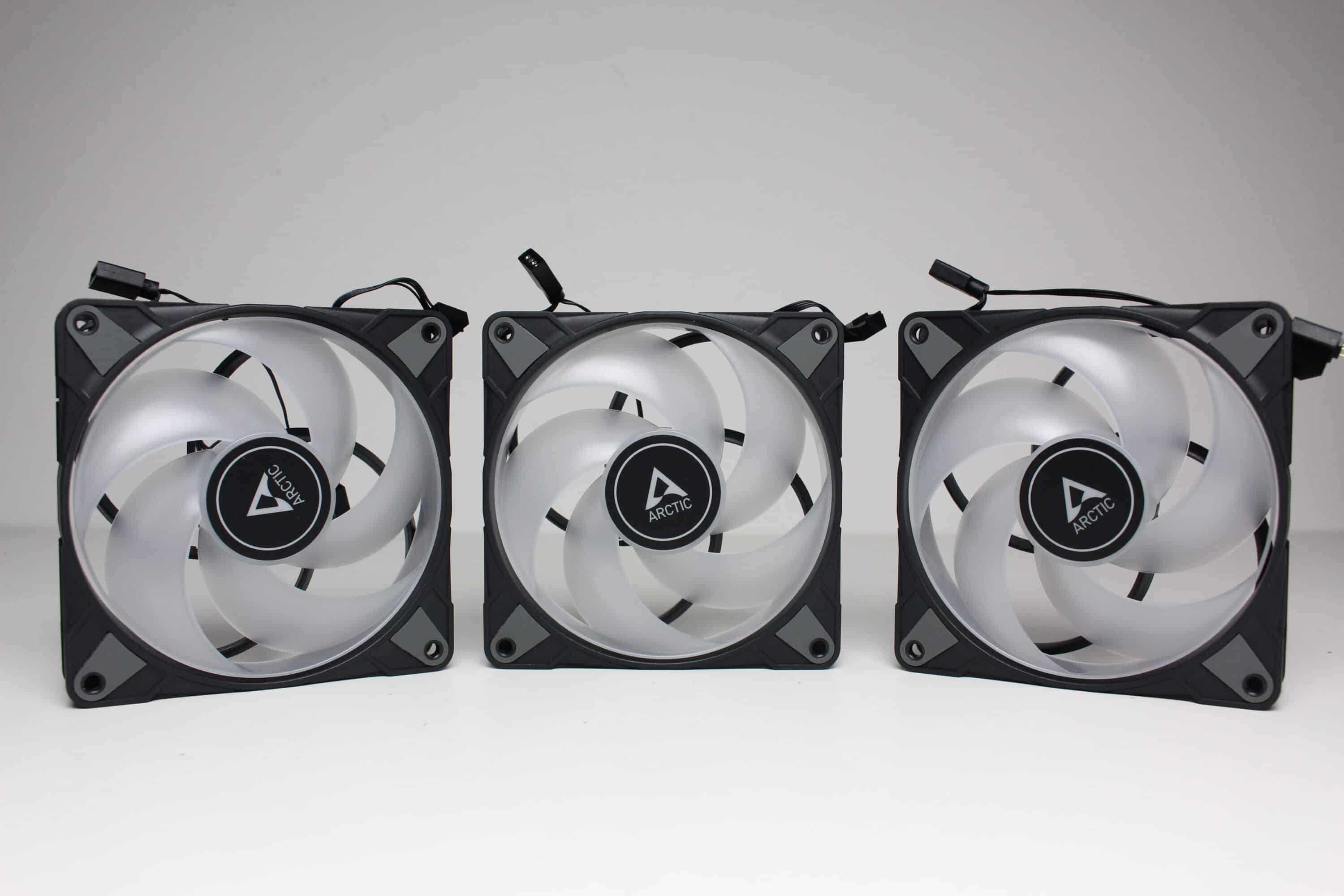 Unverändert bleiben hingegen wieder die Lüfter. Bei der A-RGB-Variante kommen abermals die beliebten Arctic P12 PWM PST A-RGB zum Einsatz, die über einen weiten Drehzahlbereich zwischen 200 und 2000 Umdrehungen verfügen sowie mit einer hohen Laufruhe überzeugen sollen. Der Lüfterrahmen ist schwarz gehalten, die 5-blättrigen Rotorblätter hingegen milchig-transparent. Zudem sind alle Lüfterblätter über einen äußeren Ring miteinander verbunden und der Rahmen verfügt beidseitig über graue Gummiflächen zur Entkopplung. Der Anschluss erfolgt über ein einzelnes 4-Pin-PWM-Kabel für Strom sowie 3-Pin-5V-Splitter für die ARGB-Beleuchtung. Diese befindet sich in Form von 12 ARGB-LEDs in der Lüfternabe.
