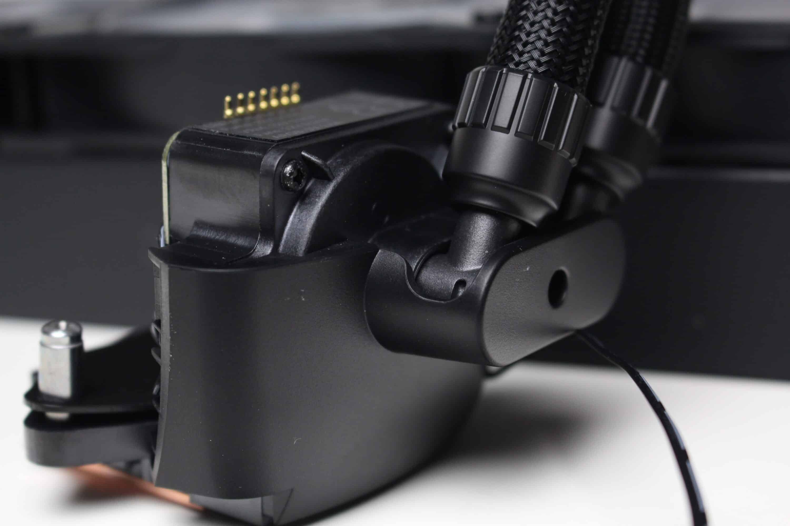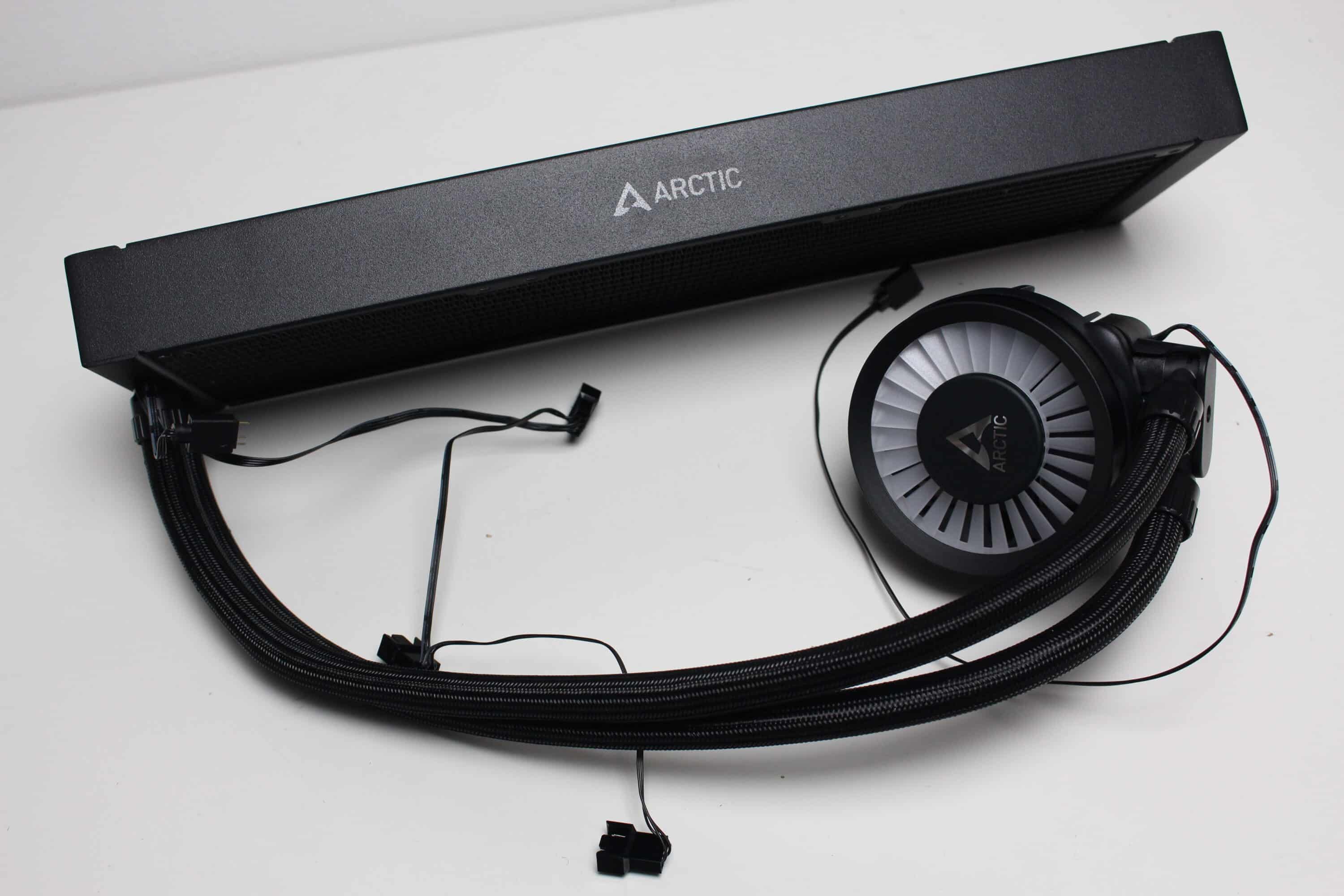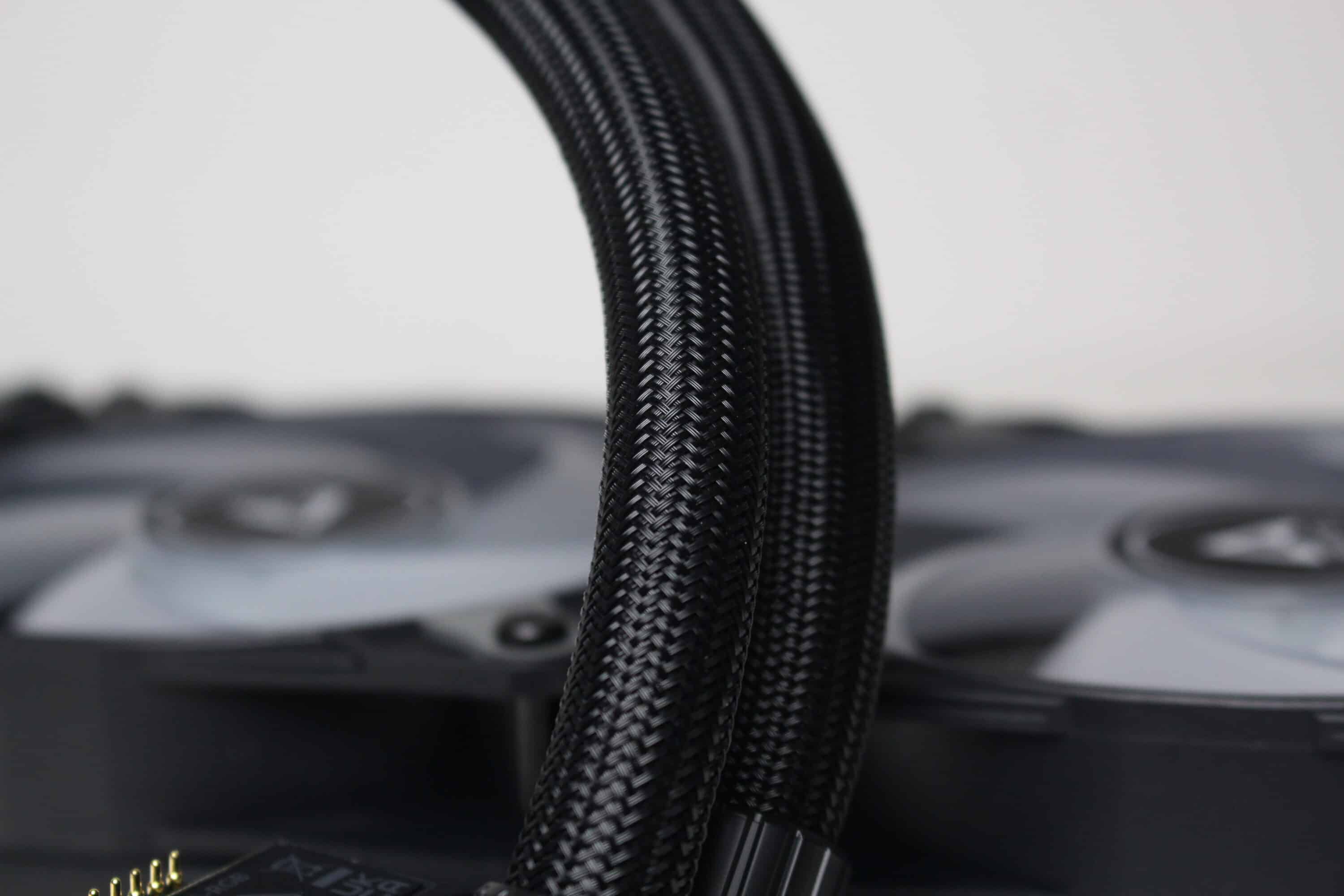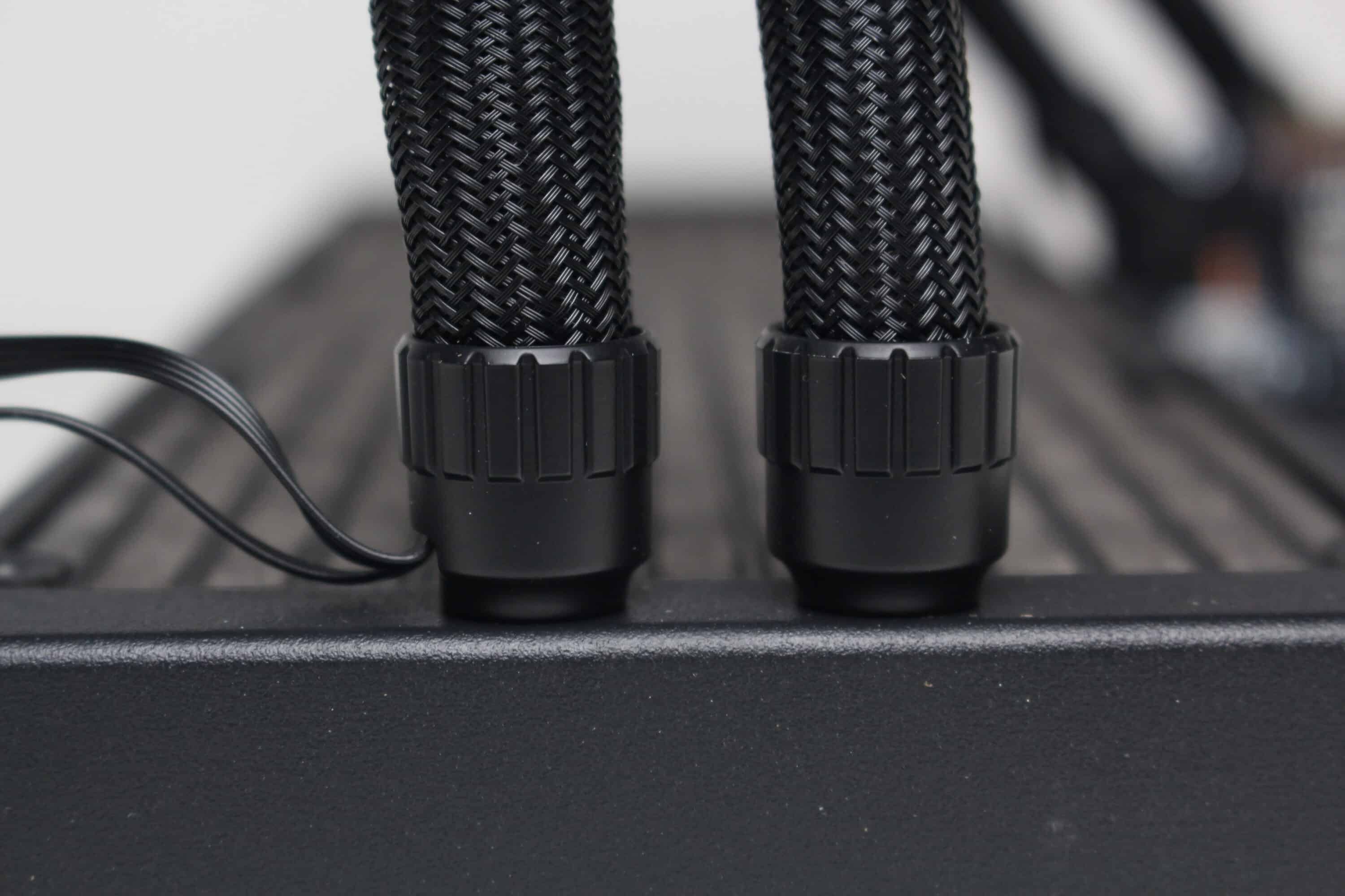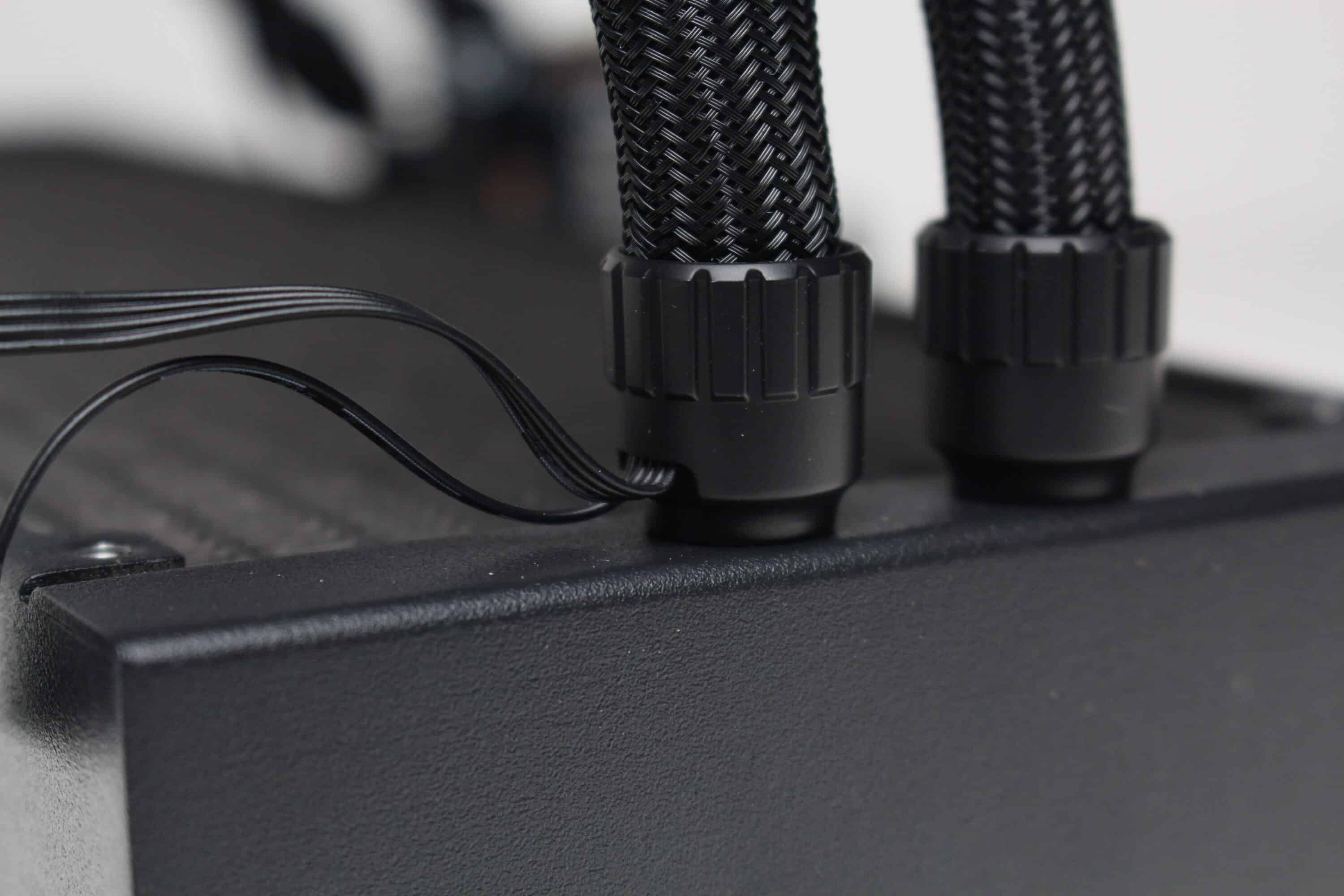 Mit dem Ziel eine schlichtere Gesamtoptik zu erhalten, hat Arctic die schwarzen-grauen Wasserschläuche in Rente geschickt und setzt nun auf die üblichen textilummantelten Schläuche in Schwarz. Die Verbindung zwischen Schlauch, Pumpenblock und Radiator erfolgt jeweils über zwei einfache Muffen aus Kunststoff. Am Pumpenblock implementiert der Hersteller zudem eine Möglichkeit die Orientierung der Schläuche zu ändern. Mit 450 Millimetern sind die Schläuche zudem überdurchschnittlich lang und ermöglichen dadurch eine flexible Positionierung im Gehäuse. Innerhalb der Ummantelung versteckt Arctic zudem das PWM- und ARGB-Kabel. Das führt stellenweise jedoch dazu, dass der Schlauch in bestimmten Positionen etwas wellig wirkt.