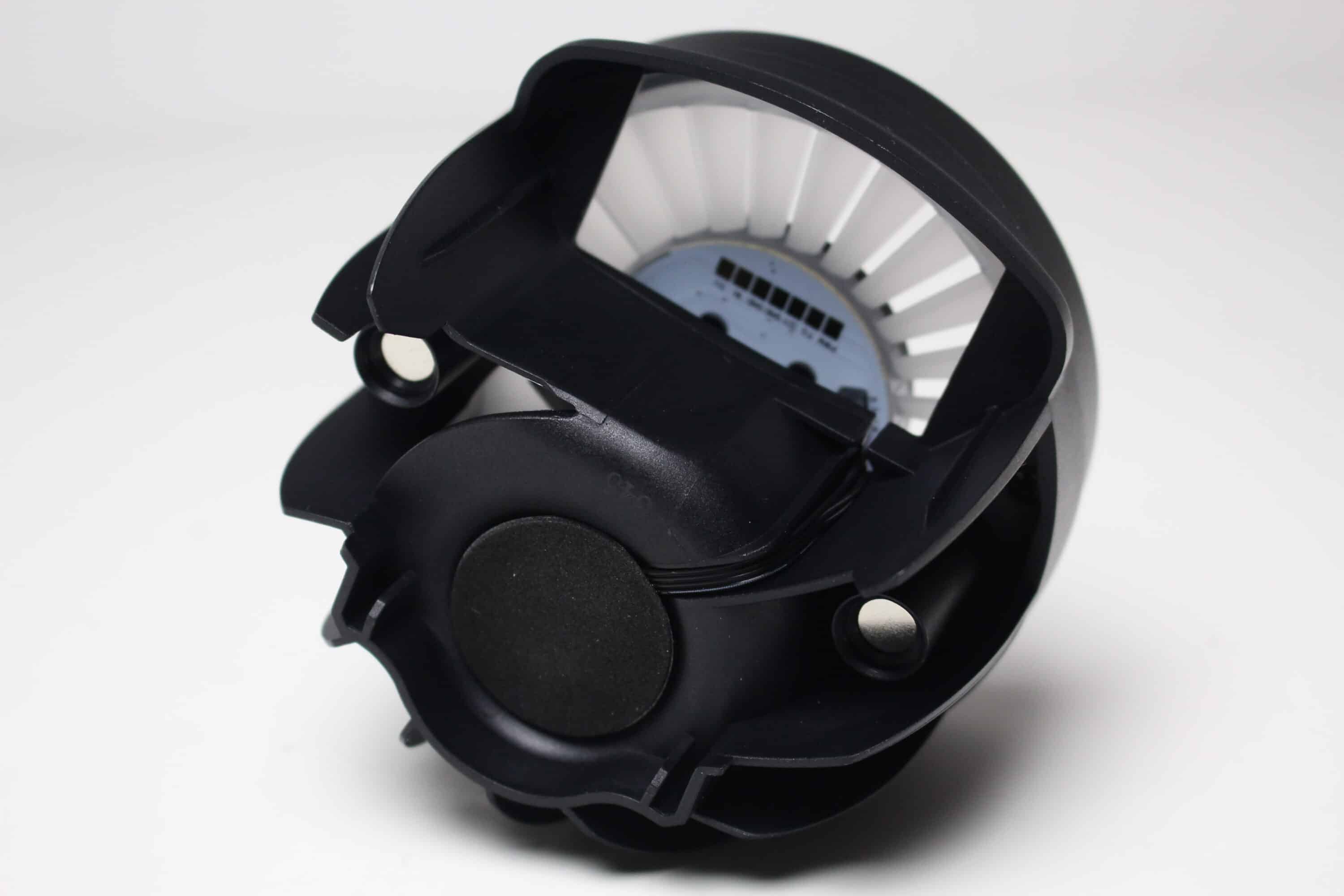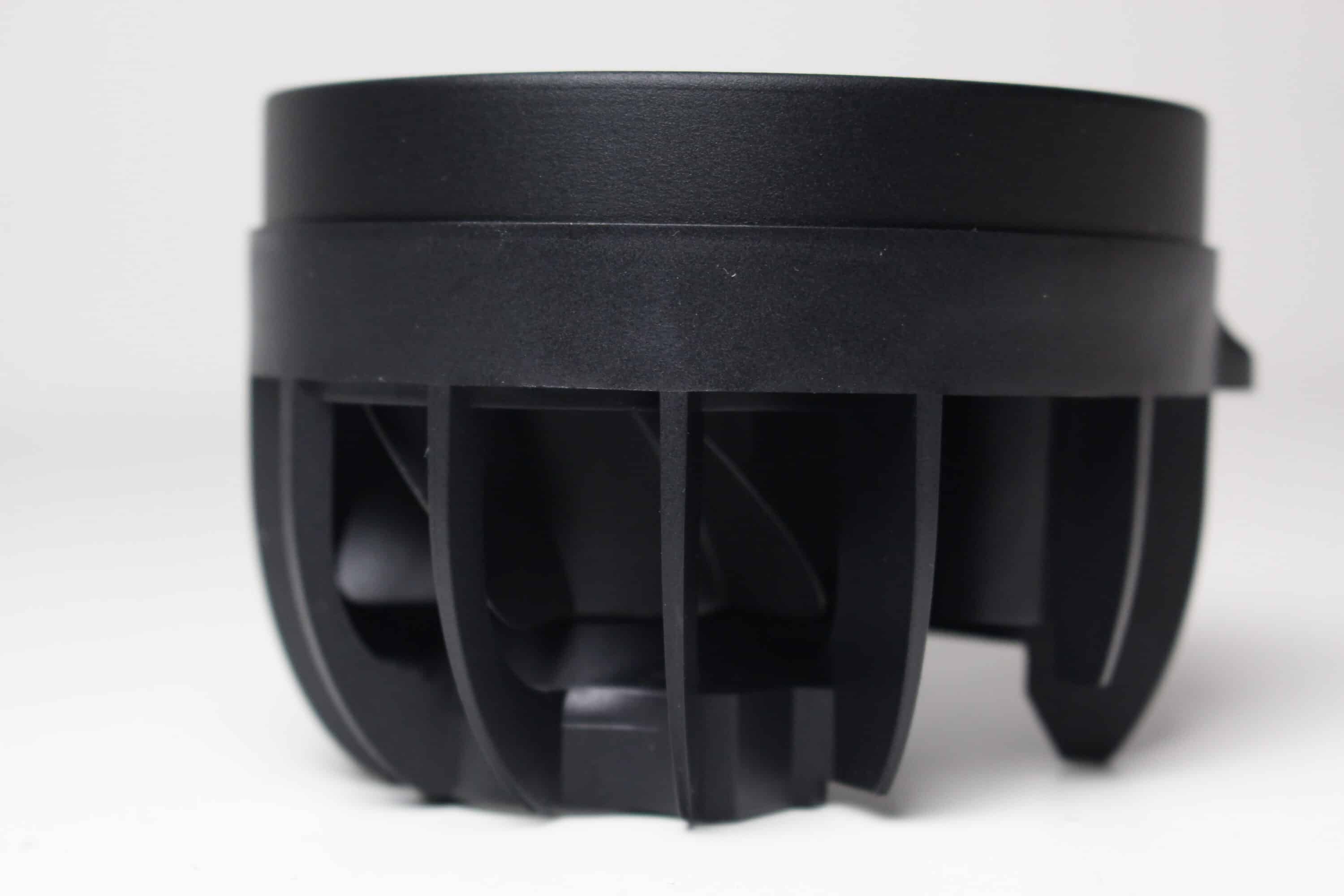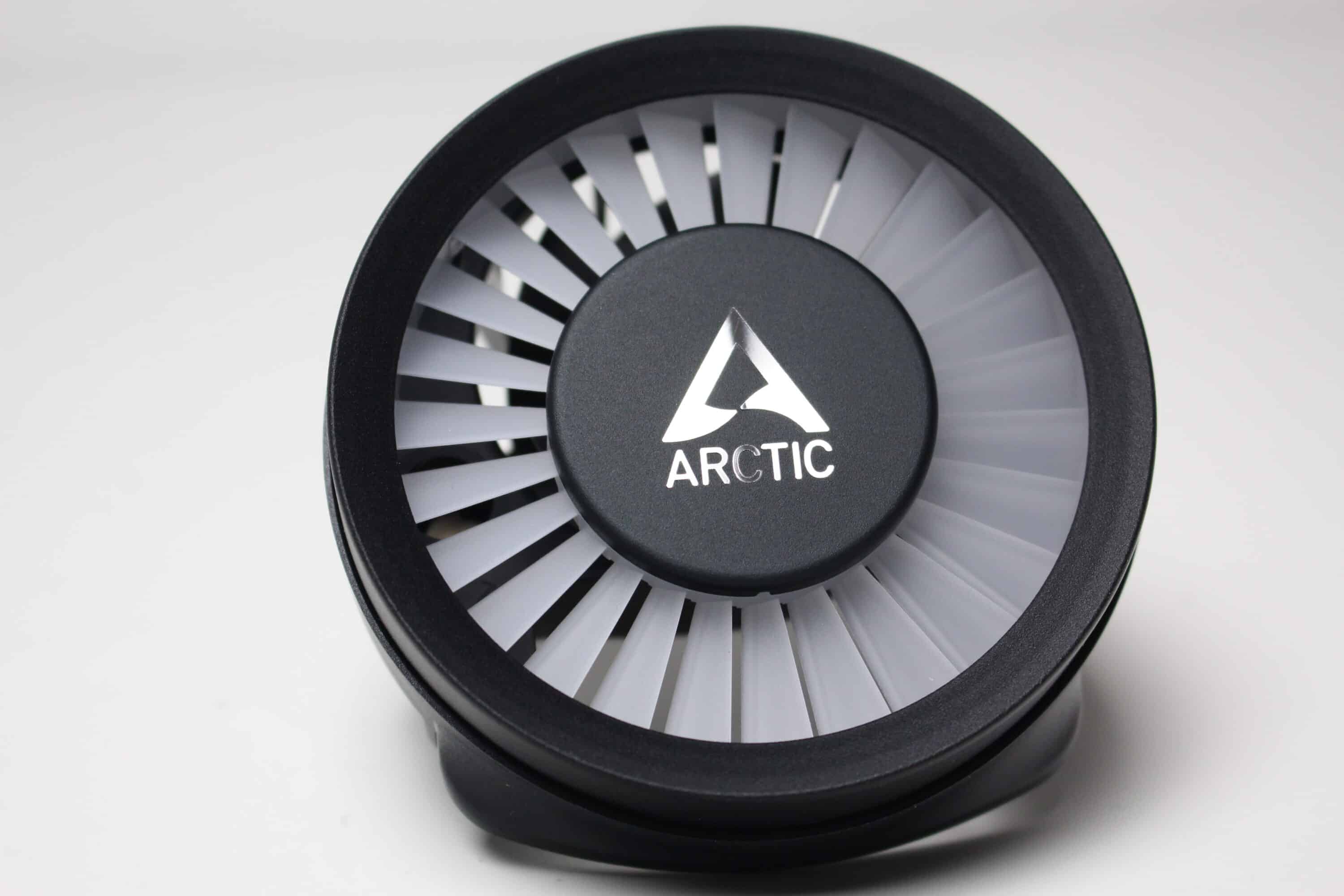 Ein komplett neues Design wurde auch dem Pumpenblock spendiert. Dieser ist nun deutlich unauffälliger gestaltet als noch bei der Liquid Freezer II. Der Kühlerblock selbst besteht zunächst aus einer Kupfer-Basisplatte, dem Montagebügel sowie der vertikal orientierten Pumpe. Darauf stülpt der Hersteller nun eine große, magnetische Kappe, die aufgrund der kreisrunden Optik und den transparenten bzw. angewinkelten Querstreben etwas an eine Turbine erinnert. Darin integriert Arctic einige RGB-Element sowie einen kleinen VRM-Lüfter. Dieser ist mit einem Durchmesser von 50 Millimetern nun aber etwas größer und zudem tiefer als noch beim Vorgänger.