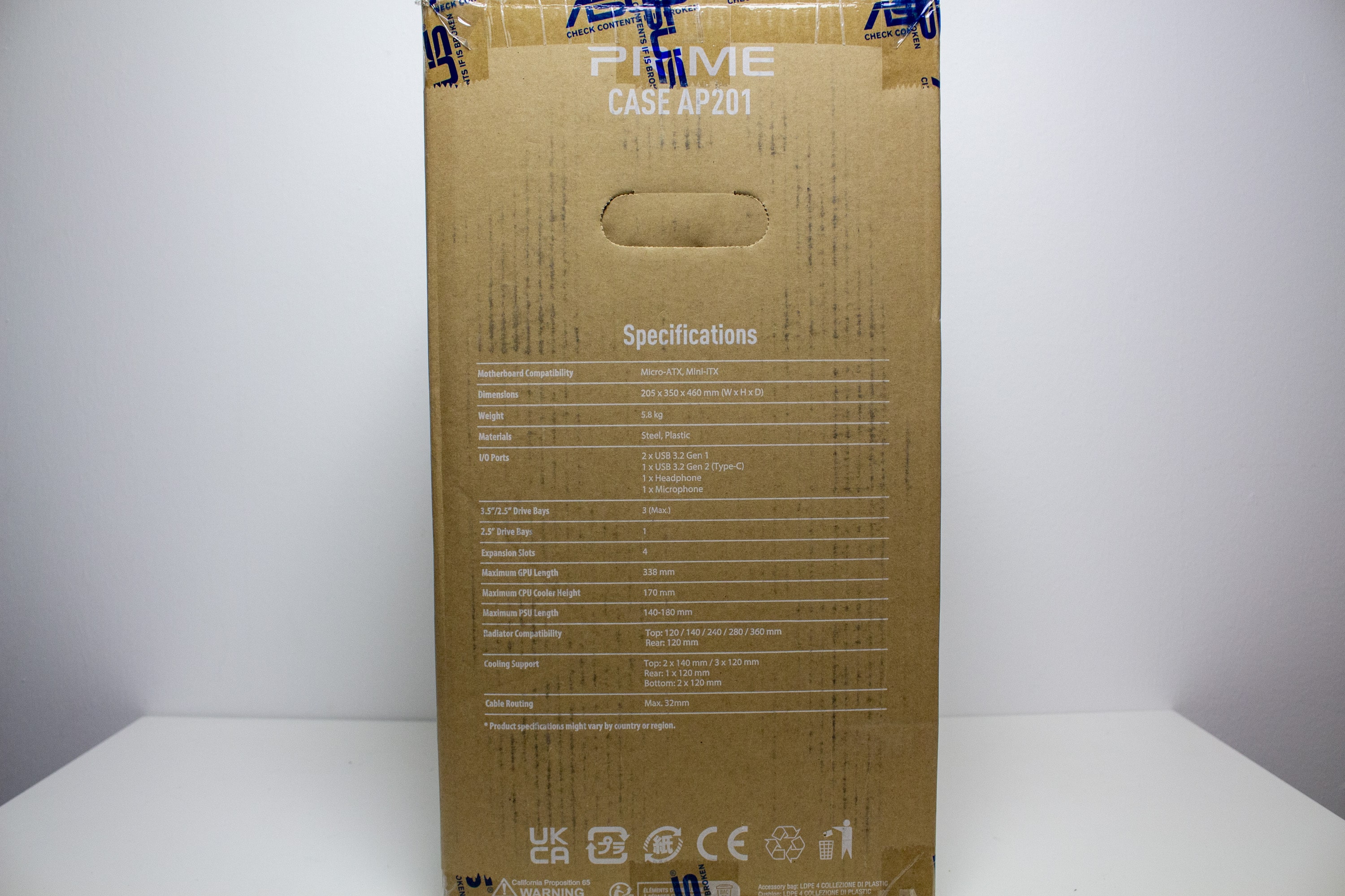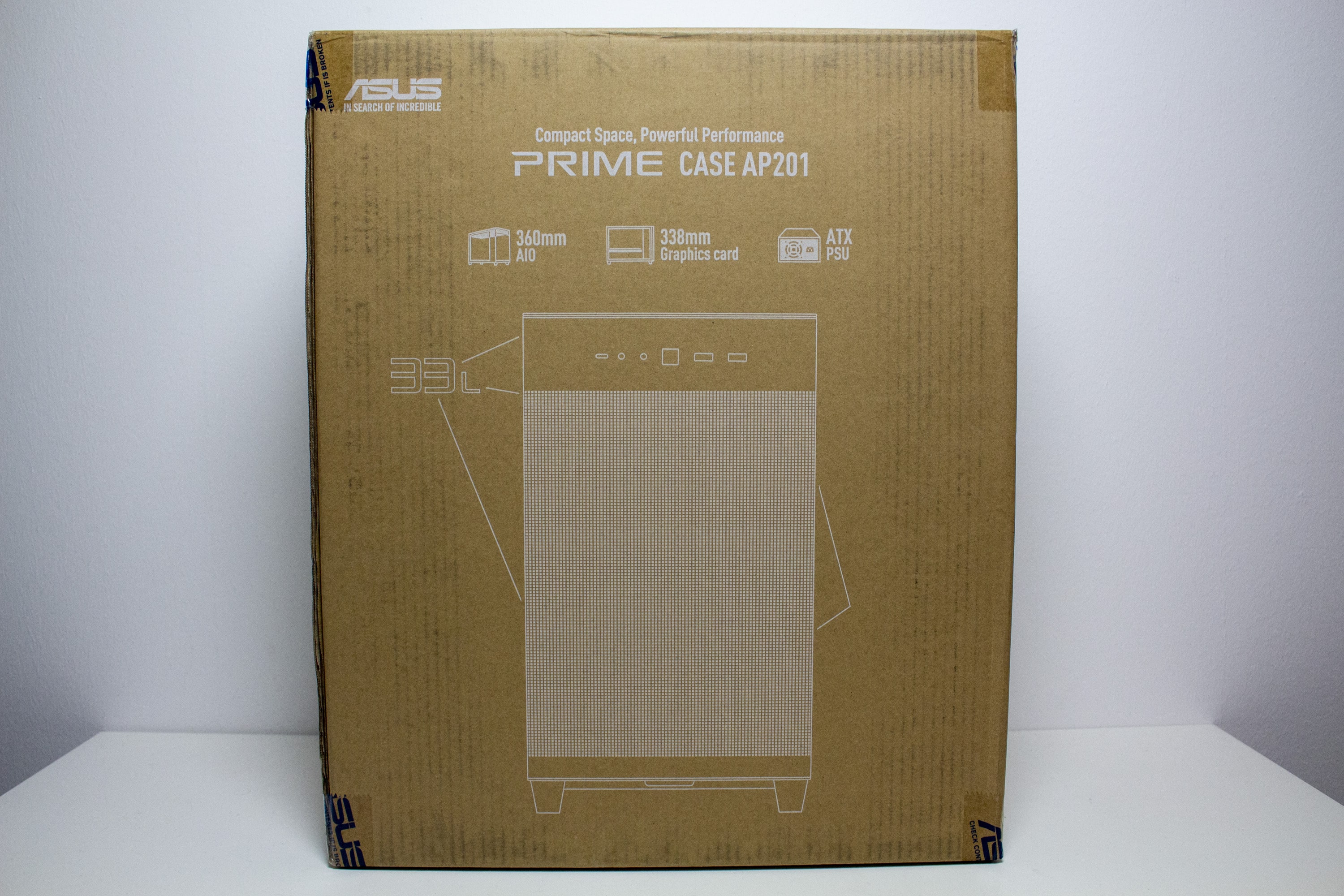 ASUS verpackt das Prime AP201 in einem Karton aus einfacher, brauner Pappe. Außerdem wurde die Kartonage außen mit weißer Farbe bedruckt und zeigt technische Zeichnungen des Mini-Towers sowie eine Tabelle mit den technischen Daten und eine Auflistung der wichtigsten Features. Innerhalb des Kartons hüllt ASUS das Prime AP201 in zwei Blöcke aus einem weichem Schaumstoff sowie in eine Folie aus Kunststoff.