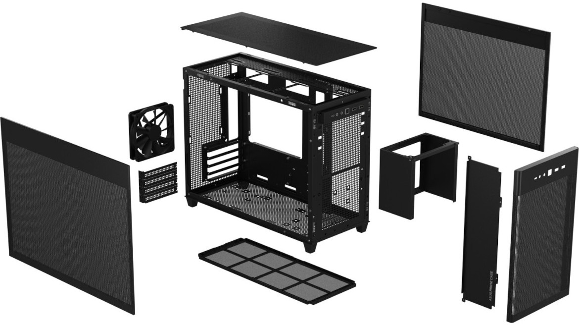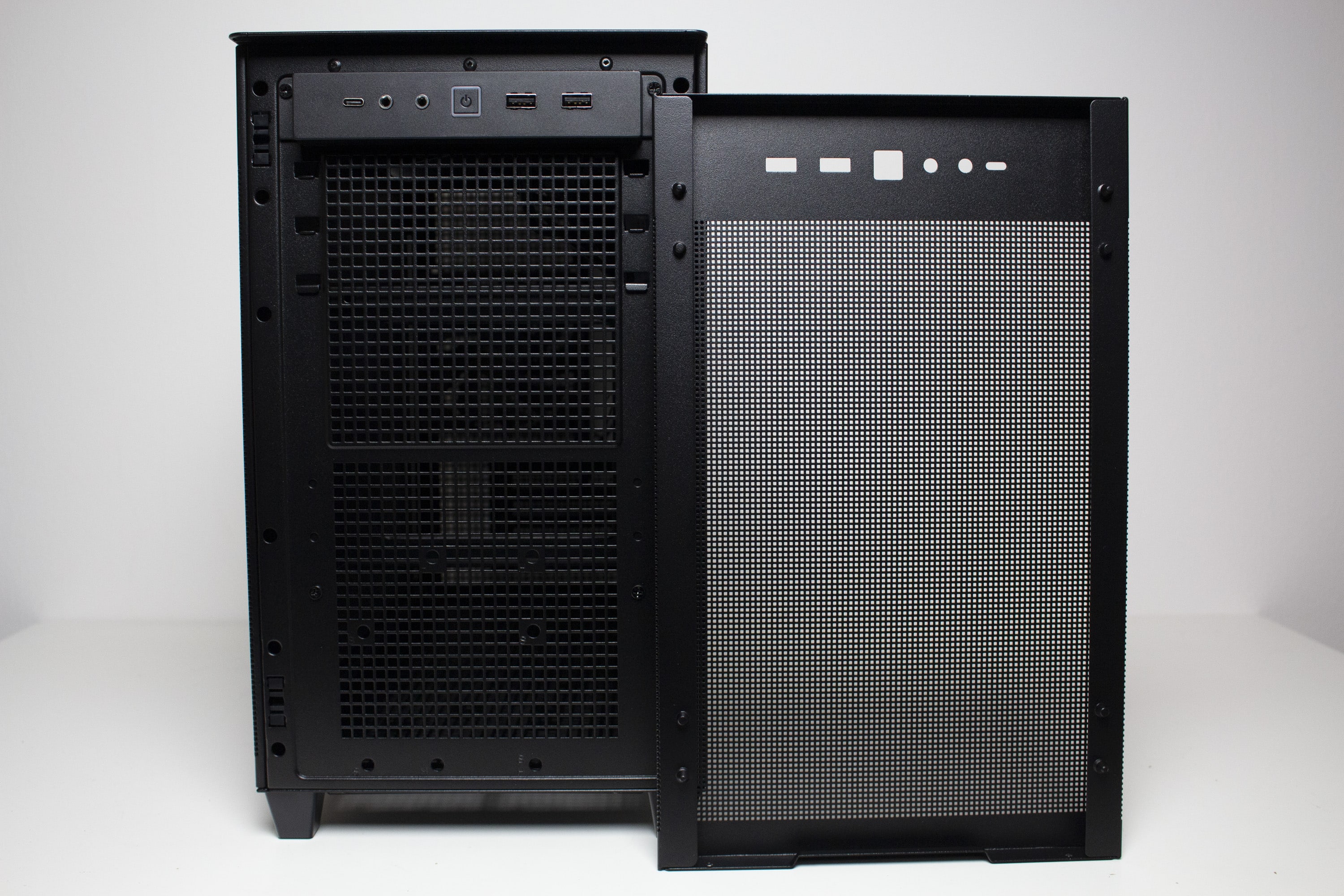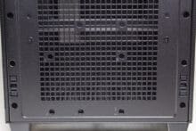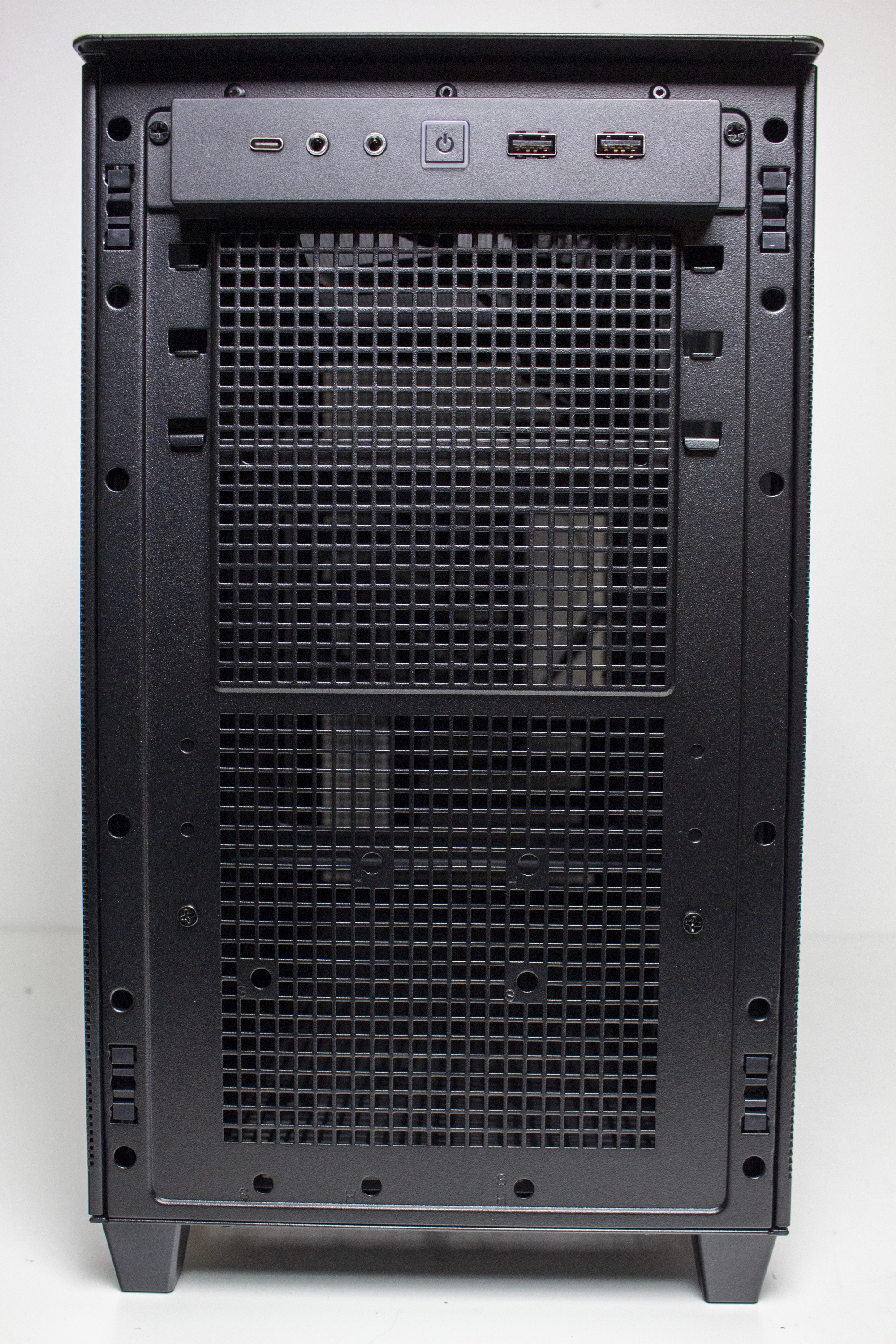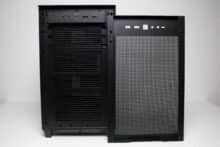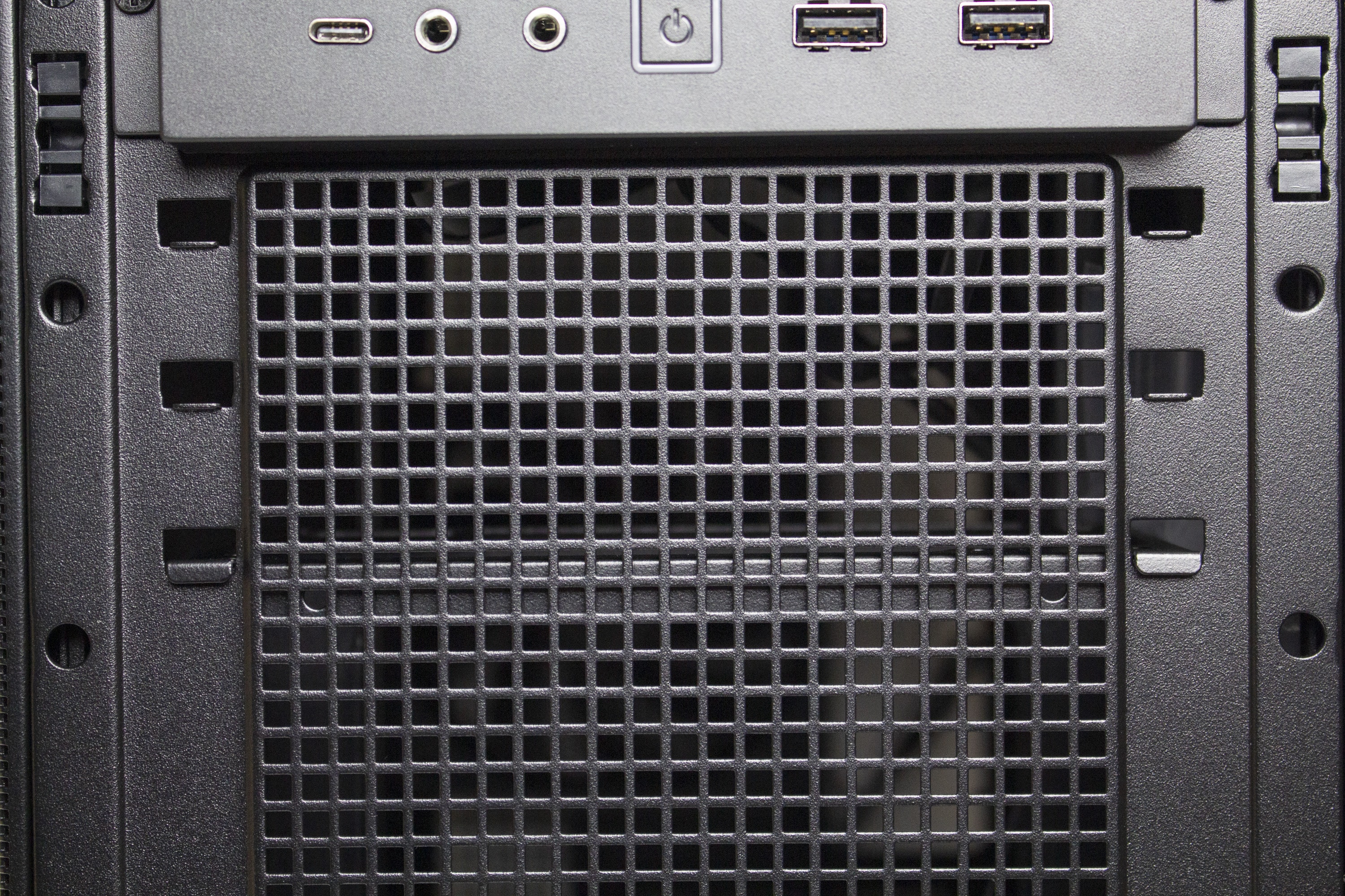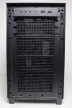 Die Frontpartie des ASUS Prime AP201 besteht vollständig aus einem Stahlblech, in welches zur besseren Belüftung des Innenraums eine feine Meshstruktur aus kleinen Quadraten gestanzt wurde. Lediglich der obere Teil, in dem sich das I/O-Panel befindet, wurde ausgespart. Letzteres verfügt über zwei USB-A 3.0 bzw. einen USB-C 3.1 Anschluss, zwei Buchsen für Kopfhörer bzw. ein Mikrofon sowie einen weiß beleuchteten Power-Button. Zum Entfernen der Frontplatte, die mit Push-Pins befestigt ist, muss man diese einfach nur abziehen und erhält den Blick auf den Montagerahmen für das Netzteil sowie Befestigungsplätze für Festplatten.