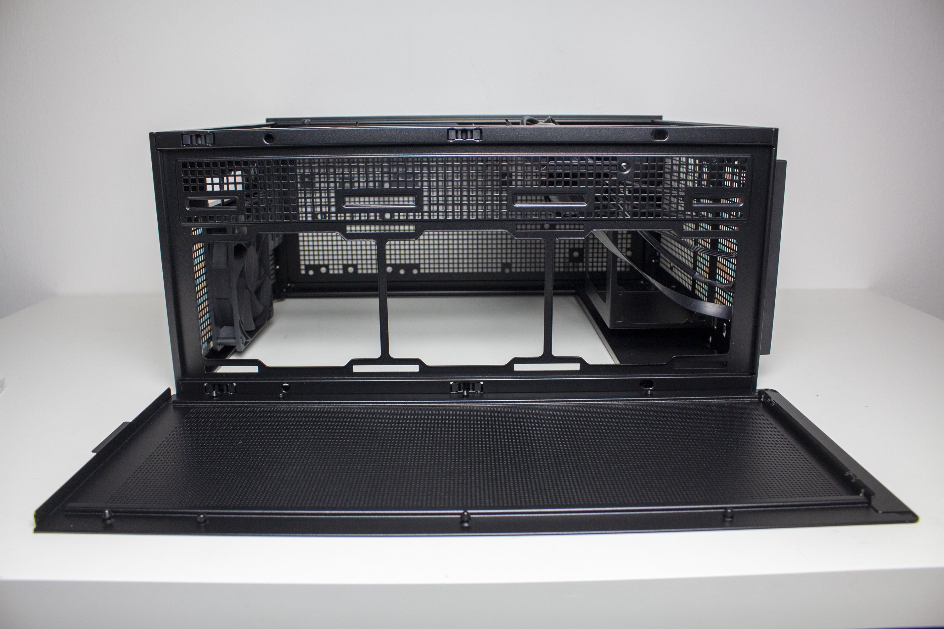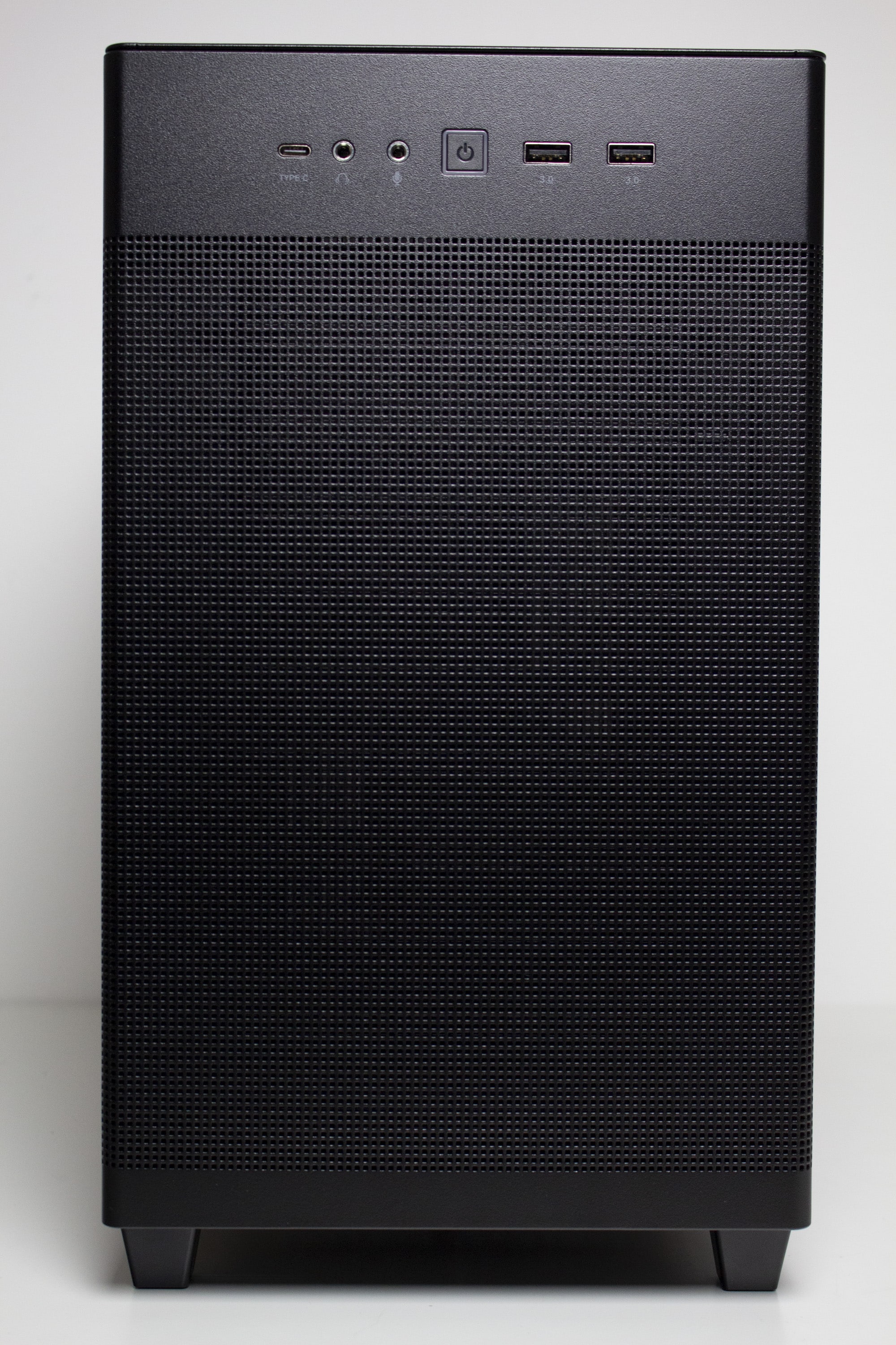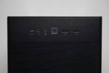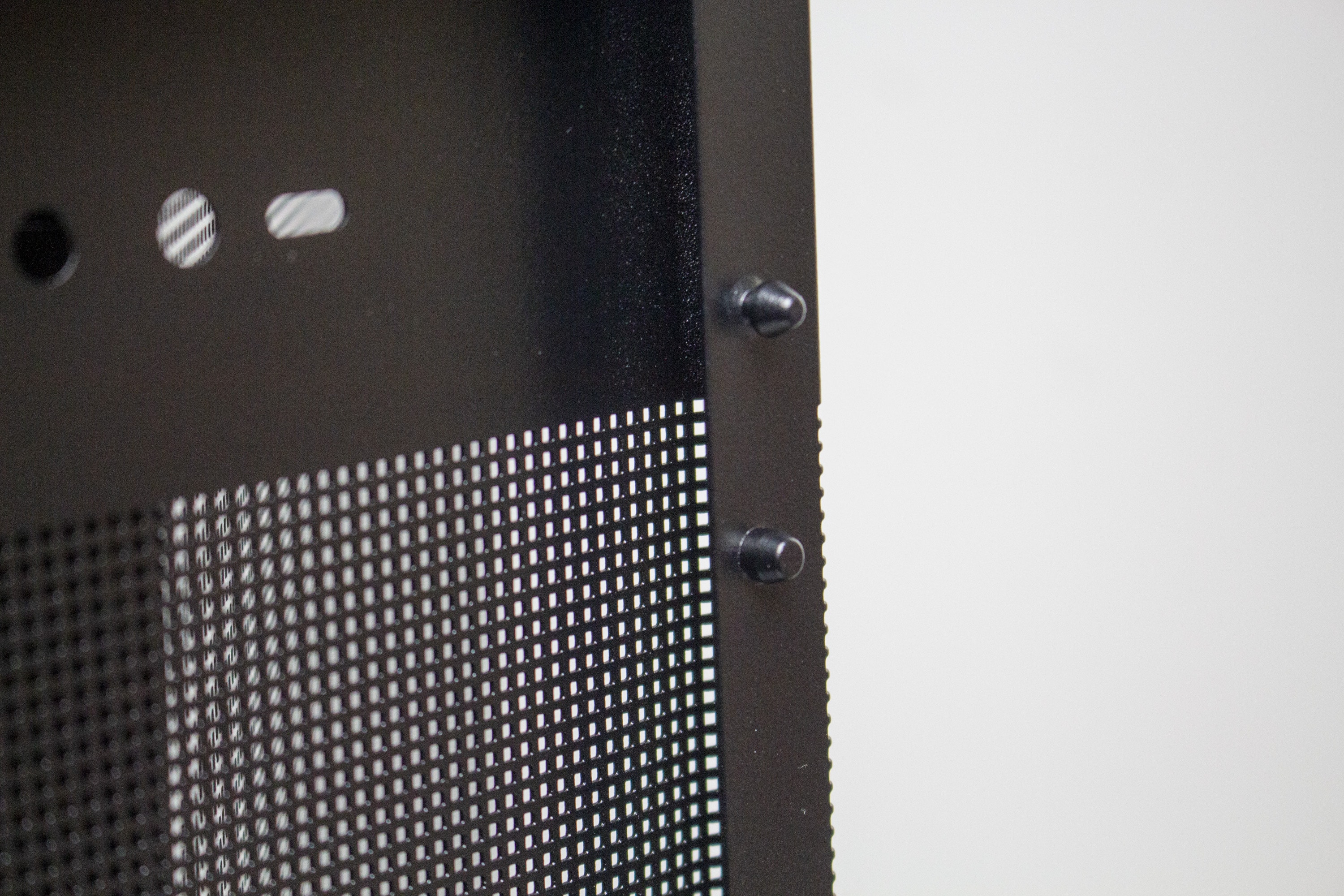 Die Frontpartie des ASUS Prime AP201 besteht vollständig aus einem Stahlblech, in welches zur besseren Belüftung des Innenraums eine feine Meshstruktur aus kleinen Quadraten gestanzt wurde. Lediglich der obere Teil, in dem sich das I/O-Panel befindet, wurde ausgespart. Letzteres verfügt über zwei USB-A 3.0 bzw. einen USB-C 3.1 Anschluss, zwei Buchsen für Kopfhörer bzw. ein Mikrofon sowie einen weiß beleuchteten Power-Button. Zum Entfernen der Frontplatte, die mit Push-Pins befestigt ist, muss man diese einfach nur abziehen und erhält den Blick auf den Montagerahmen für das Netzteil sowie Befestigungsplätze für Festplatten.
