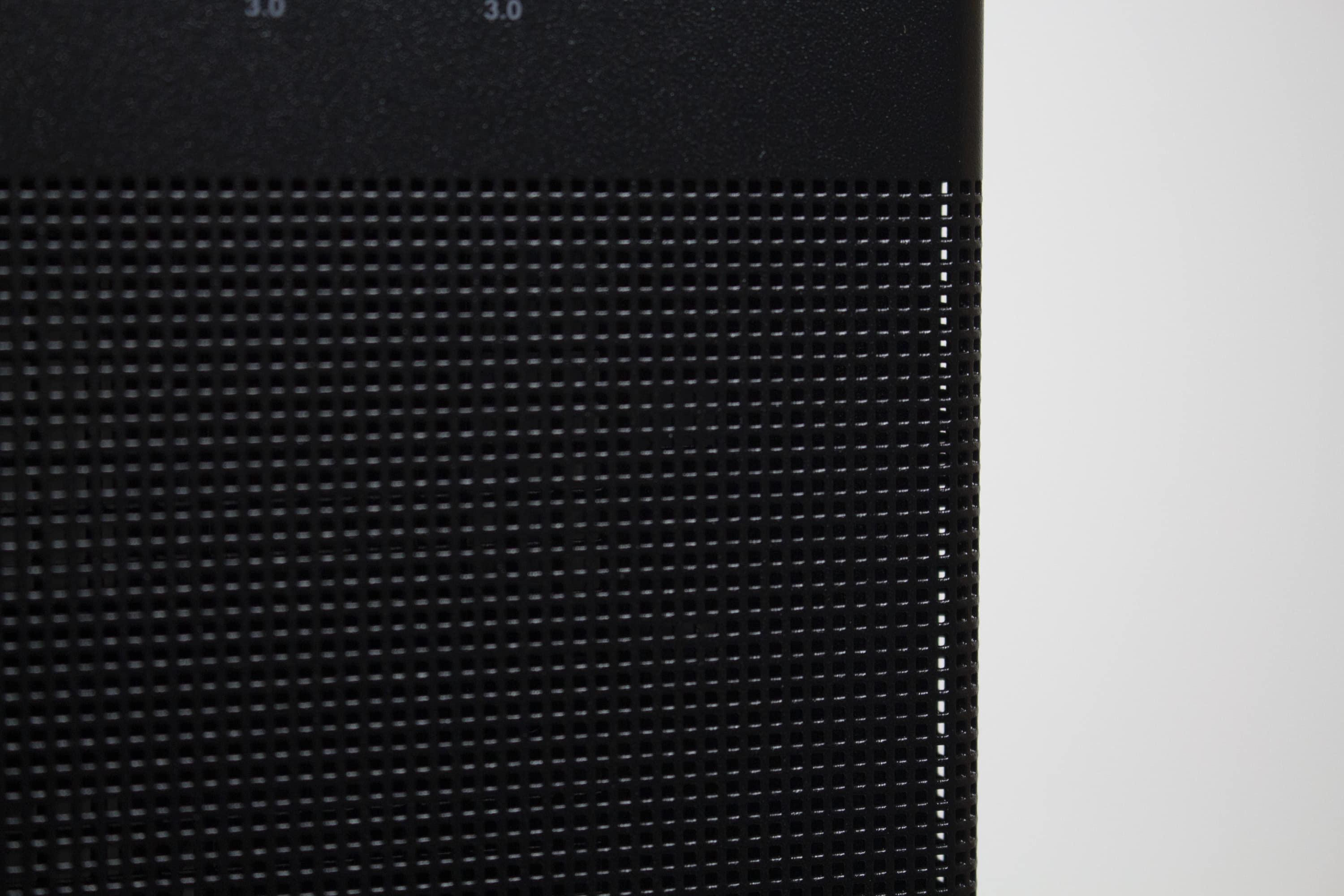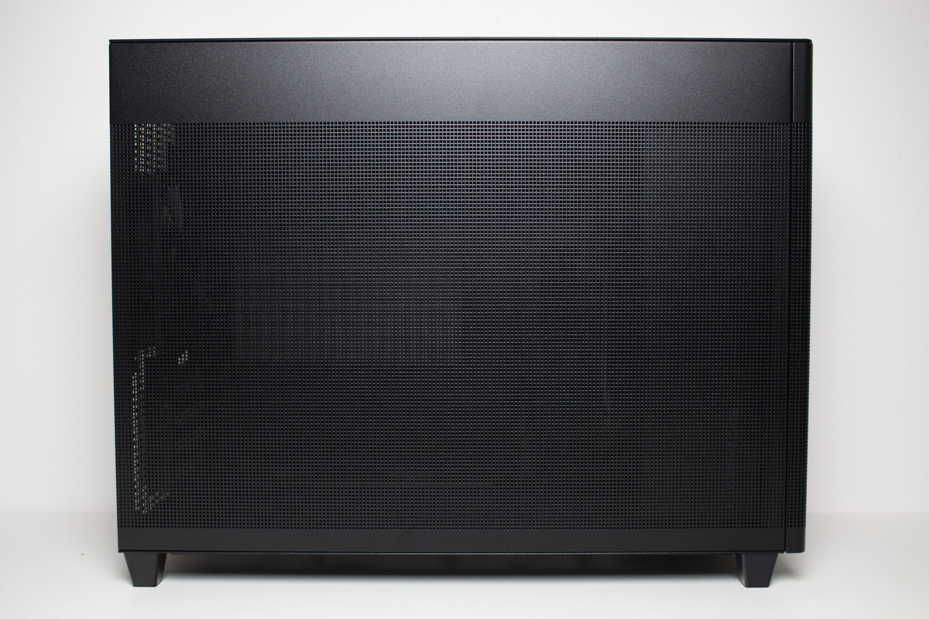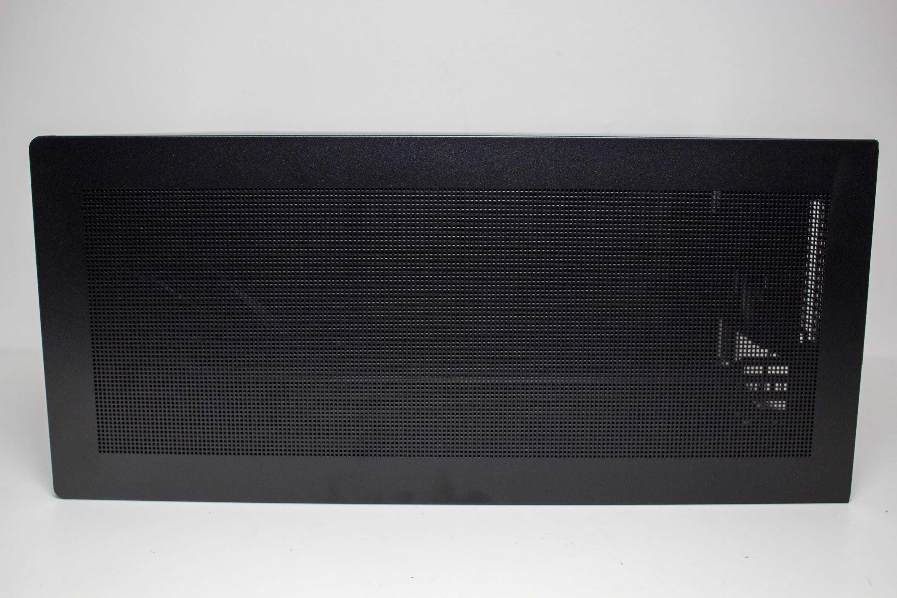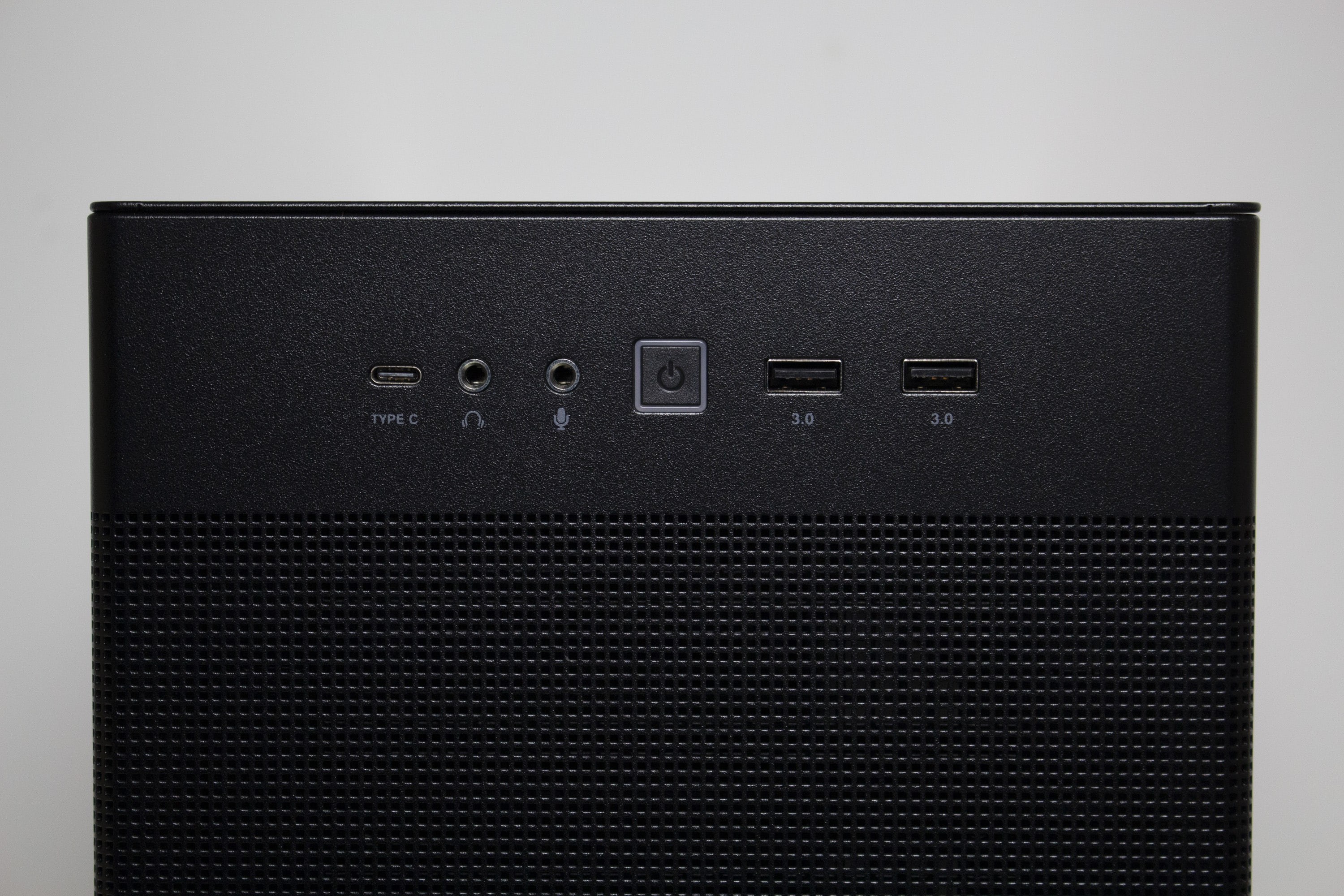 Die Frontpartie des ASUS Prime AP201 besteht vollständig aus einem Stahlblech, in welches zur besseren Belüftung des Innenraums eine feine Meshstruktur aus kleinen Quadraten gestanzt wurde. Lediglich der obere Teil, in dem sich das I/O-Panel befindet, wurde ausgespart. Letzteres verfügt über zwei USB-A 3.0 bzw. einen USB-C 3.1 Anschluss, zwei Buchsen für Kopfhörer bzw. ein Mikrofon sowie einen weiß beleuchteten Power-Button. Zum Entfernen der Frontplatte, die mit Push-Pins befestigt ist, muss man diese einfach nur abziehen und erhält den Blick auf den Montagerahmen für das Netzteil sowie Befestigungsplätze für Festplatten.
