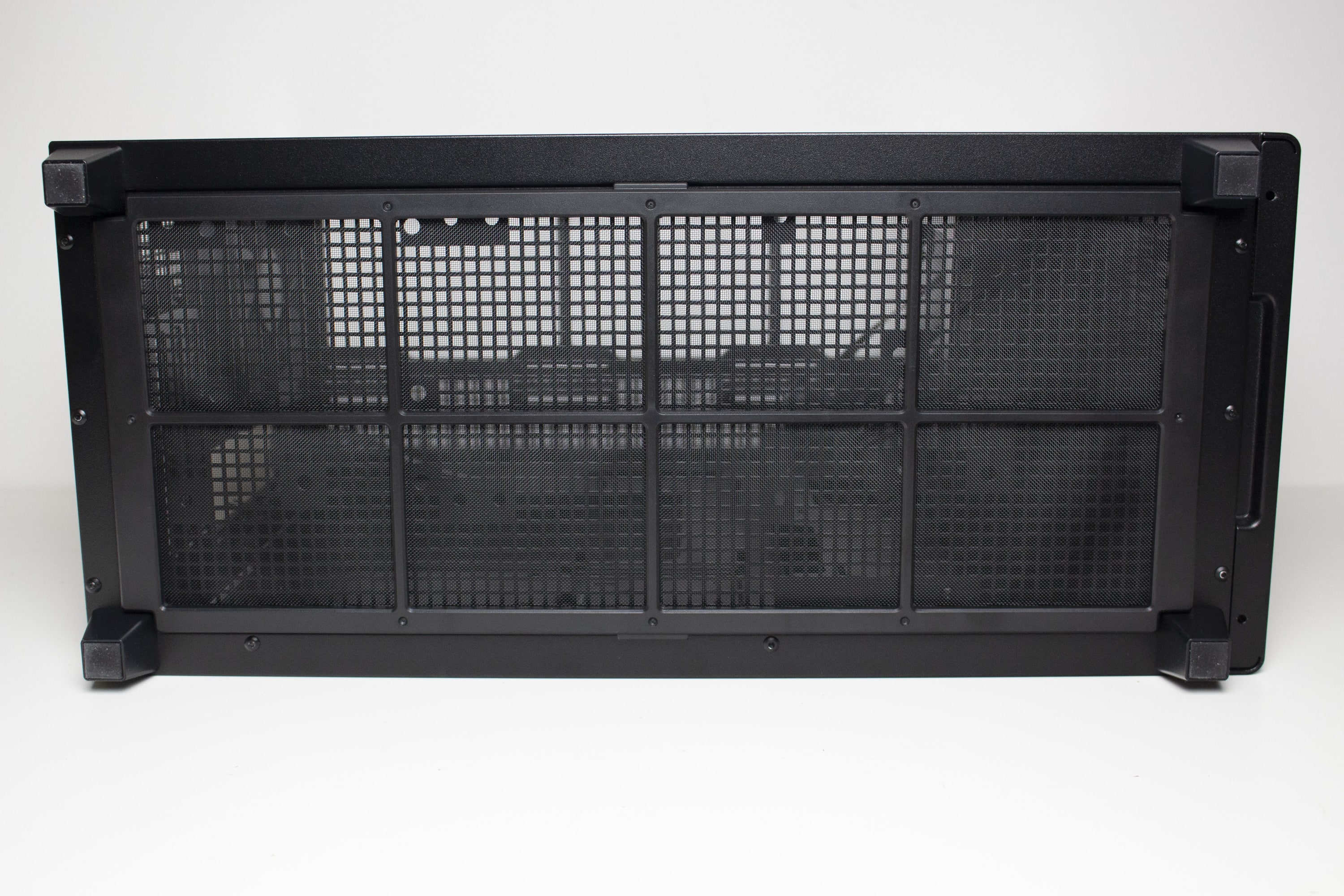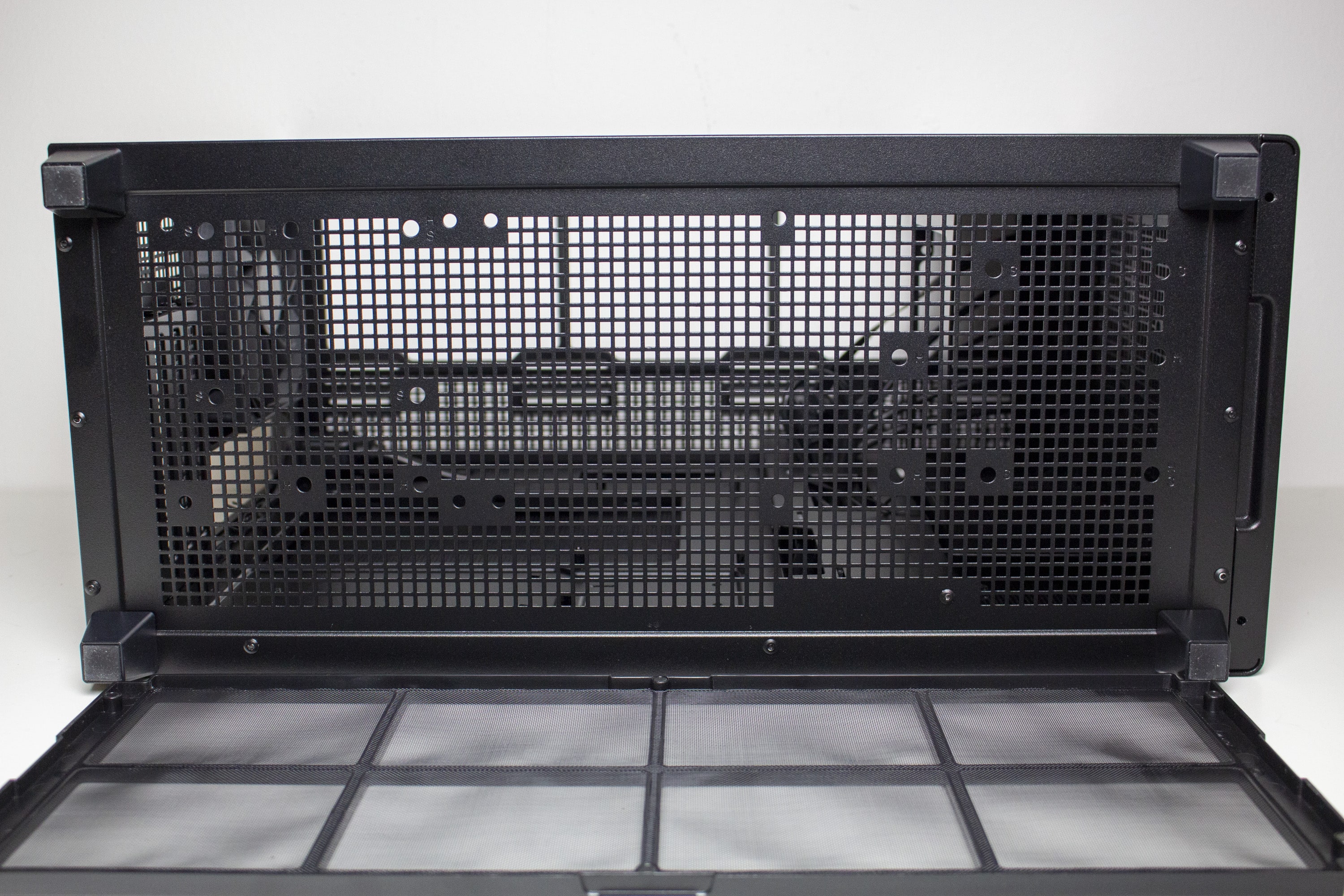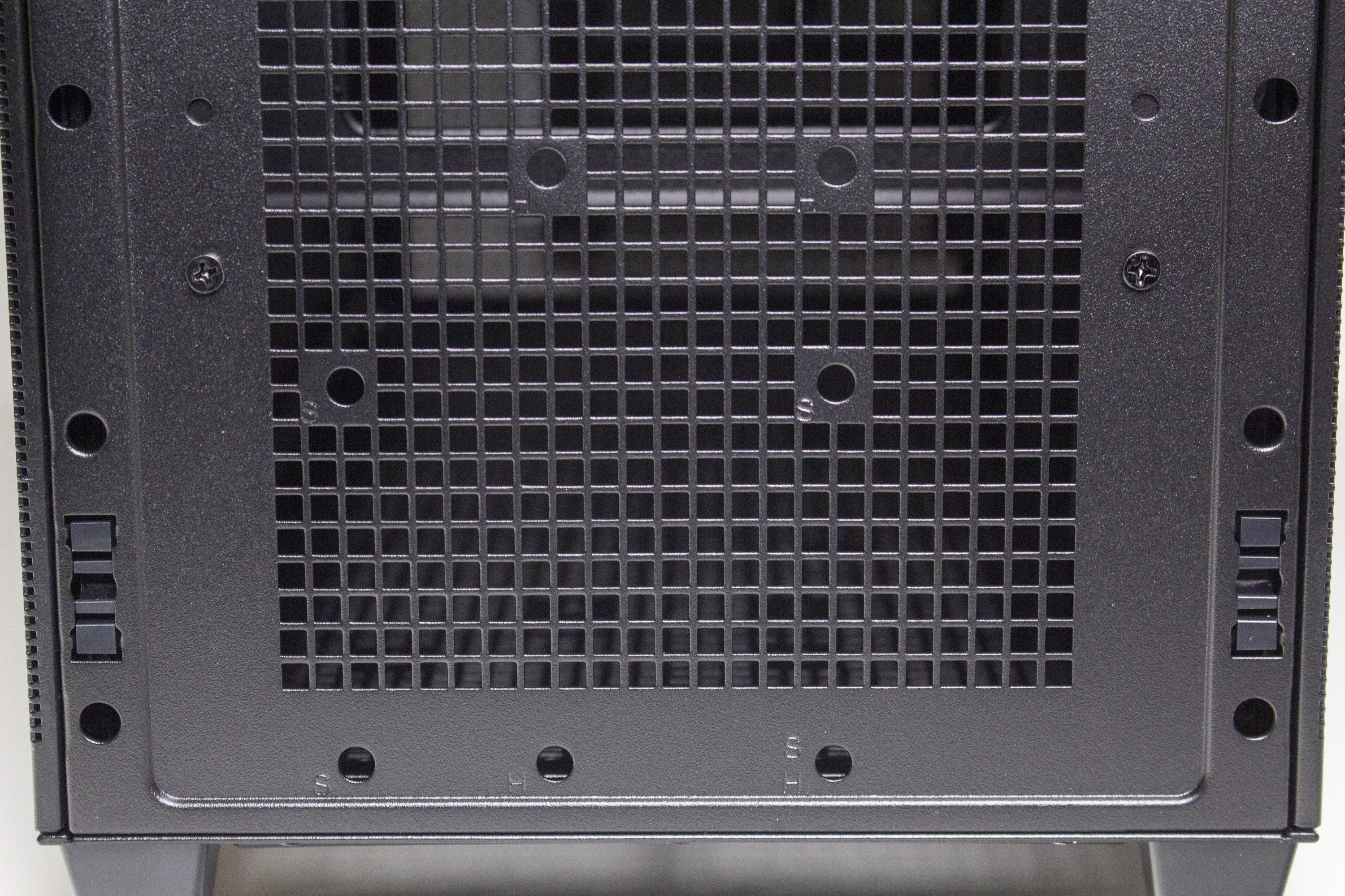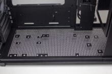 An der Unterseite treffen wir auf den einzigen Staubfilter des ASUS Prime AP201. Dafür ist dieser sehr groß, stabil und besteht aus einem feinen Gewebe. Zudem ist dieser magnetisch und kann deshalb leicht für eine Reinigung entfernt werden. Hinter dem Staubfilter versteckt sich eine weitere große Belüftungsöffnung, welche über zahlreiche Montagepunkte für Lüfter oder Festplatten verfügt.