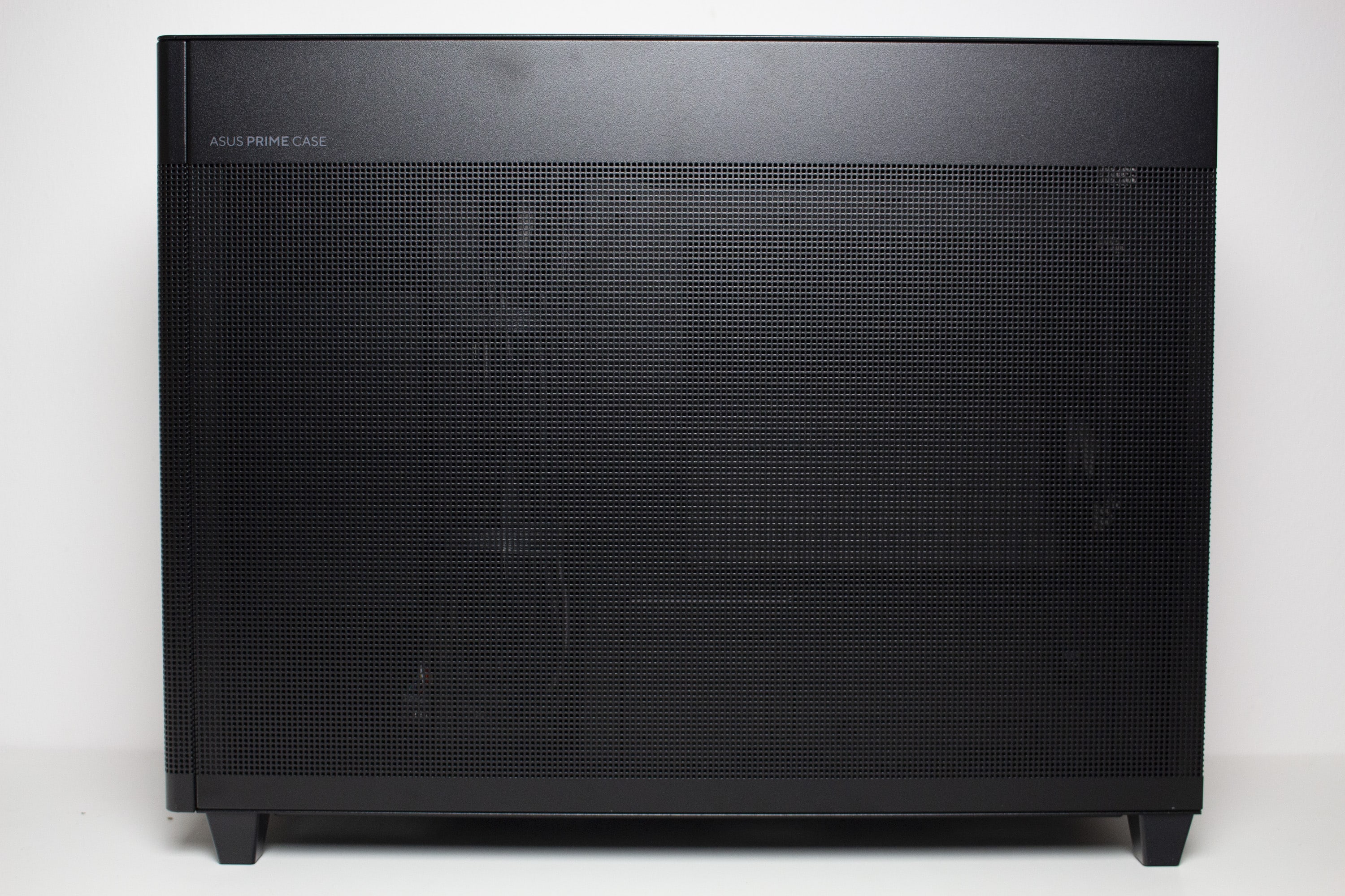 Anders als bei vielen bisherigen Gehäusen, setzt ASUS beim Prime AP201 definitiv auf Understatement und ein schlichtes, zeitloses Design. Das ist auch daran zu erkennen, dass die Version mit Tempered Glass Seitenteil circa erst ein halbes Jahr später vorgestellt wurde. Die von uns getestete Version setzt aber weiterhin auf eine komplette Meshstruktur. Aber beginnen wir wie immer an der Vorderseite.