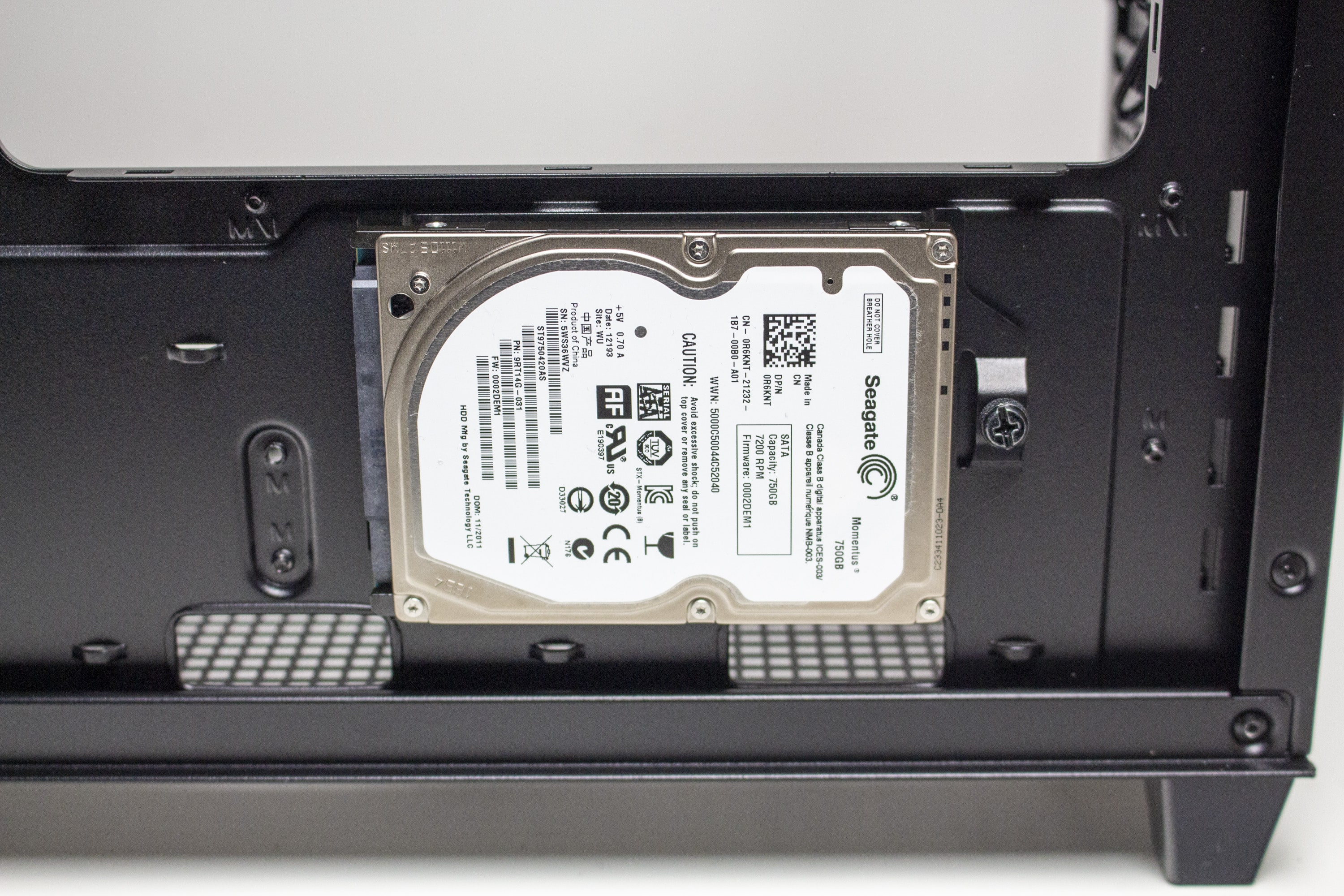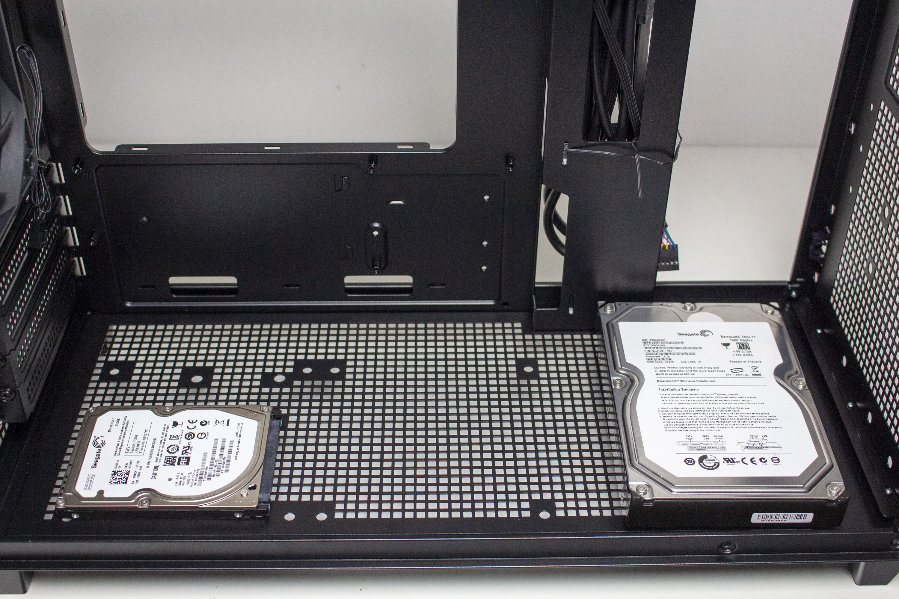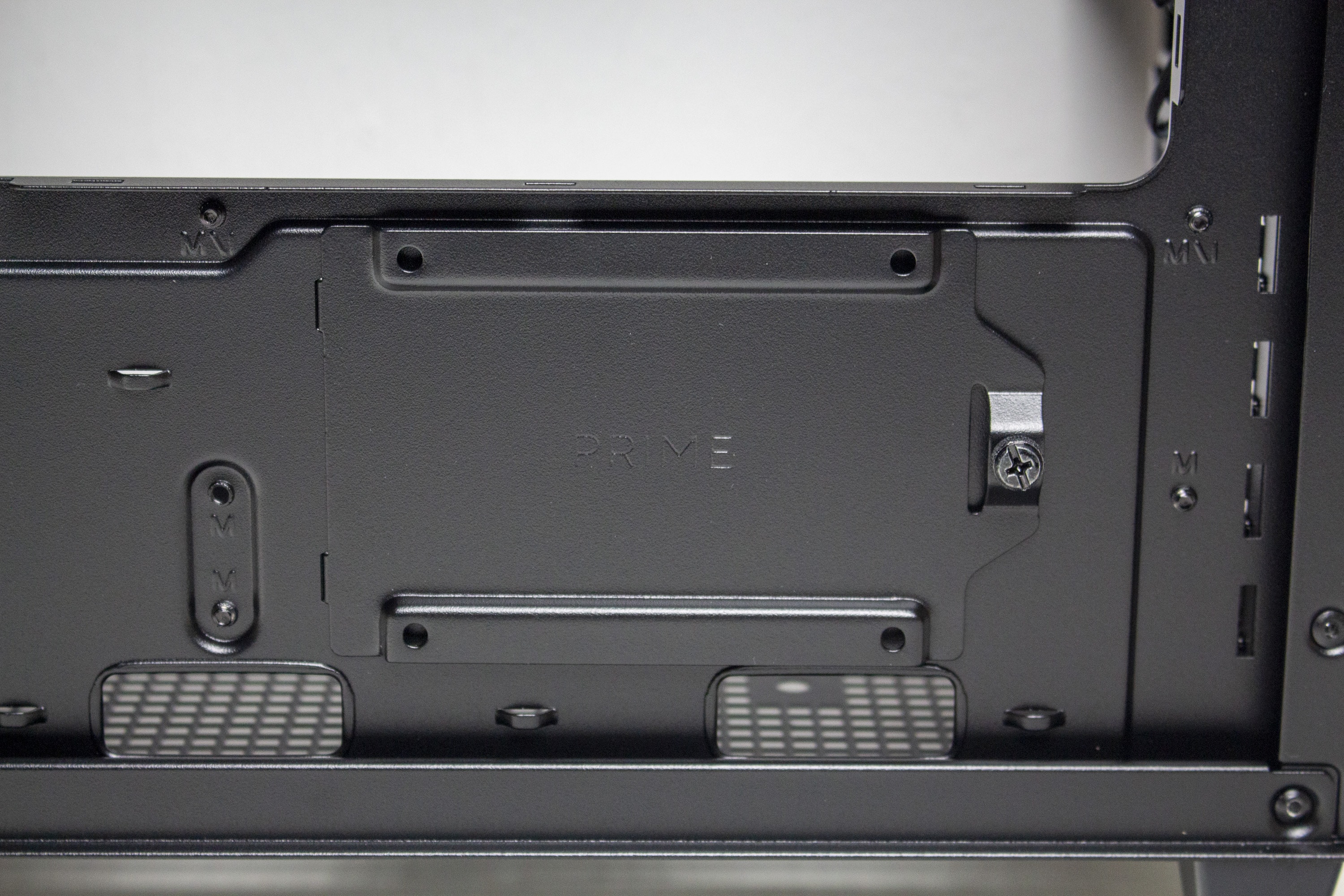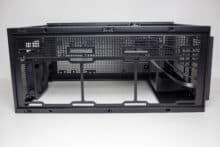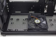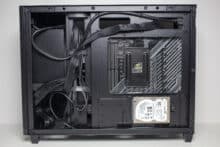 In Bezug auf Datenträger kann das Prime AP201 gleichzeitig drei 3,5″- bzw. 2,5″- und eine weitere 2,5″-Festplatte aufnehmen. Letztere findet an der Rückseite des Mainboard-Trays auf einem Stahlrahmen Platz. Die Montage erfordert Werkzeug. Die anderen drei Datenträger können am Boden oder im unteren Bereich der Front platziert werden. Auch hier wird Werkzeug benötigt. Montiert man die Datenträger im Boden verliert man jedoch die Möglichkeit zur Montage der zwei 120-mm-Lüfter.