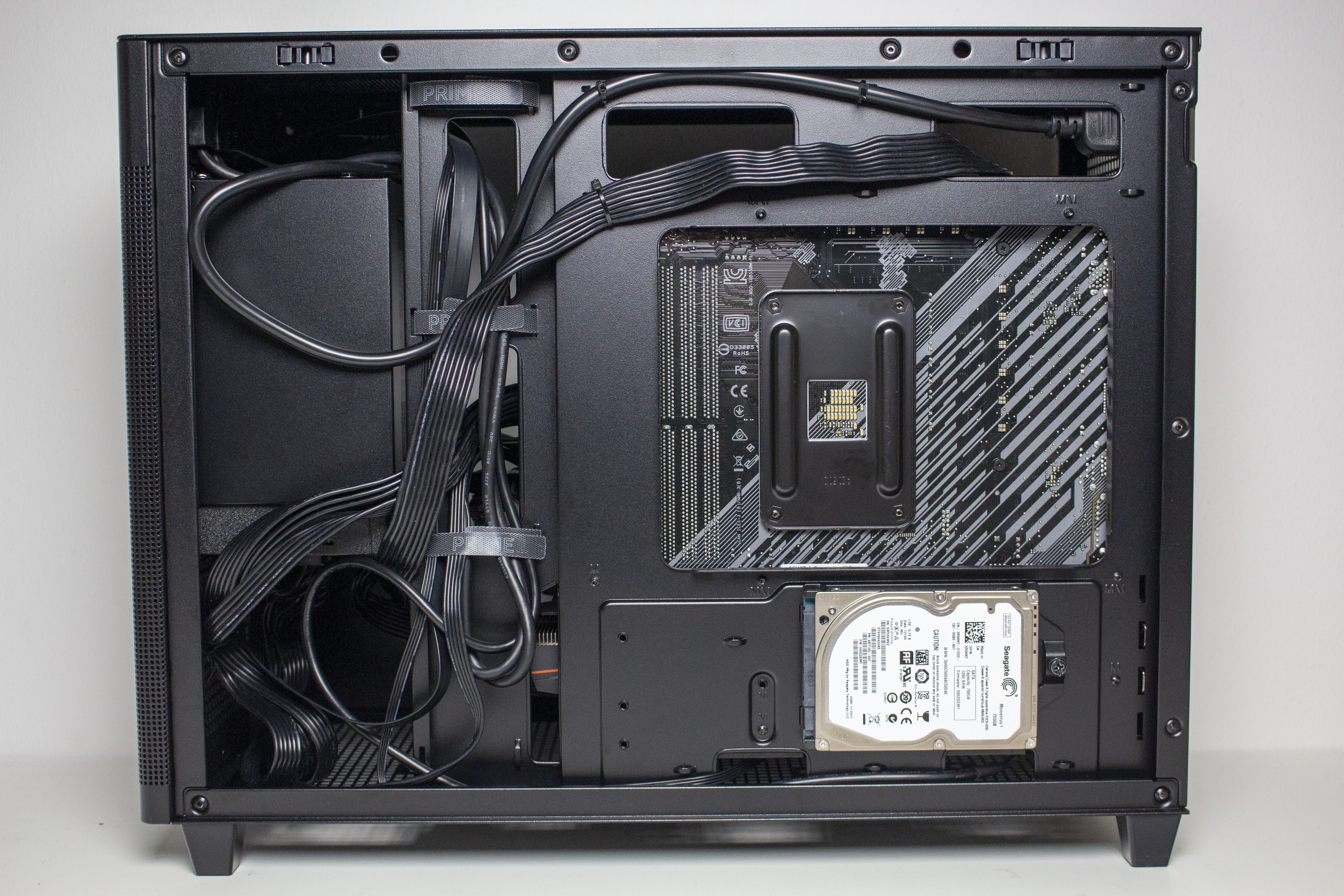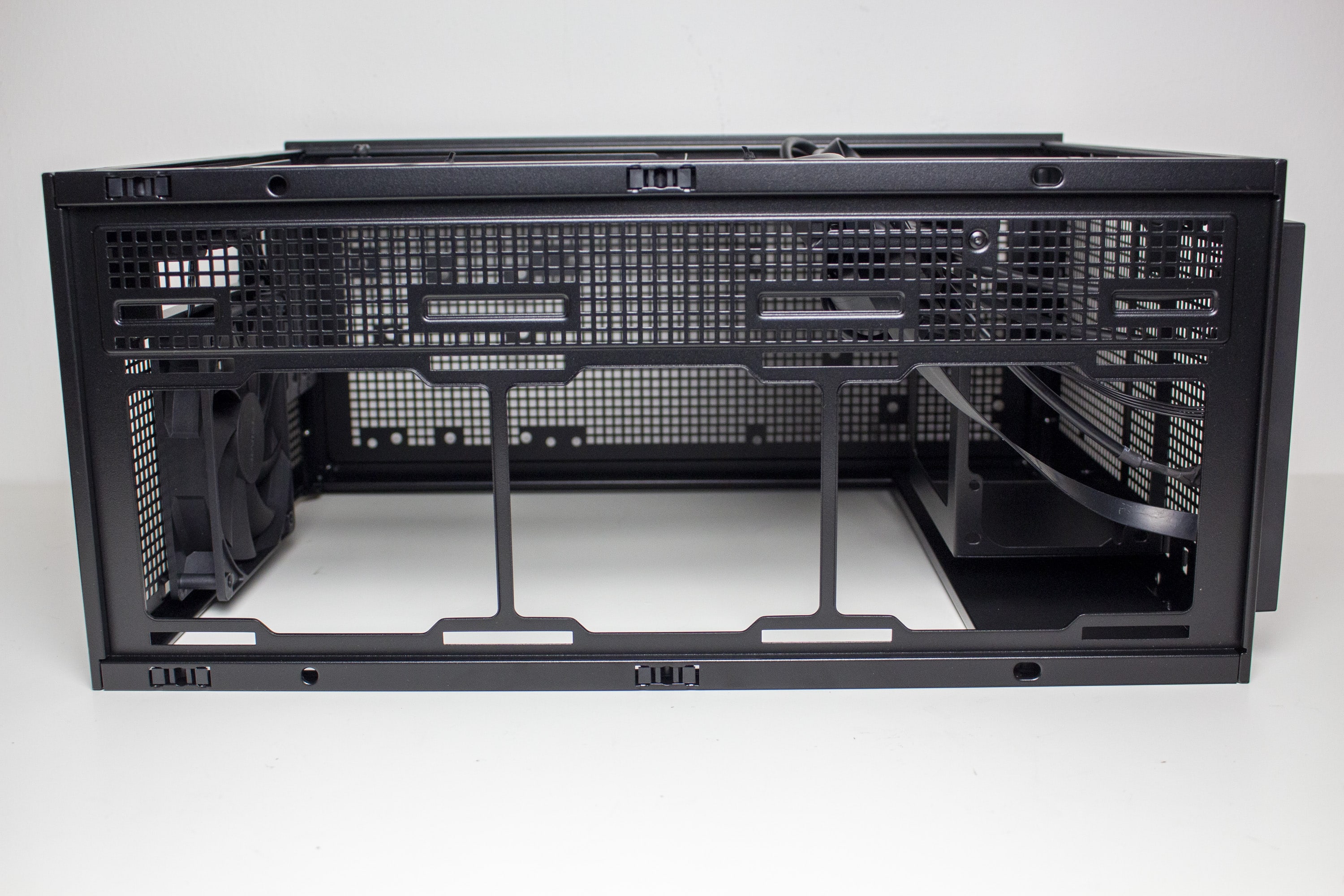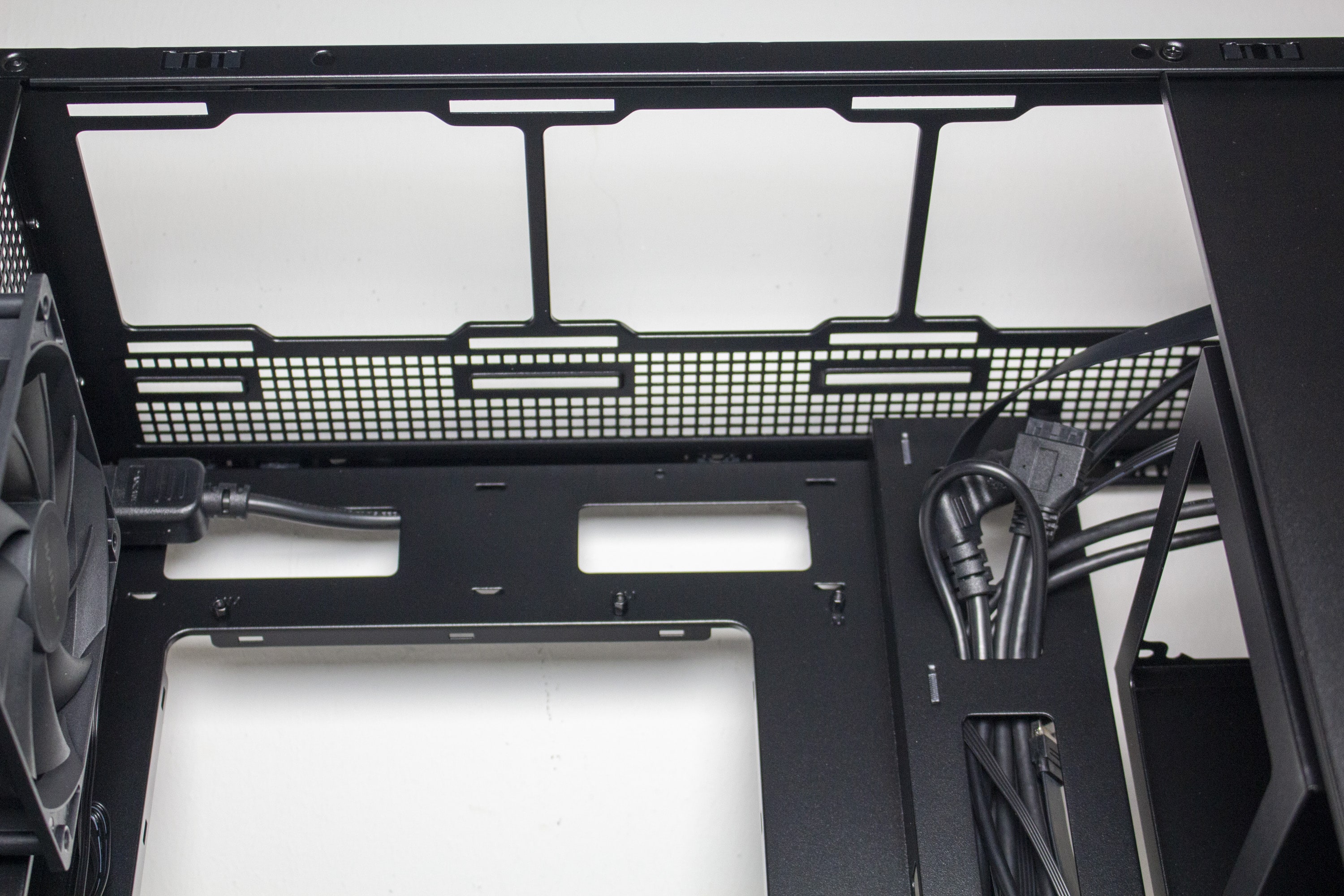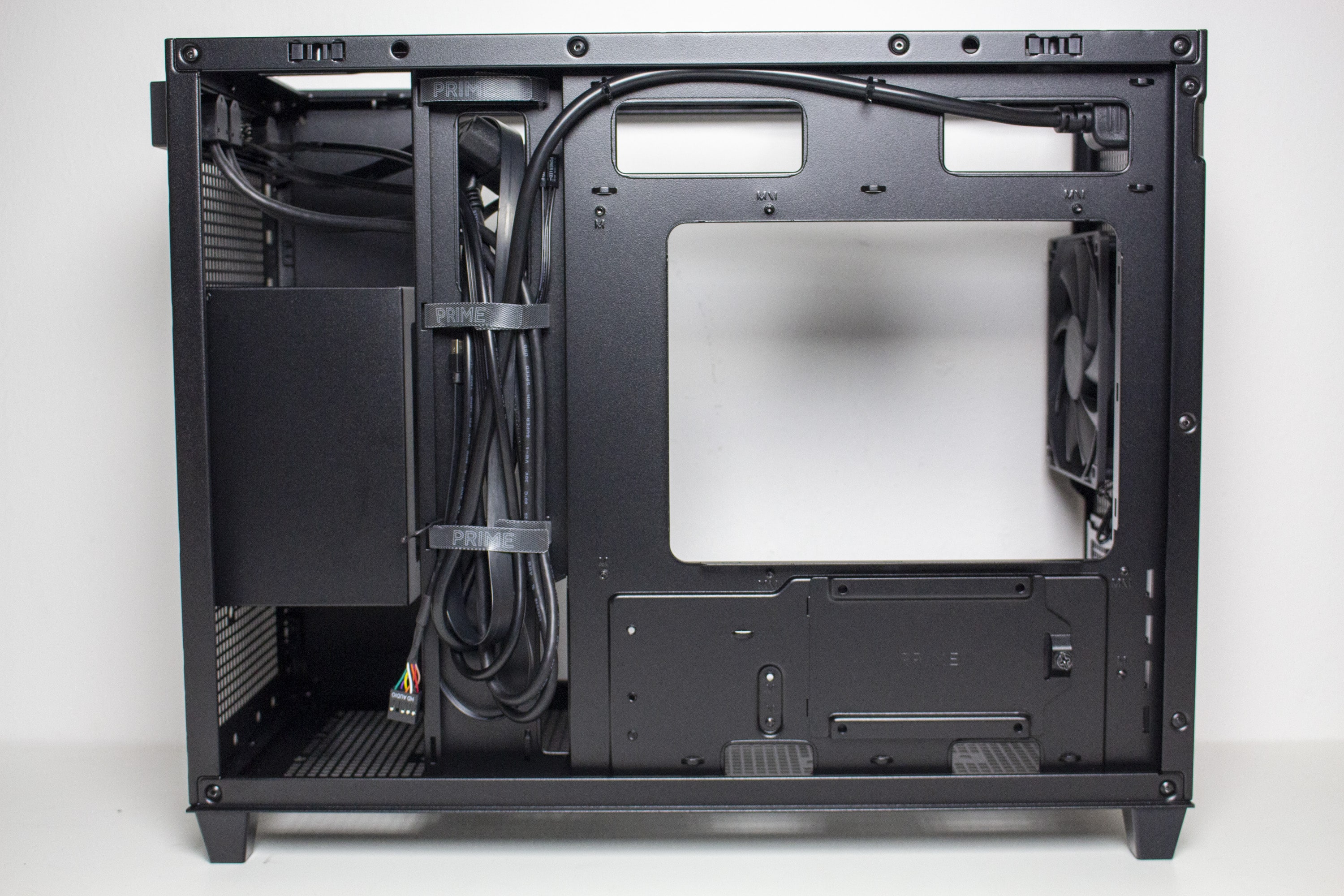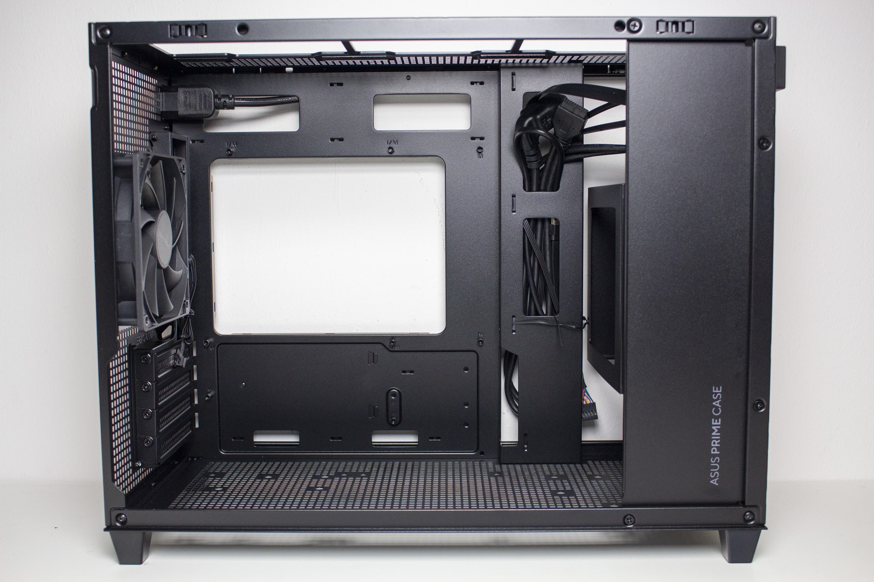 Im Innenraum des Prime AP201 zeigt sich ein völlig anderes Layout als man bei einem Mini-Tower erwarten würde. So setzt ASUS auf eine einzige große Hauptkammer in welcher alle wichtigen Komponenten platziert werden müssen. Der Mainboardschlitten ist, mit Ausnahme des Kabelkanals, plan gestaltet und verfügt über sieben nicht gummierte Öffnungen zum Verlegen der Netzeilkabel. Oberhalb und unterhalb des Mainboards gibt es ausreichend Befestigungsmöglichkeiten für weitere Gehäuselüfter. Das Kabel der Kaltgerätebuchse am Heck des Mini-Towers wurde hinter dem Mainboard-Tray auf die rechte Seite geführt.
