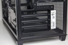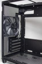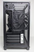 An der Rückseite lässt sich zum ersten Mal wirklich erkennen, dass ASUS beim Prime AP201 im Inneren auf ein eher untypisches Layout setzt. So lassen sich hier zwar vier wiederverwendbare PCI-Slotblenden im unteren Bereich und der darüber der montierte 120-mm-Lüfter erkennen, was jedoch fehlt ist die Öffnung für das Netzteil. Stattdessen sehen wir nur eine Buchse für das Kaltgerätekabel und viel Platz bzw. ein großes Belüftungsgitter oberhalb des Lüfters.