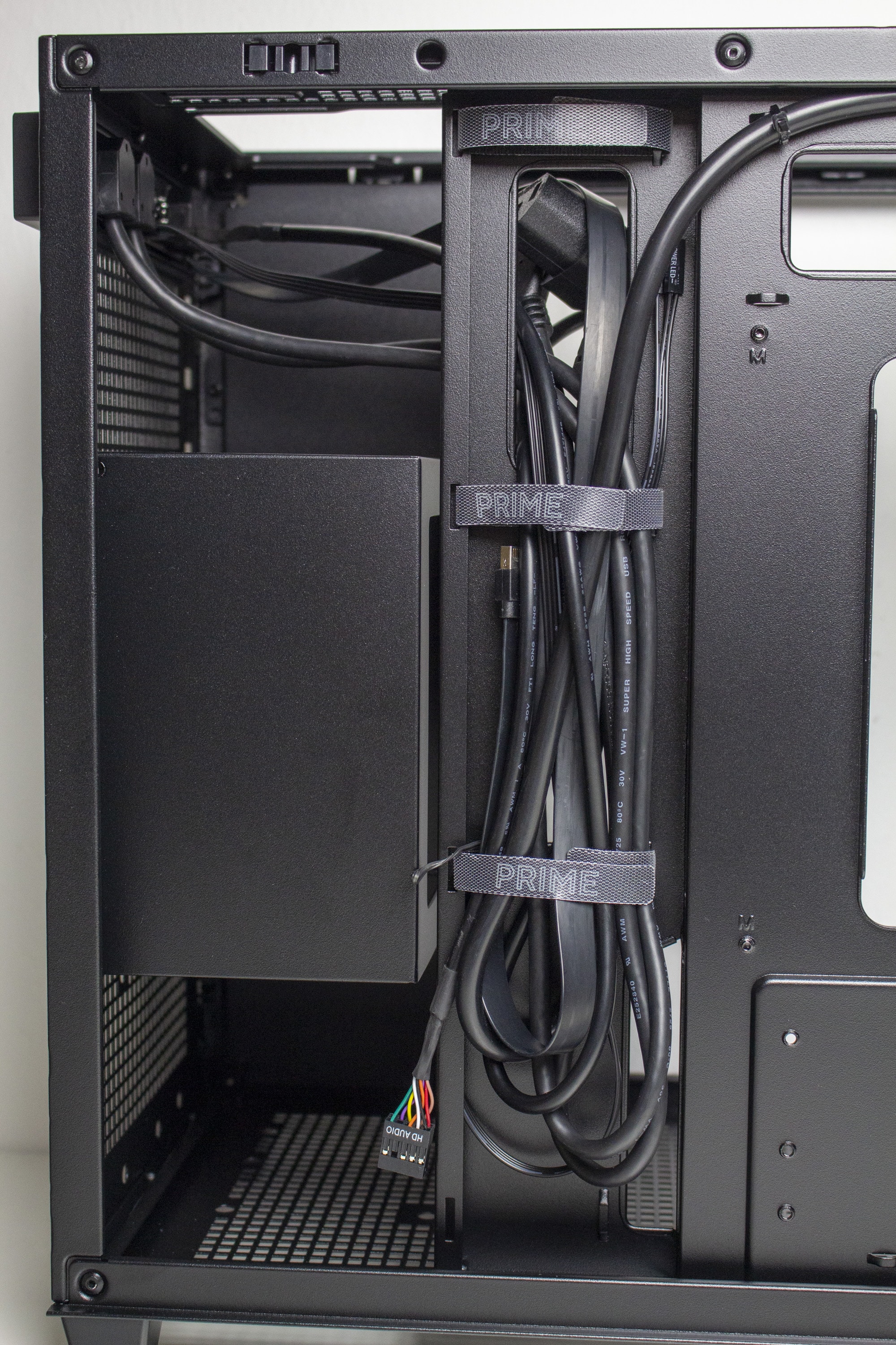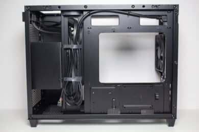 Dass ASUS sich beim Layout des Prime AP201 einige Gedanken gemacht hat, merkt man auch beim Einbau der Komponenten. Obwohl es sich um einen Mini-Tower handelt, bietet der Innenraum genug Platz um alle Bauteile schnell einbauen und verkabeln zu können. Außerdem gibt es durch die zahlreichen und sinnvoll positionierten Öffnungen und Kabelbinder genug Möglichkeiten für eine saubere Verkabelung. Ebenfalls hilfreich dabei ist die Stahlblende vor dem Netzteil, hinter der sich überflüssige Kabel verstecken lassen. Wenn wir etwas kritisieren müssten, dann wäre das der Platz hinter dem Mainboard-Tray, der mit 15 Millimetern recht gering ausfällt. Da hier aber nur die I/O- und das 8-Pin-12V-EPS-Kabel entlanggeführt werden müssen, war der Platz ausreichend.