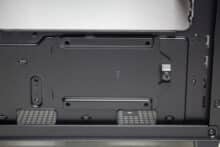 An der Rückseite des Mainboard-Trays gibt es nicht so viel zu entdecken. Zwischen Tray und Sidepanel stehen außerhalb des Kabelkanals lediglich 15 Millimeter Platz zur Verfügung. Da der Kabelkanal aber tiefer und groß genug ist, muss direkt hinter dem Mainboard-Tray vermutlich nur das 8-Pin-EPS-Kabel verlegt werden. Für die übrigen Kabel dürfte es unter bzw. hinter dem Netzteil ausreichend Raum geben. Weiterhin verfügt die Rückseite über zahlreiche Ösen für Kabelbinder sowie drei Klettstreifen im Bereich des Kabelkanals. Der obere Klettstreifen ist aus unserer Sicht jedoch völlig fehlplatziert und erfüllt keinen Nutzen.