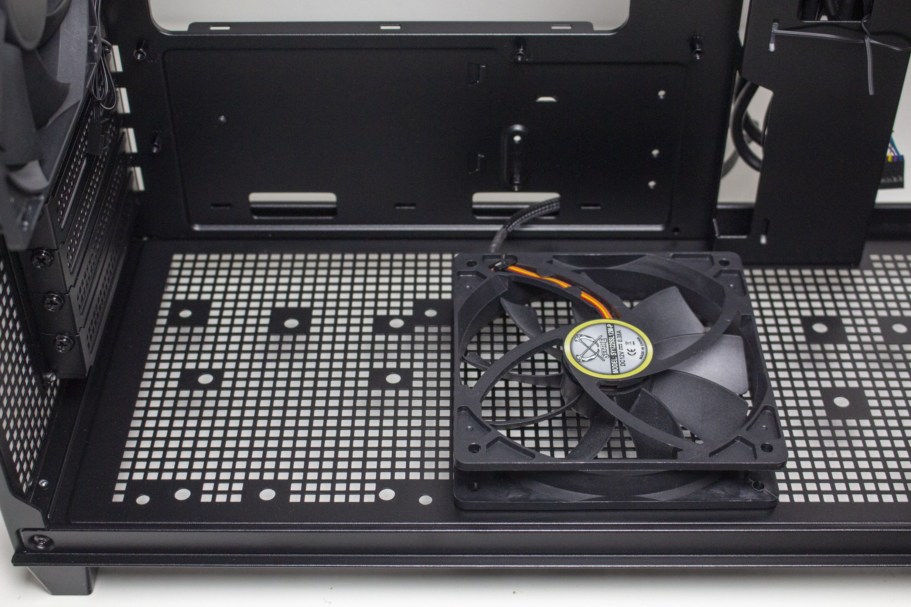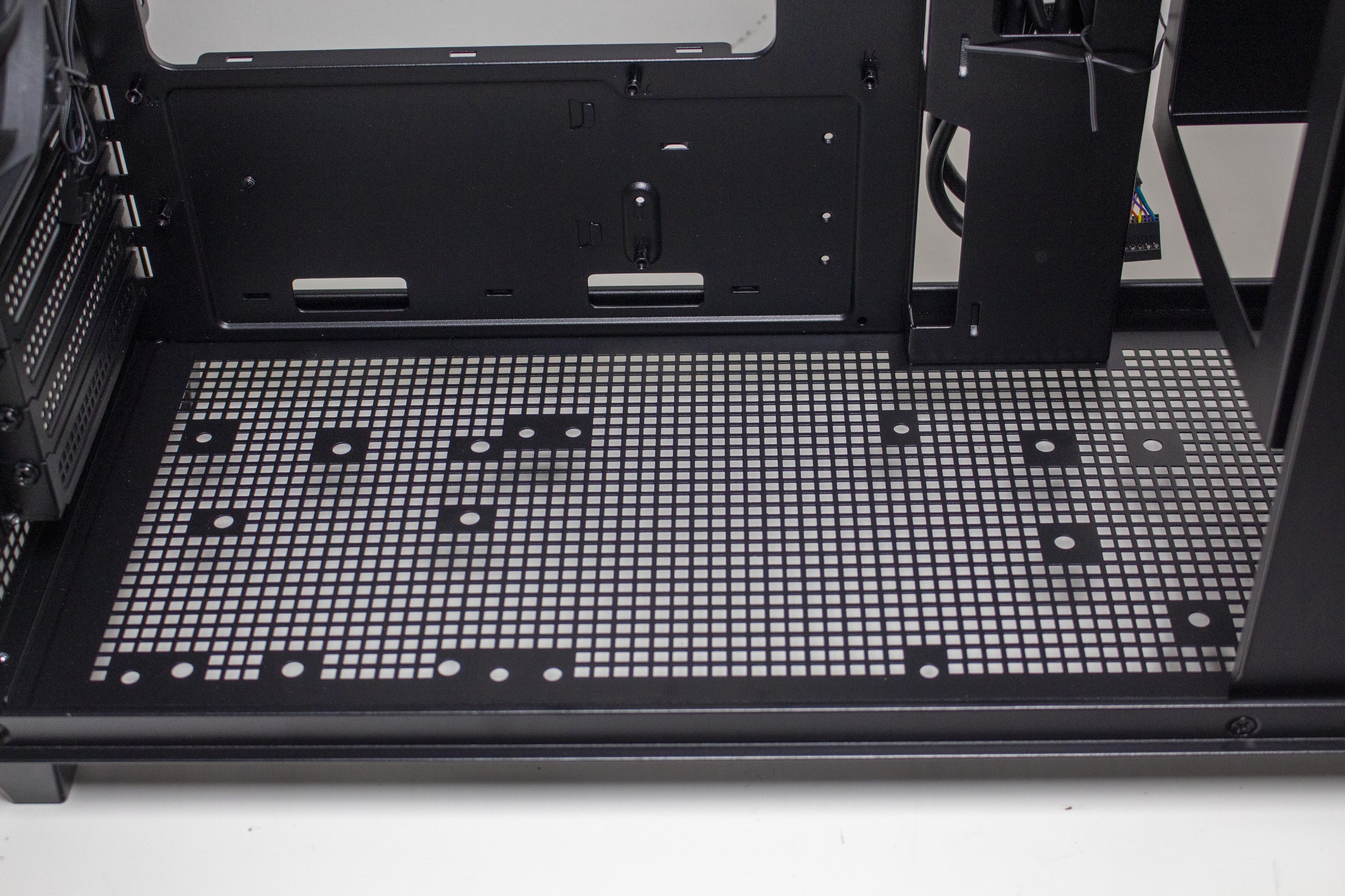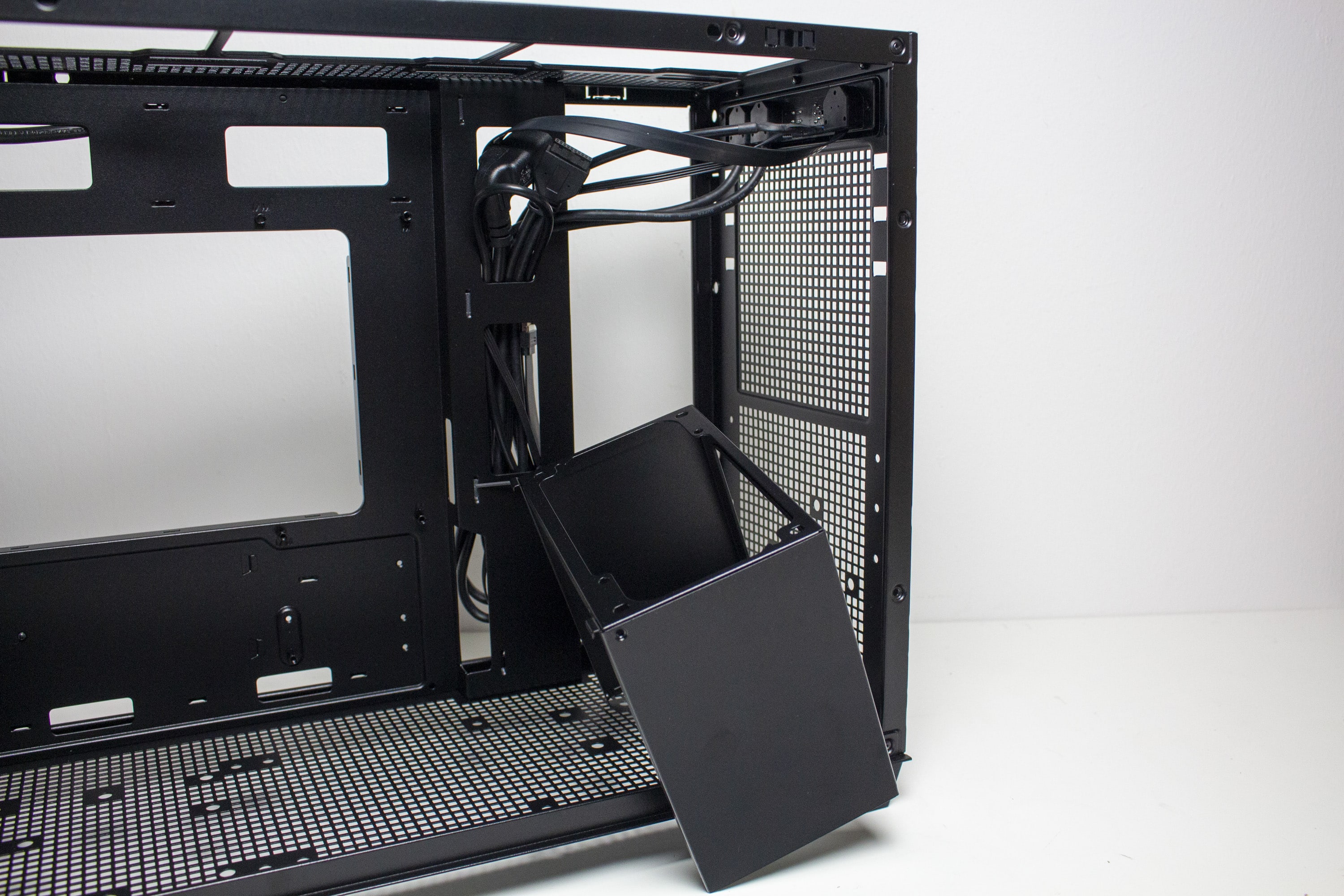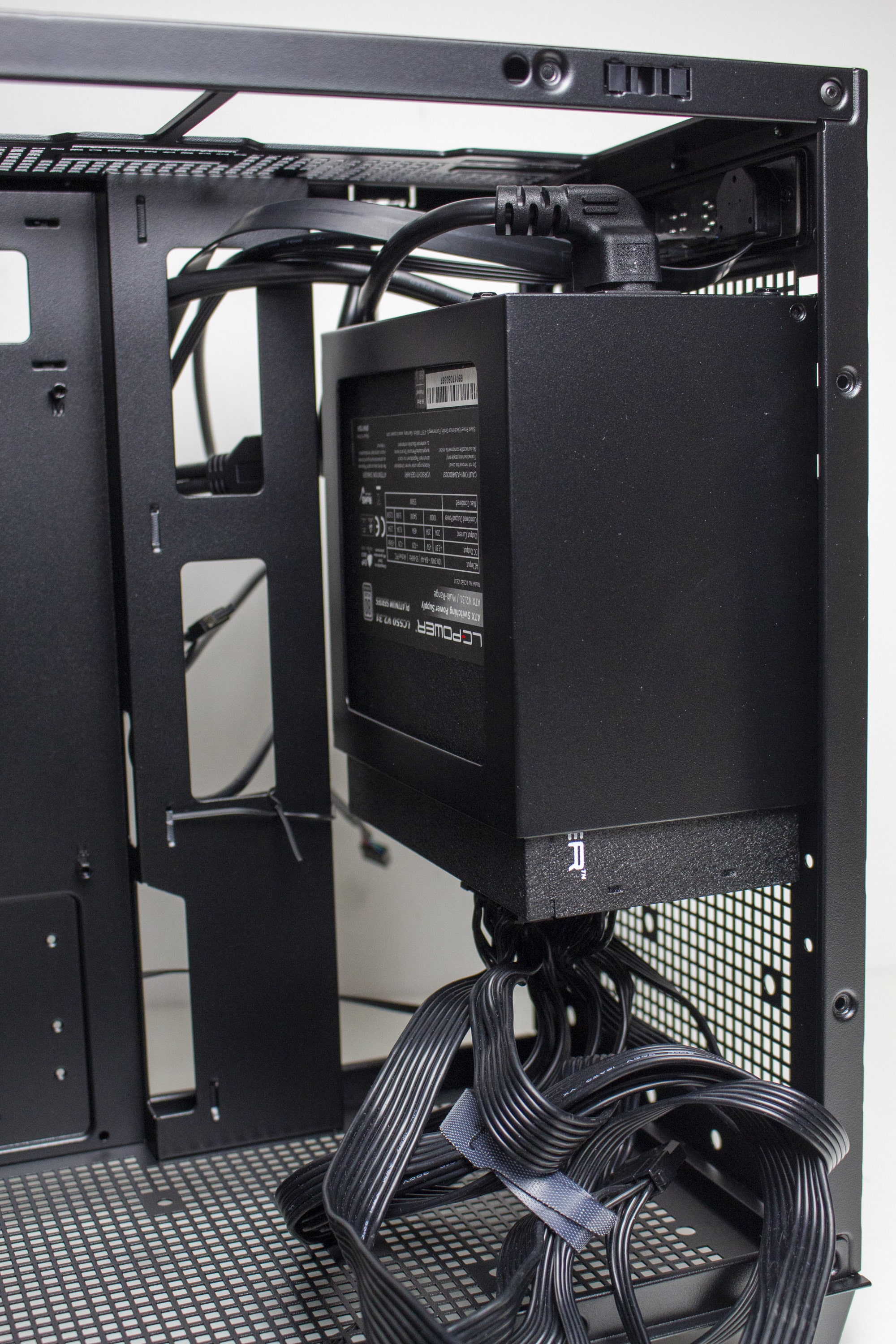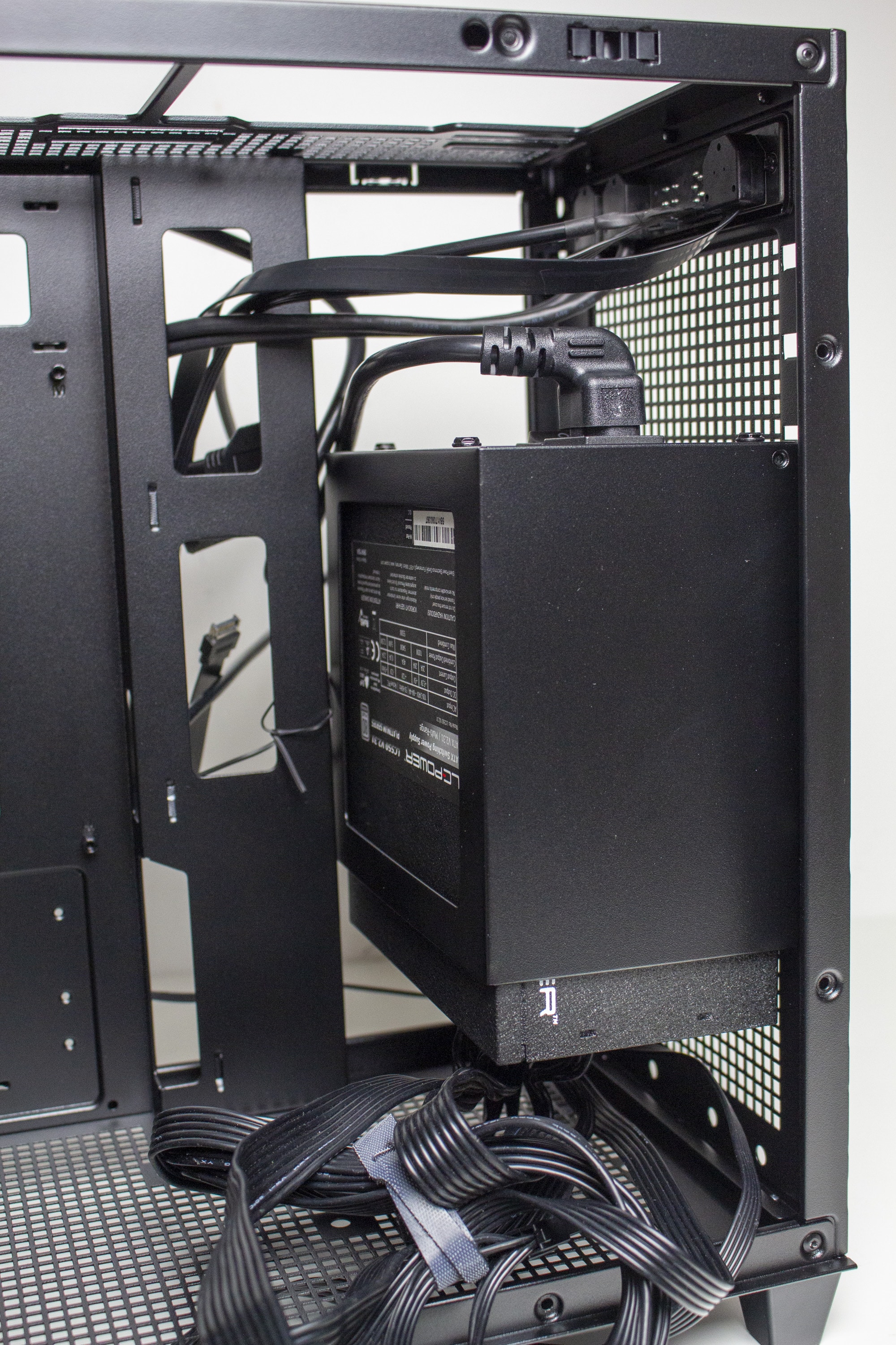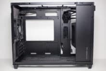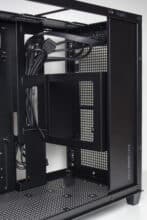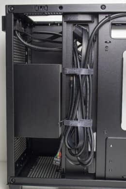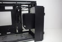 Der rechte Bereich des Innenraums ist ab Werk von einer Platte verdeckt. Entfernt man diese mittels Schrauben, kommt dahinter der Montagerahmen für ein ATX-Netzteil zum Vorschein. Über zwei Schrauben und zwei weitere Haltenasen kann der Rahmen in verschiedenen Höhen befestigt werden. Dadurch lässt sich unterhalb entweder eine HDD oder oberhalb ein großer Radiator platzieren. Mit eingebauten Netzteil dient die vorher entfernte Abdeckung als eine abgespeckte Netzteilabdeckung.
