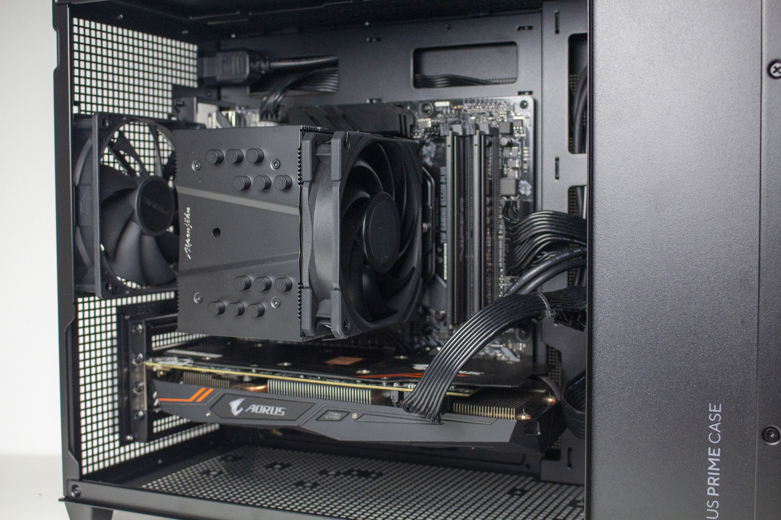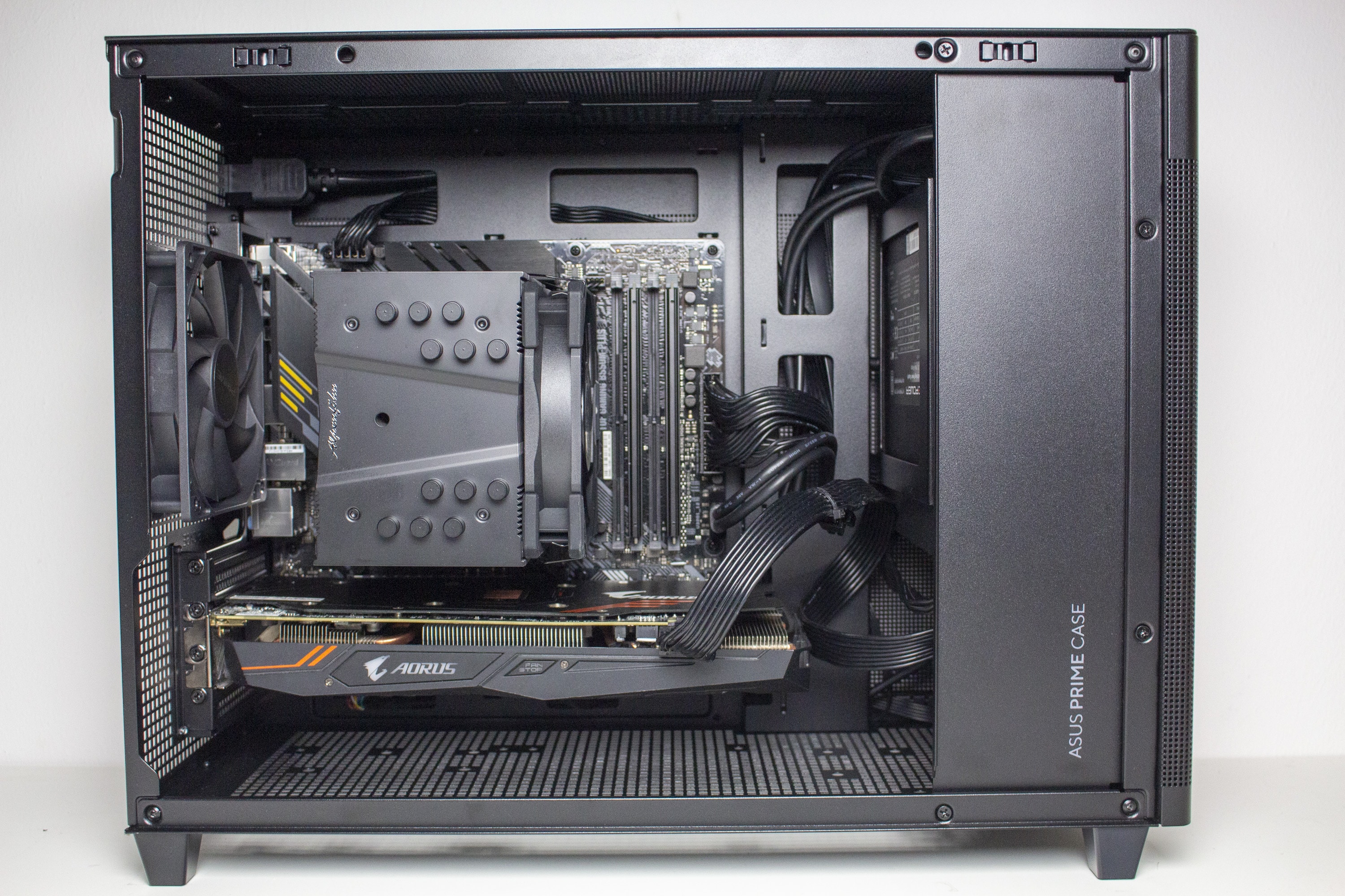 Nun kommen wir zum Systemeinbau beim ASUS Prime AP201 Test. Als Hardware verwenden wir einen AMD Ryzen 5 1400 auf einemASUS TUF Gaming B550M-Plus* mit 16GB Crucial Ballistix Sport LT grau DDR4-2666. Der Ryzen wird von einem Alpenföhn Brocken 4*gekühlt und ist auf 3,8 GHz (1,175 V) übertaktet. Für die Bildausgabe ist eine GTX 1060 6GB von Gigabyte AORUS zuständig. Die Stromversorgung erledigt das vollmodulare LC-Power LC550 V2.31 Platinum.