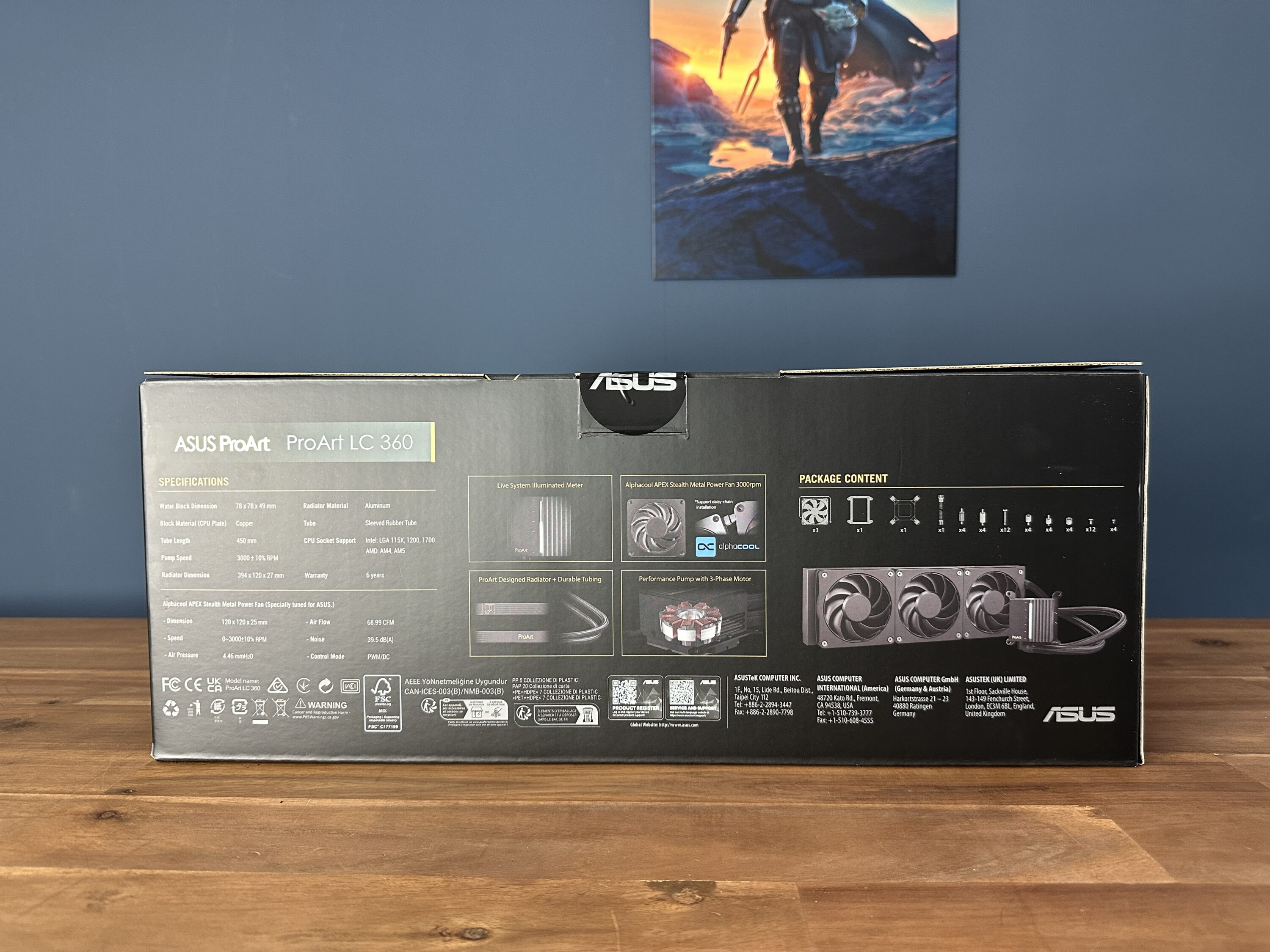 Bereits beim Auspacken der Asus ProArt LC 360 wird klar, dass es sich um ein Premiumprodukt handelt. Die All-in-One-Wasserkühlung ist äußerst sorgfältig und hochwertig verpackt, sämtliche Komponenten sind sicher im Karton fixiert und gut geschützt, um Transportschäden effektiv zu vermeiden. Zwar kommt kein Schaumstoff zum Einsatz, doch Radiator und Pumpenblock liegen passgenau und stabil im Karton, sodass sie während des Transports nicht verrutschen können – ein wertiger Ersteindruck bleibt dennoch bestehen.