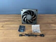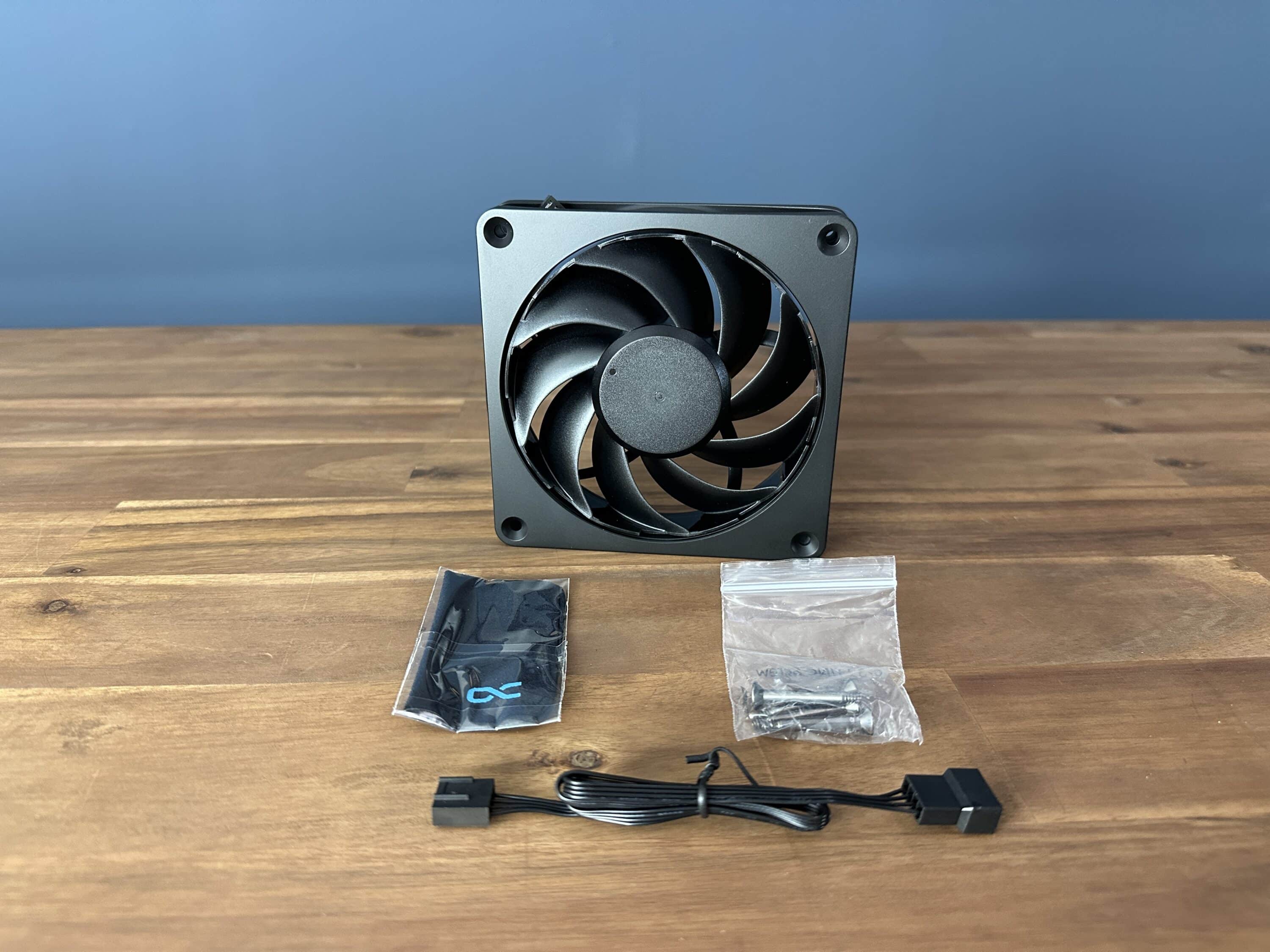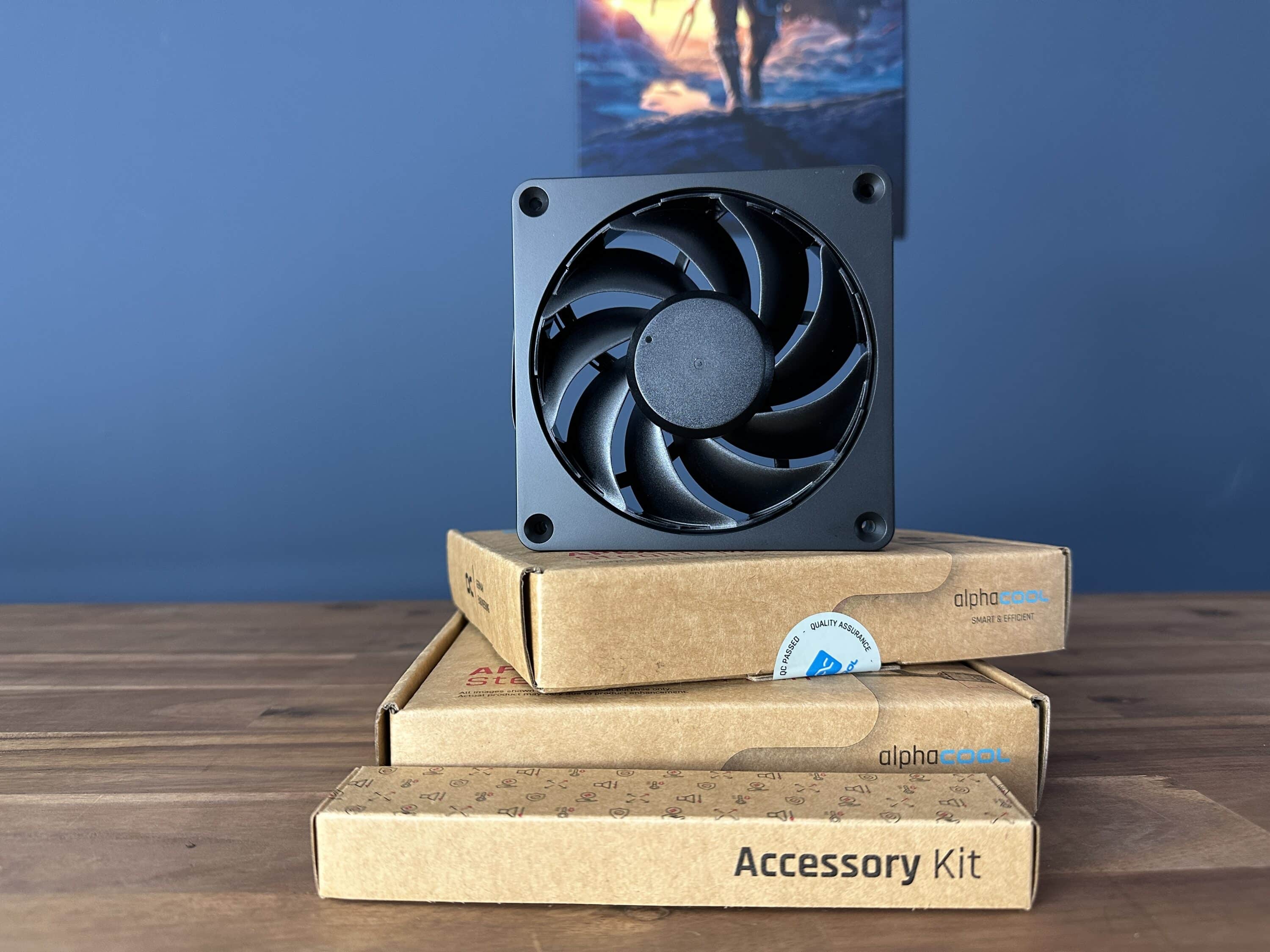 Die mitgelieferten Alphacool Apex Stealth Metal Lüfter runden das Bild ab. Diese bestehen nicht wie üblich aus Kunststoff, sondern aus Metall und heben sich damit deutlich vom Standard ab. Die Verarbeitung ist tadellos: kein Spiel in der Lagerung, keine Unwuchten, und selbst die beiliegenden Schrauben und Kabel sind hochwertig und passgenau.