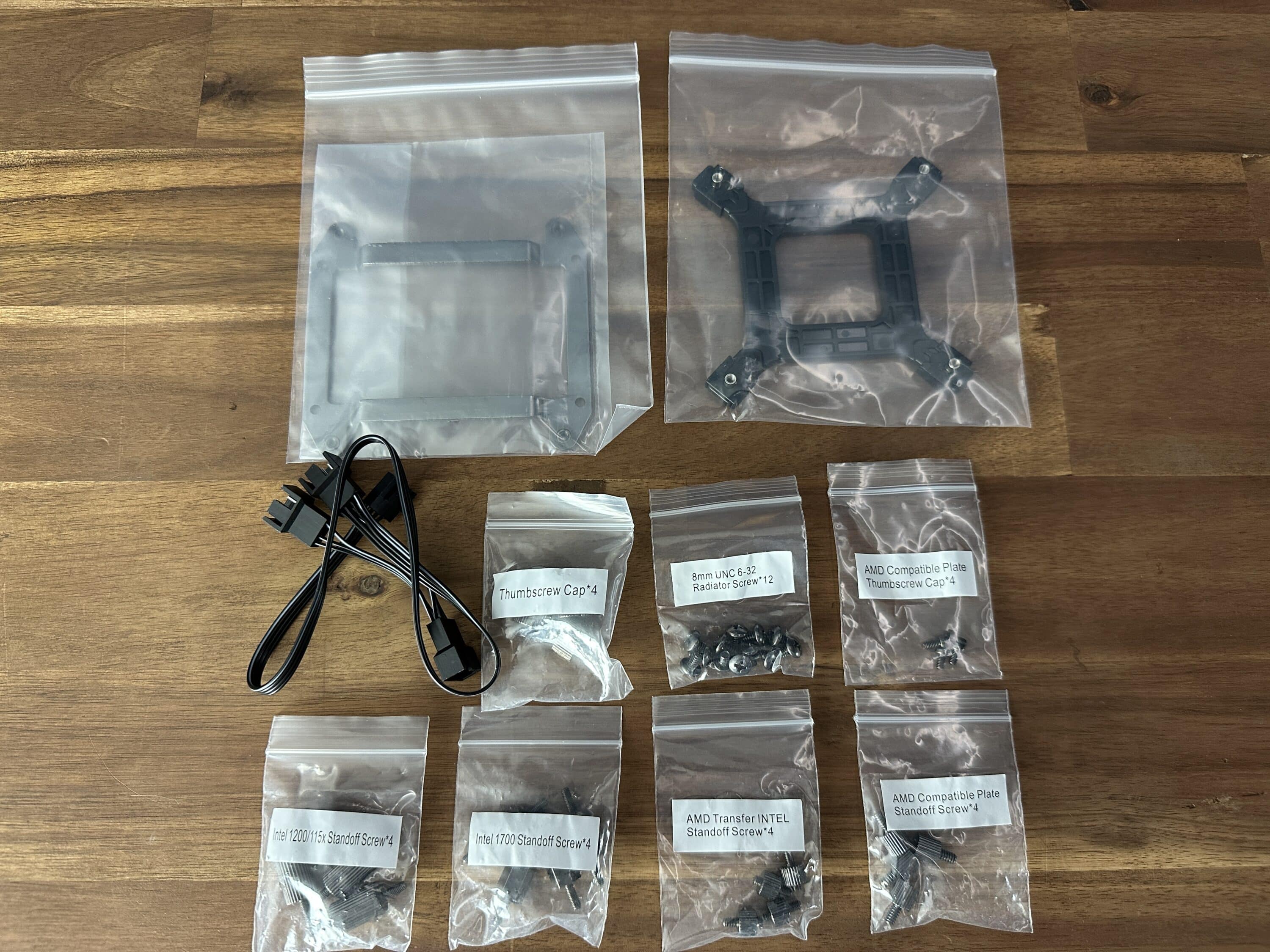 Zum Lieferumfang gehören alle für die Montage benötigten Teile: Dazu zählen Montagerahmen für alle gängigen Sockel (einschließlich Intel LGA 1700 und AMD AM5), Schrauben, Kabel und eine bebilderte Schnellstartanleitung, die eine unkomplizierte Installation auch für weniger erfahrene Nutzer ermöglicht.
