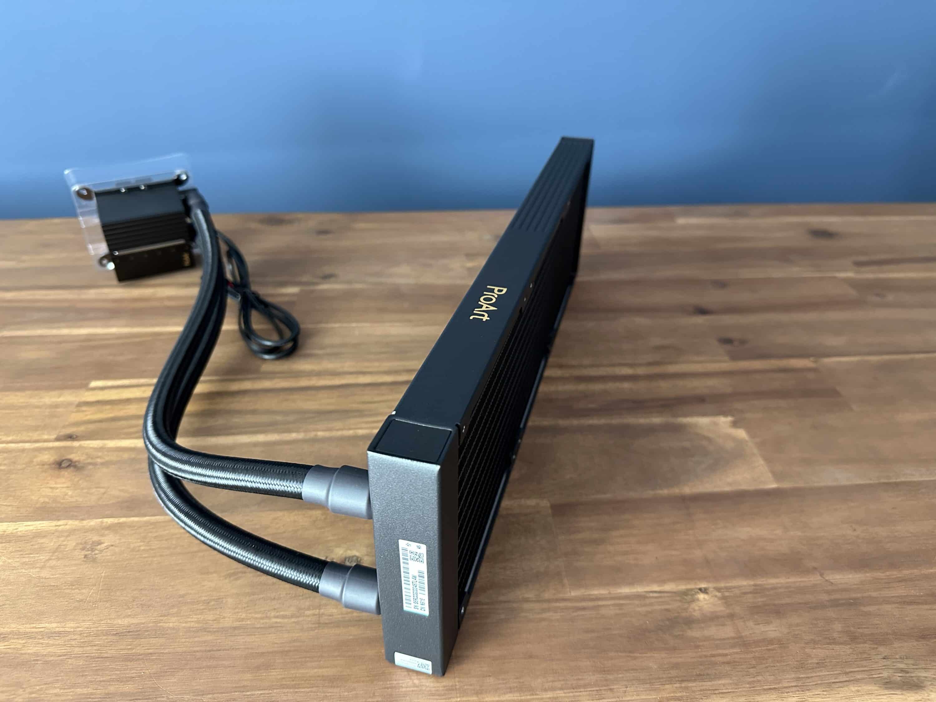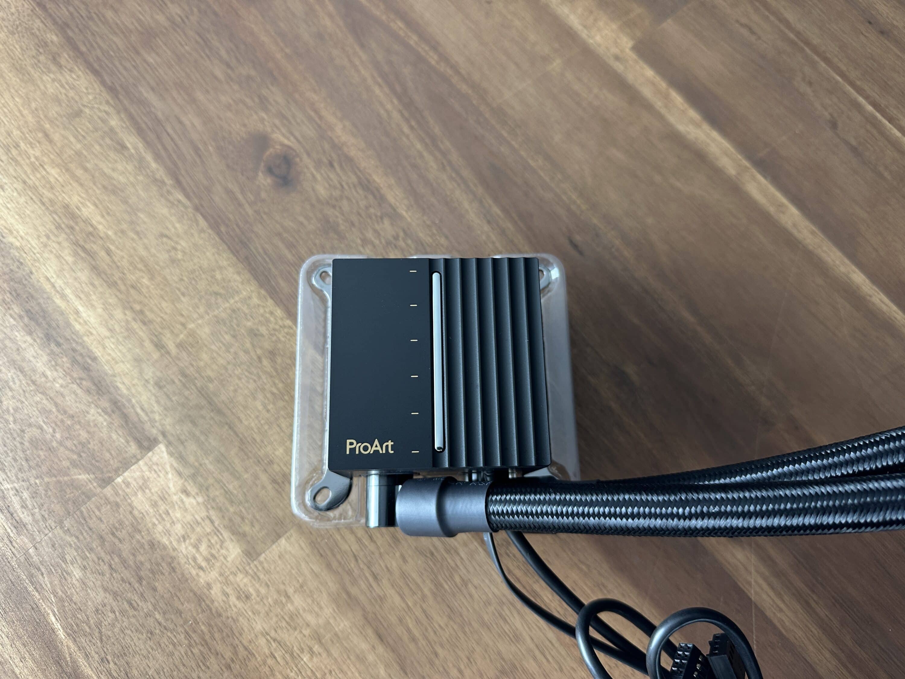 Ein Detail trübt jedoch den sehr positiven Gesamteindruck: Die Schlauchführung zwischen Pumpe und Radiator ist werkseitig ungünstig umgesetzt. Bei üblicher Deckelmontage im Gehäuse – mit den Radiatoranschlüssen typischerweise zur Front ausgerichtet – führt die aktuelle Schlauchanordnung dazu, dass sich die Leitungen ungewollt kreuzen. Statt einer logischen, sauberen Verbindung (z. B. linker Anschluss an Pumpe zu linkem Anschluss am Radiator) sind die Schläuche intern vertauscht geführt. Dies beeinträchtigt zwar nicht die Funktion oder Leistung, sorgt jedoch für eine optisch unruhige, wenig durchdachte Anmutung, die dem sonst professionellen Auftritt der ProArt-Serie widerspricht. Besonders auffällig: Auf den offiziellen Produktbildern und in Onlineshops wird eine korrekte, parallele Schlauchführung dargestellt – in der Realität entspricht das gelieferte Produkt dieser Darstellung jedoch nicht.
