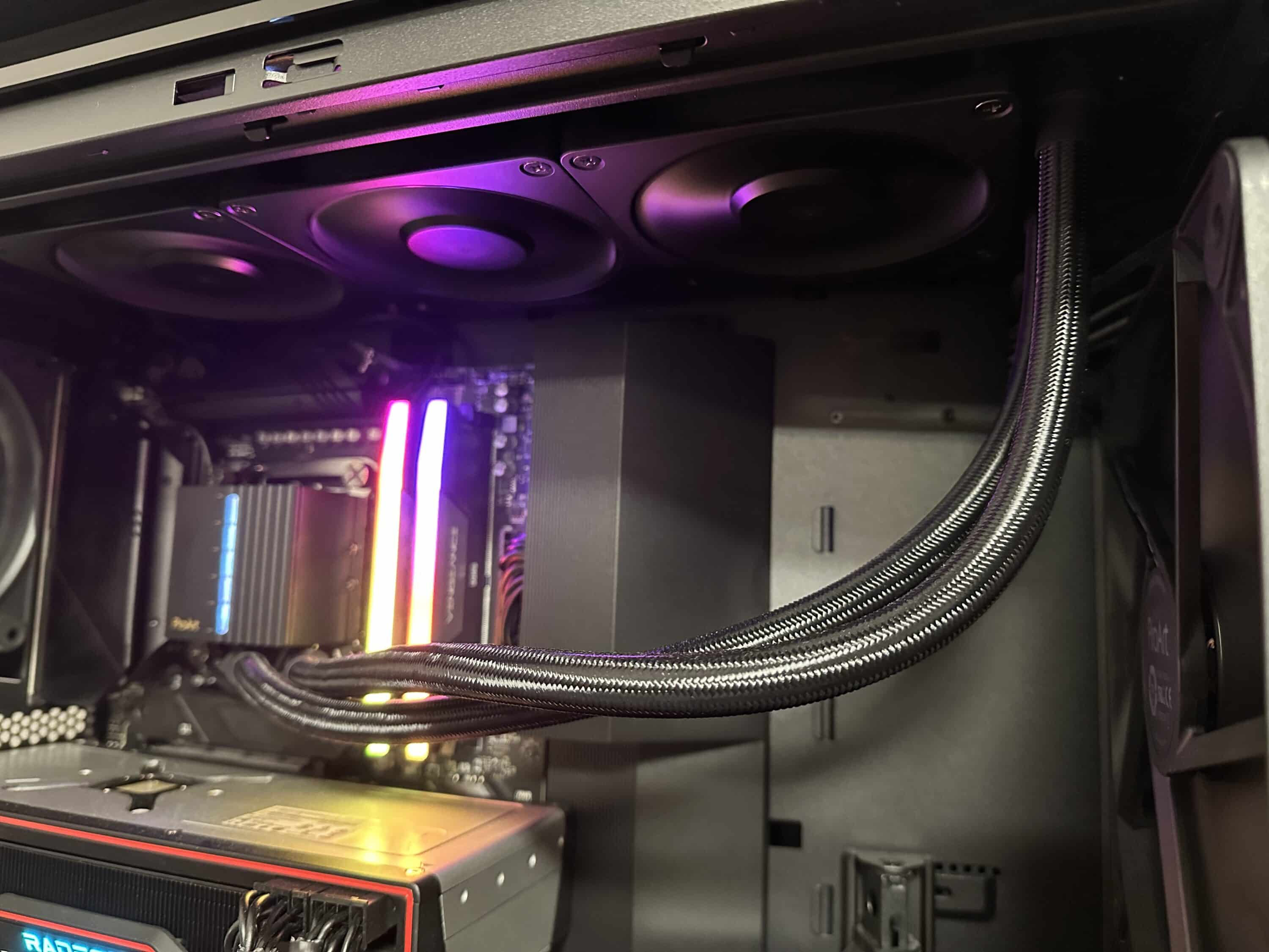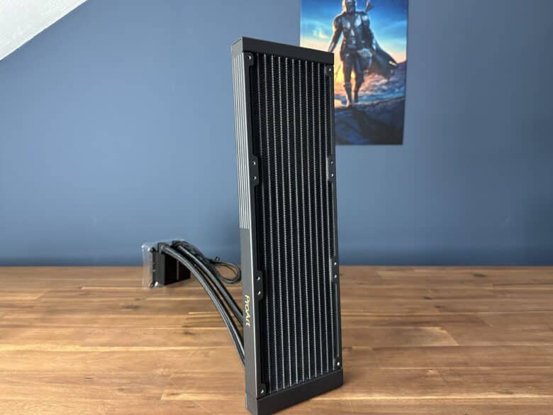 Der Radiator besteht aus sauber verarbeitetem Aluminium mit einer gleichmäßigen Beschichtung und präzise gefertigten Kühlrippen, die keine scharfen Kanten oder Produktionsrückstände aufweisen. Die Anschlussgewinde für die Lüfter sind sauber geschnitten, und auch bei der Verschlauchung zeigt sich zunächst ein hohes Maß an Sorgfalt: Die ummantelten Schläuche sind flexibel, dabei aber stabil genug, um auch bei engeren Platzverhältnissen im Gehäuse ihre Form zu halten. Die Anschlüsse zur Pumpe sitzen fest und wirken mechanisch robust.