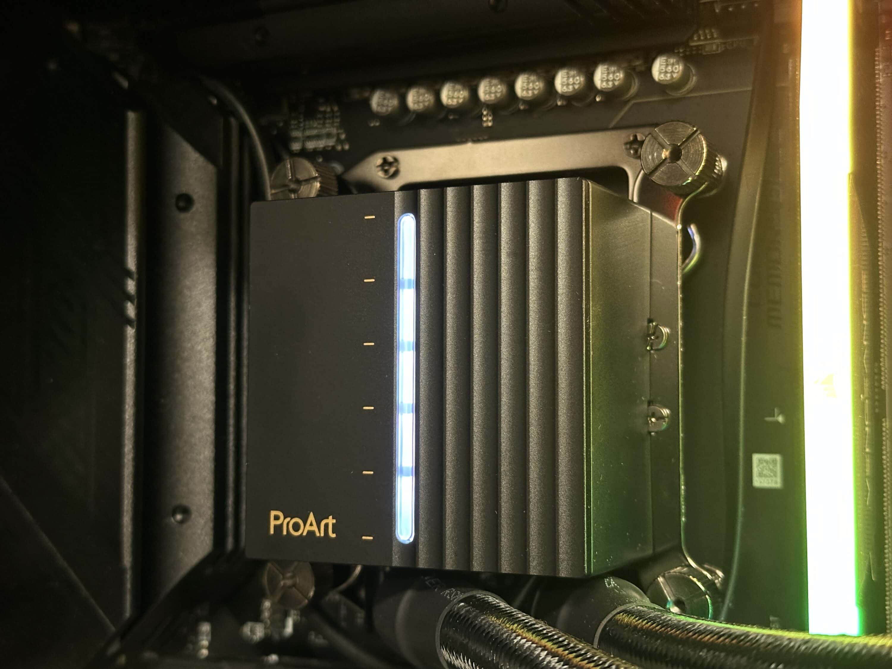 Besonders auffällig ist der mittig platzierte „Balken“, der im ausgeschalteten Zustand eine metallisch glänzende Oberfläche zeigt. Im Betrieb hingegen wird er zur Informationsanzeige, über die sich u. a. die aktuelle CPU-Temperatur darstellen lässt – ein funktionales Detail, das sich elegant ins Gesamtdesign integriert. Eine kleine, eingravierte Skala auf der glatten Seite des Deckels hilft zudem bei der visuellen Orientierung und unterstreicht die technische Präzision, die die ProArt-Serie auszeichnet.
