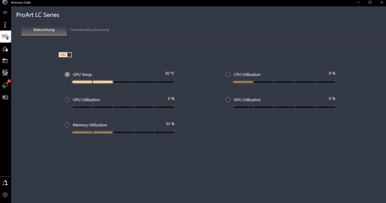 Für die Steuerung der Lüfter sowie die Konfiguration des integrierten Displays im Pumpenblock setzt Asus auf die hauseigene Software Armoury Crate. Darüber lässt sich nicht nur die Lüfterkurve individuell anpassen, sondern auch festlegen, welche Metriken auf dem OLED-Balken des Pumpenblocks angezeigt werden sollen – etwa die CPU-Temperatur, Lüftergeschwindigkeit oder die Auslastung des Systems. Die Software ist optisch aufgeräumt, bietet ausreichend Funktionen und lässt sich intuitiv bedienen.