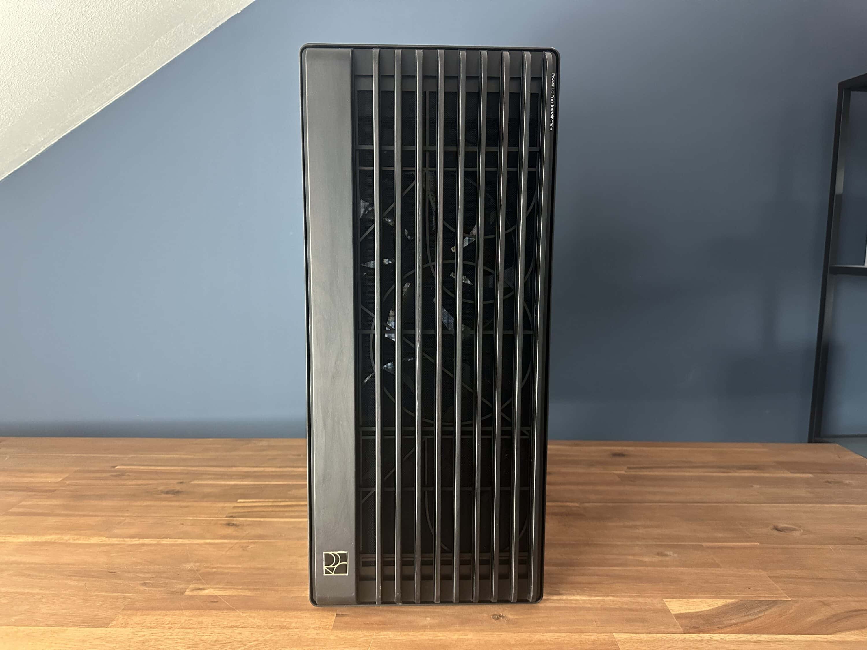 Die Frontpartie kombiniert Funktionalität mit Design. Ein großflächiger, offener Grill sorgt für eine gute Luftzufuhr, während Holzstreben die Struktur optisch auflockern. Unten links befindet sich ein dezentes ProArt-Logo, während oben rechts der Schriftzug „Power Up Your Imagination“ eingraviert ist. Die abgerundeten Außenkanten verleihen dem Gehäuse zudem eine eigene, stilvolle Note.