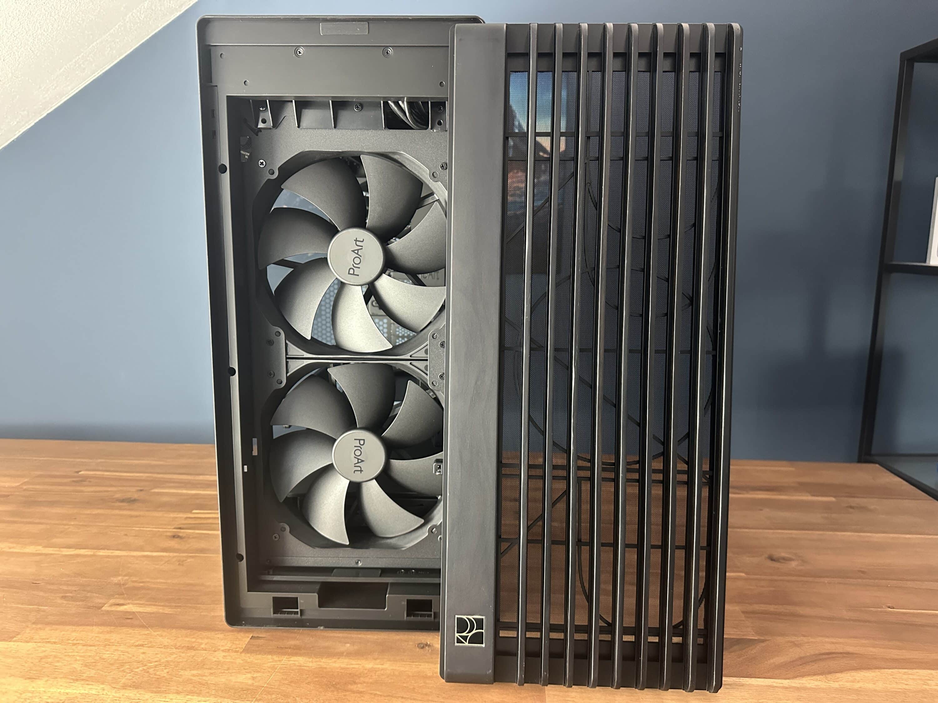 Ein zentrales Merkmal des Asus ProArt PA602 Wood Edition ist das intelligente Filtersystem, das speziell für langanhaltenden Betrieb in produktiven Umgebungen konzipiert wurde. Der Haupteinlass für Frischluft befindet sich an der Front, wo große 200-mm-Lüfter für einen konstanten Luftstrom sorgen.