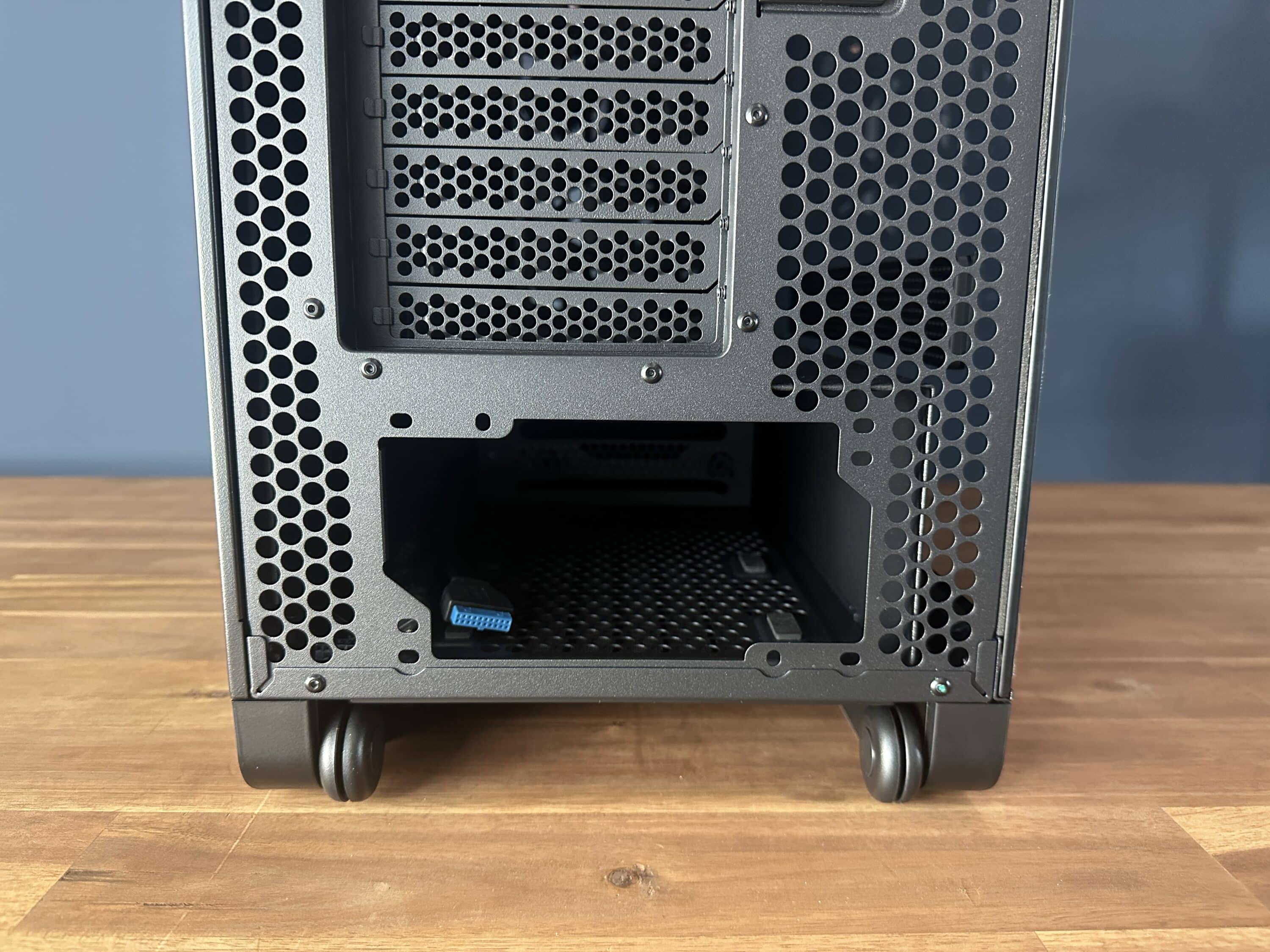 Im unteren Bereich des Gehäuses befindet sich ein separat abgetrennter Netzteilbereich, der nicht nur zur thermischen Entkopplung beiträgt, sondern auch das Gesamtbild im Innenraum aufgeräumter wirken lässt. Zwei Drittel dieses Bereichs bestehen aus Metall, während der vordere Teil aus einem stabilen, keilförmig abgeflachten Kunststoffelement gefertigt ist. Diese Formgebung dient einem funktionalen Zweck: Sie sorgt dafür, dass der Luftstrom der großen Frontlüfter gezielt in den Hauptinnenraum gelenkt wird, anstatt sich im Netzteilschacht zu stauen.
