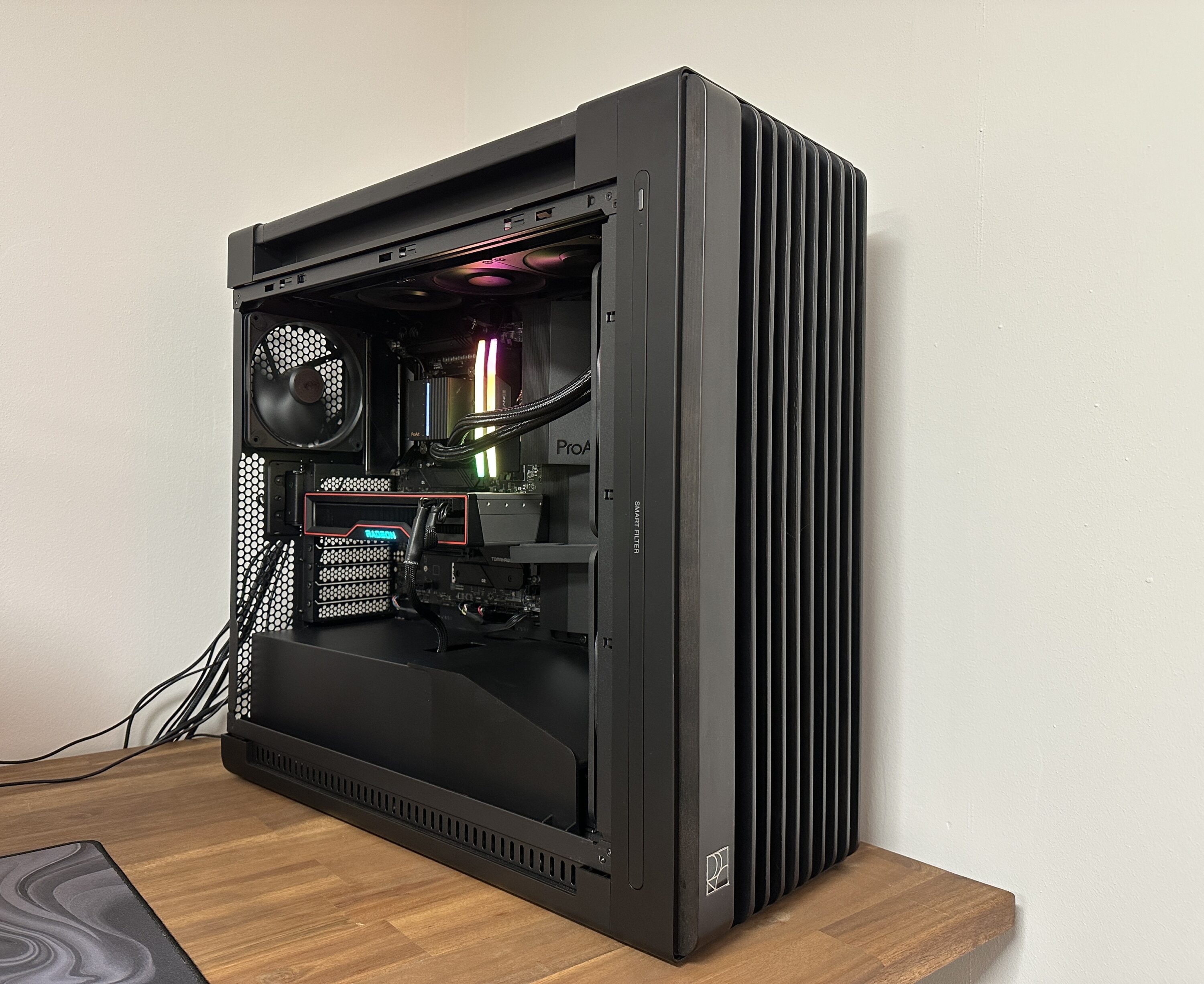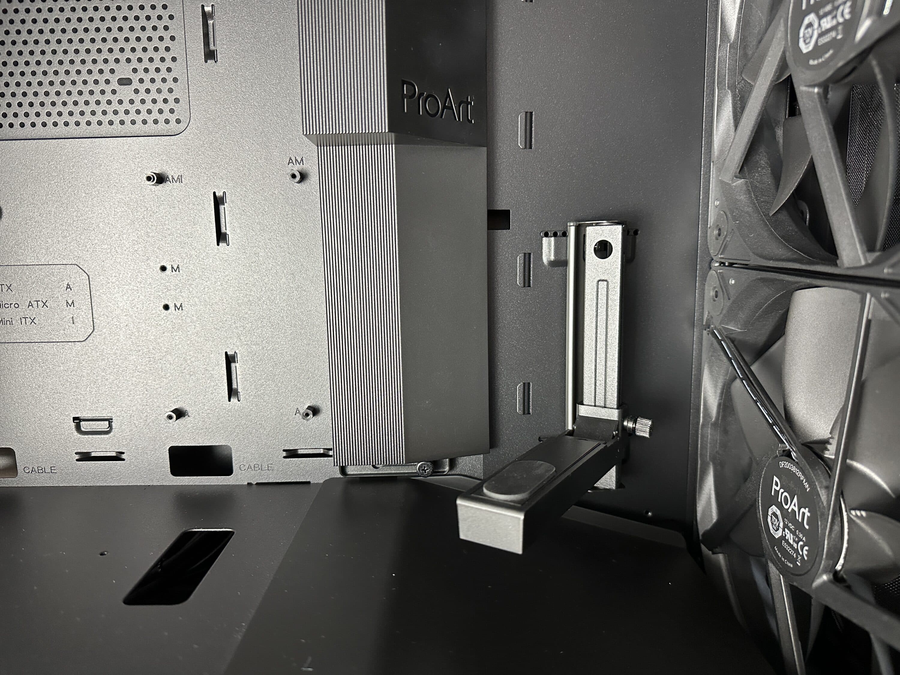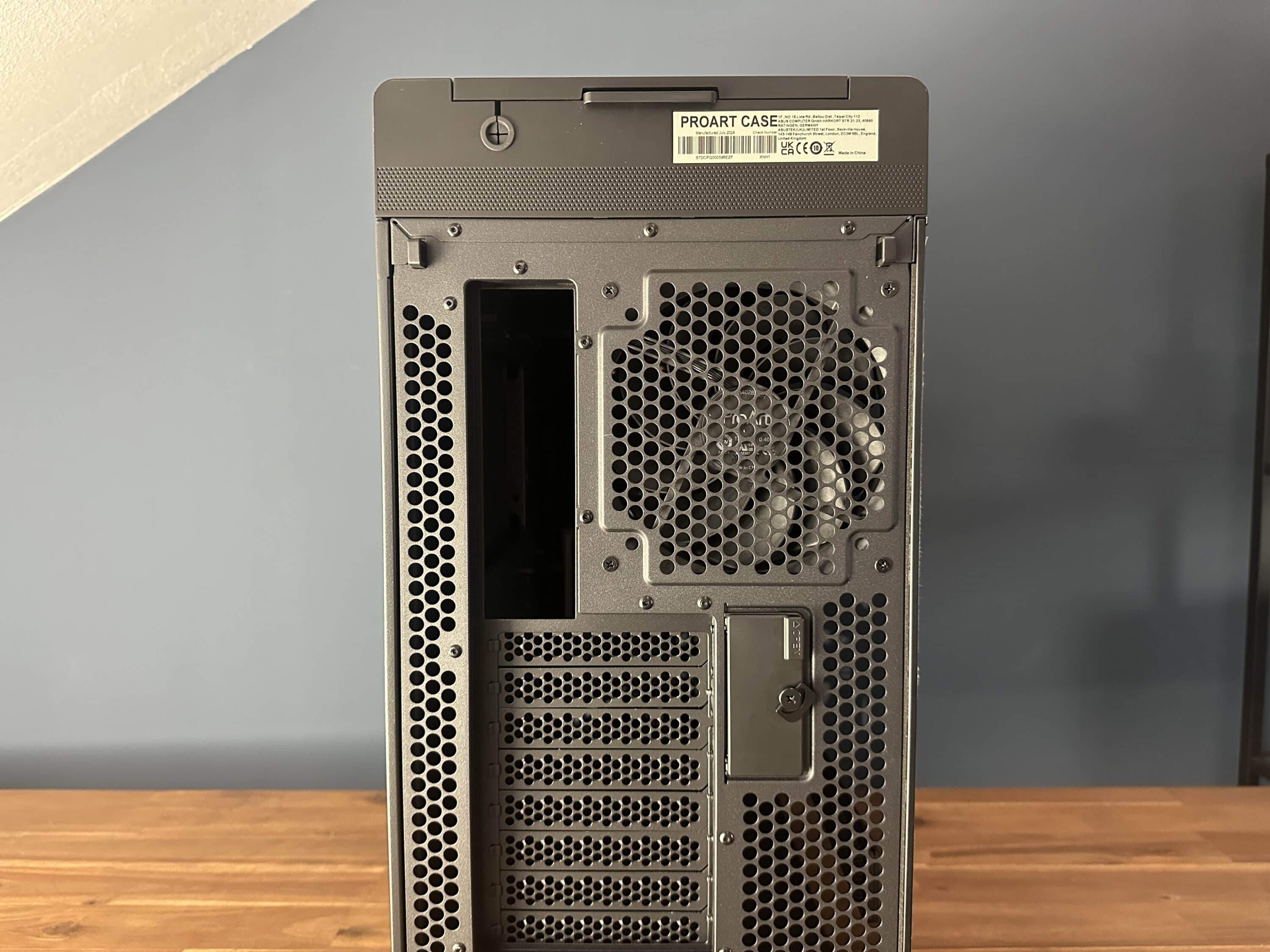 Das große, aus gehärtetem Glas bestehende Seitenteil gewährt Einblick in den Innenraum. Eine Besonderheit ist der integrierte Lüftungseinsatz mit einer perforierten Struktur, auf der der Schriftzug „ProArt“ in einer goldähnlichen Farbe erscheint. Darunter befinden sich zusätzliche Lüftungseinlässe, die zur Luftzirkulation beitragen. Direkt oberhalb verlaufen die zuvor erwähnten hölzernen Griffstangen.