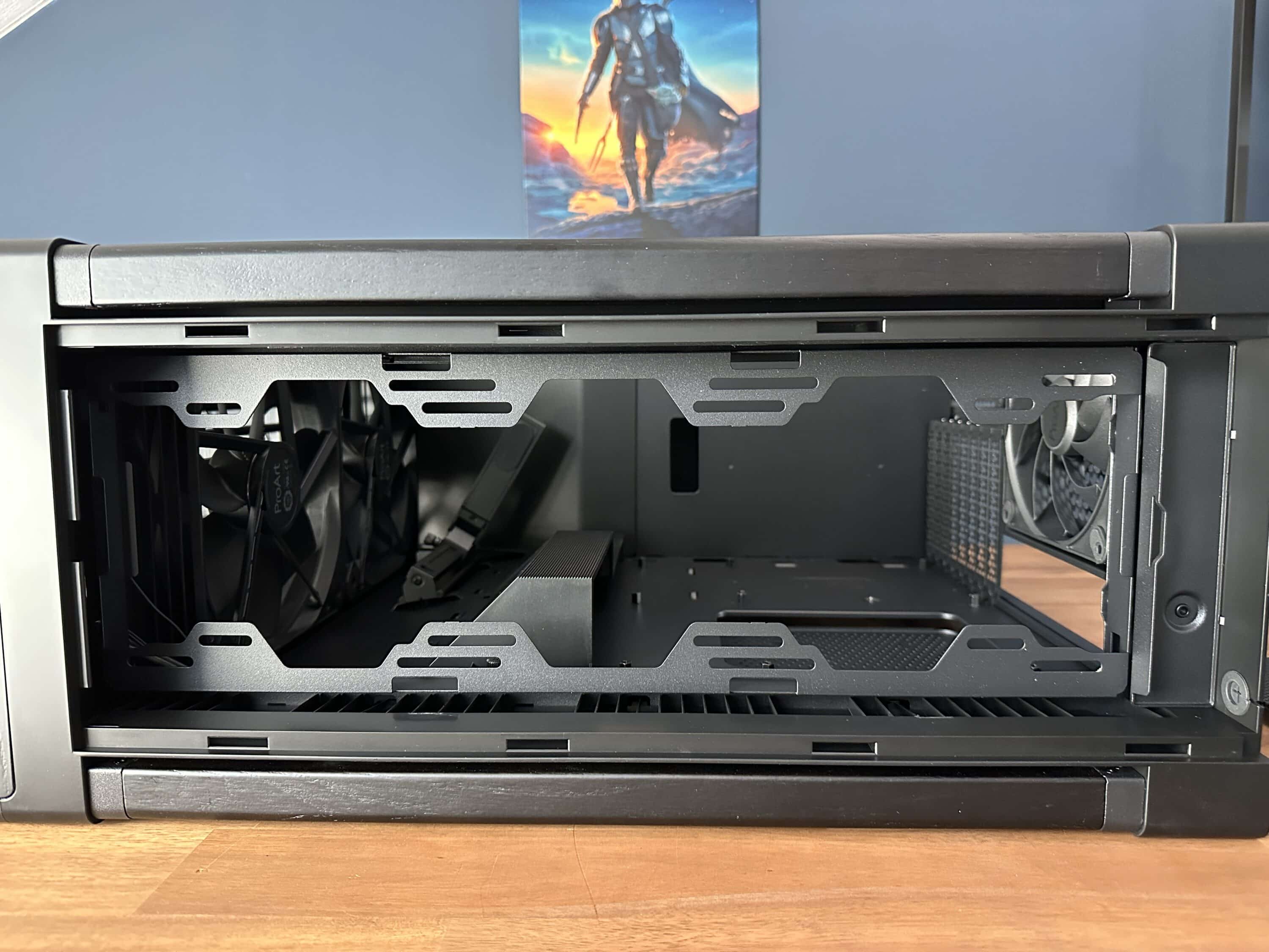 Lediglich der Einbau des Netzteils fiel im Vergleich zum restlichen Aufbau etwas aufwendiger aus. Damit dieses korrekt eingesetzt werden kann, muss zunächst der Einsatz im Netzteilschacht entfernt werden – er ist mit vier Schrauben befestigt. Dieser zusätzliche Schritt wirkt im Vergleich zur ansonsten sehr durchdachten Bauweise etwas umständlich und hätte mit einer werkzeuglosen Lösung sicherlich eleganter gelöst werden können.