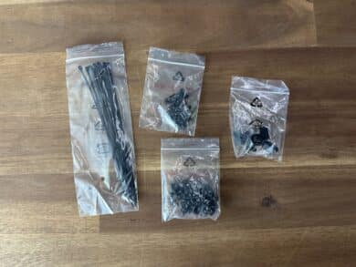 Der Inhalt der Verpackung beschränkt sich auf das Wesentliche und enthält alles Notwendige für den Zusammenbau. Die benötigten Schrauben sind in separaten Beuteln verstaut, allerdings ohne Beschriftung. Ergänzend sind ausreichend Kabelbinder vorhanden, um eine ordentliche Kabelführung zu ermöglichen.