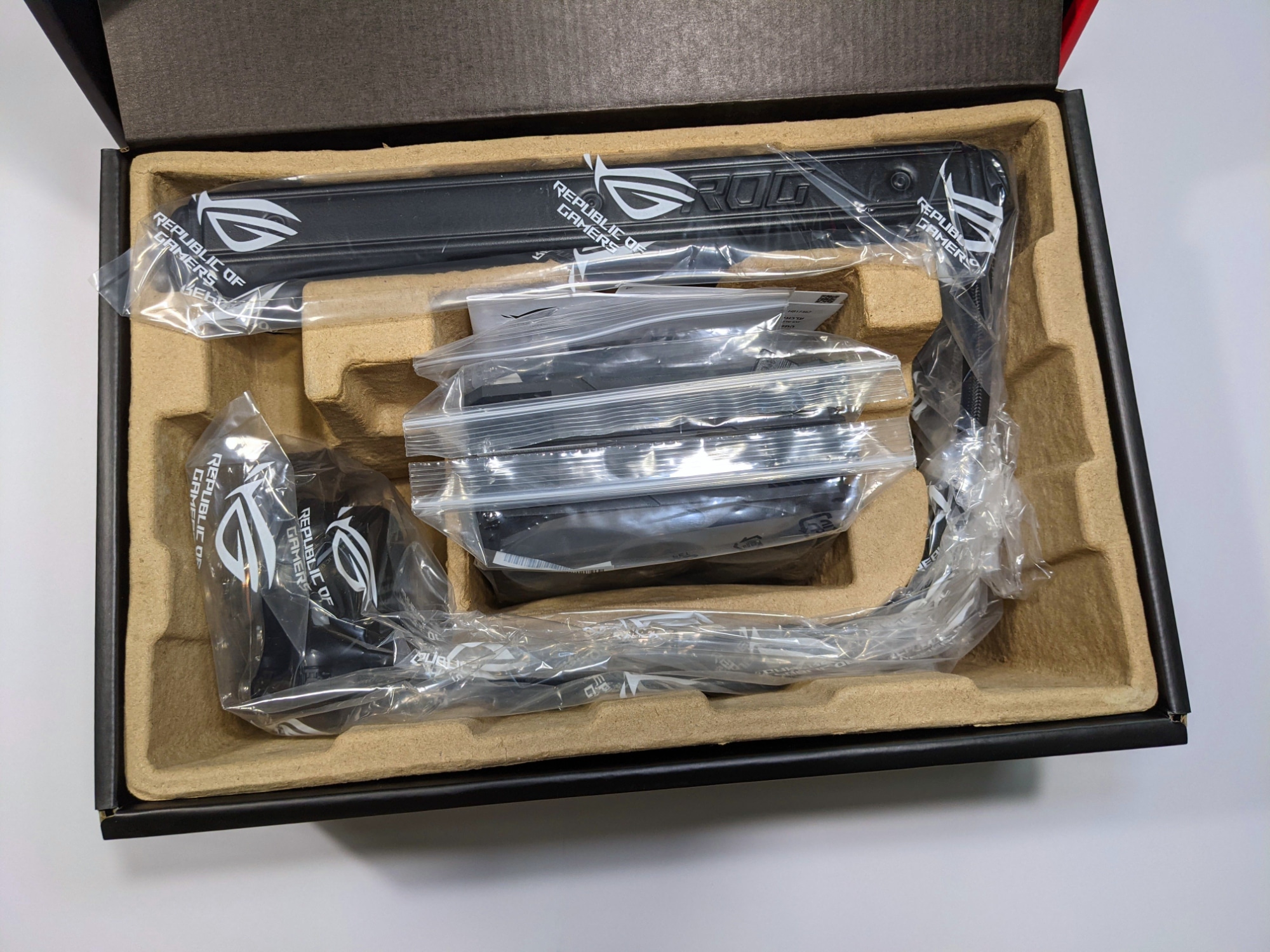 Im Inneren des Kartons ist alles gut verstaut und gegen ein Verrutschen gesichert. Neben der Wasserkühlung befinden sich die beiden 140-mm-ARGB-Lüfter, Montagematerial, Adapterkabel, eine Anleitung und ein Bogen mit mehreren ROG-Stickern im Lieferumfang. Die Wärmeleitpaste ist bereits aufgetragen und durch eine Abdeckung geschützt. Zusätzliche Wärmeleitpaste, für spätere CPU-Wechsel oder Umbauten, liegt nicht bei.