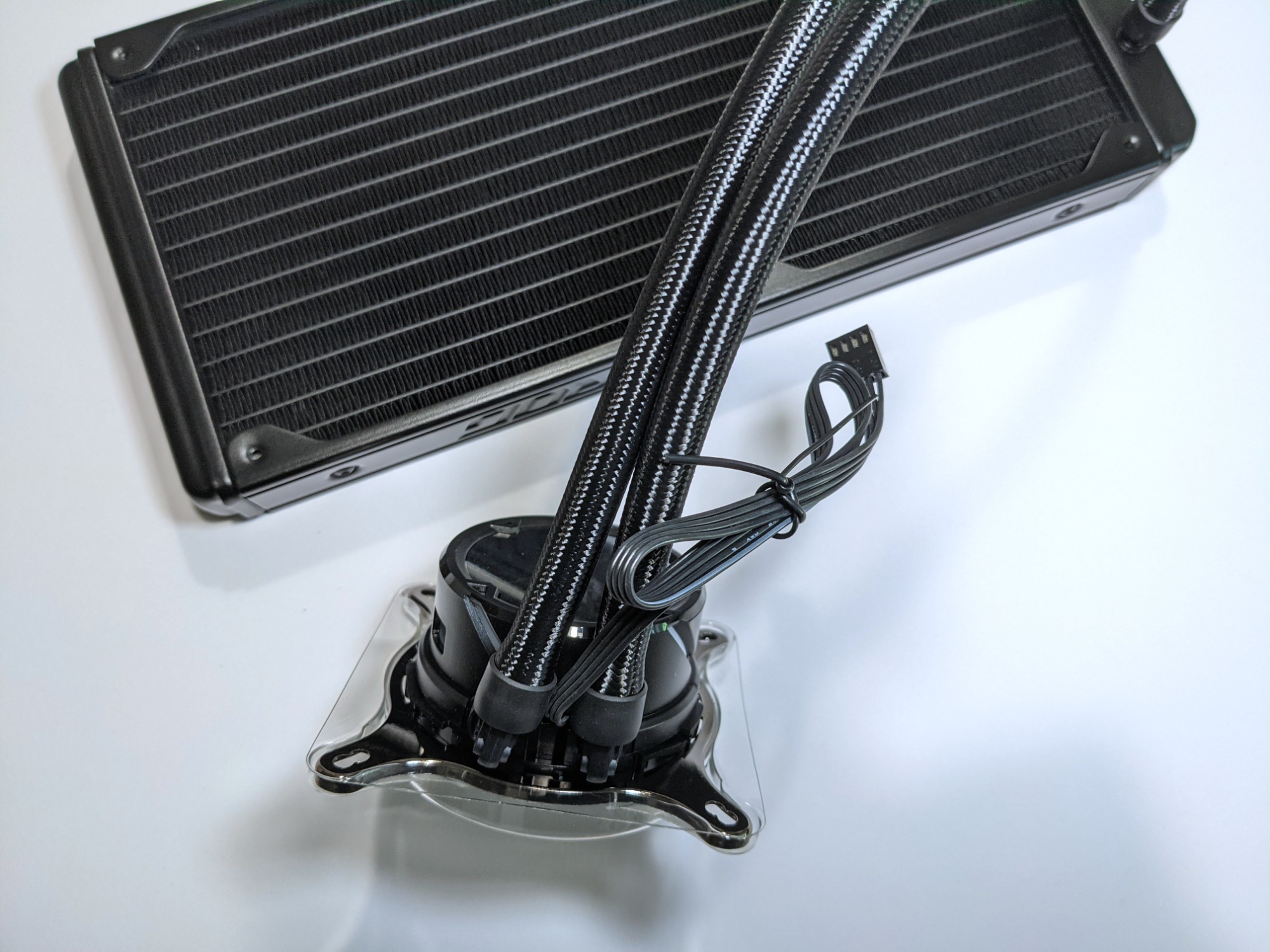Weiterhin fällt bei genauer Betrachtung ein Micro-USB-Port auf. Neben dem Anschluss für die Pumpe und den Strom- und RGB-Anschlüssen für die Lüfter wird auch dieser, für die ARGB-Beleuchtung, benötigt.
