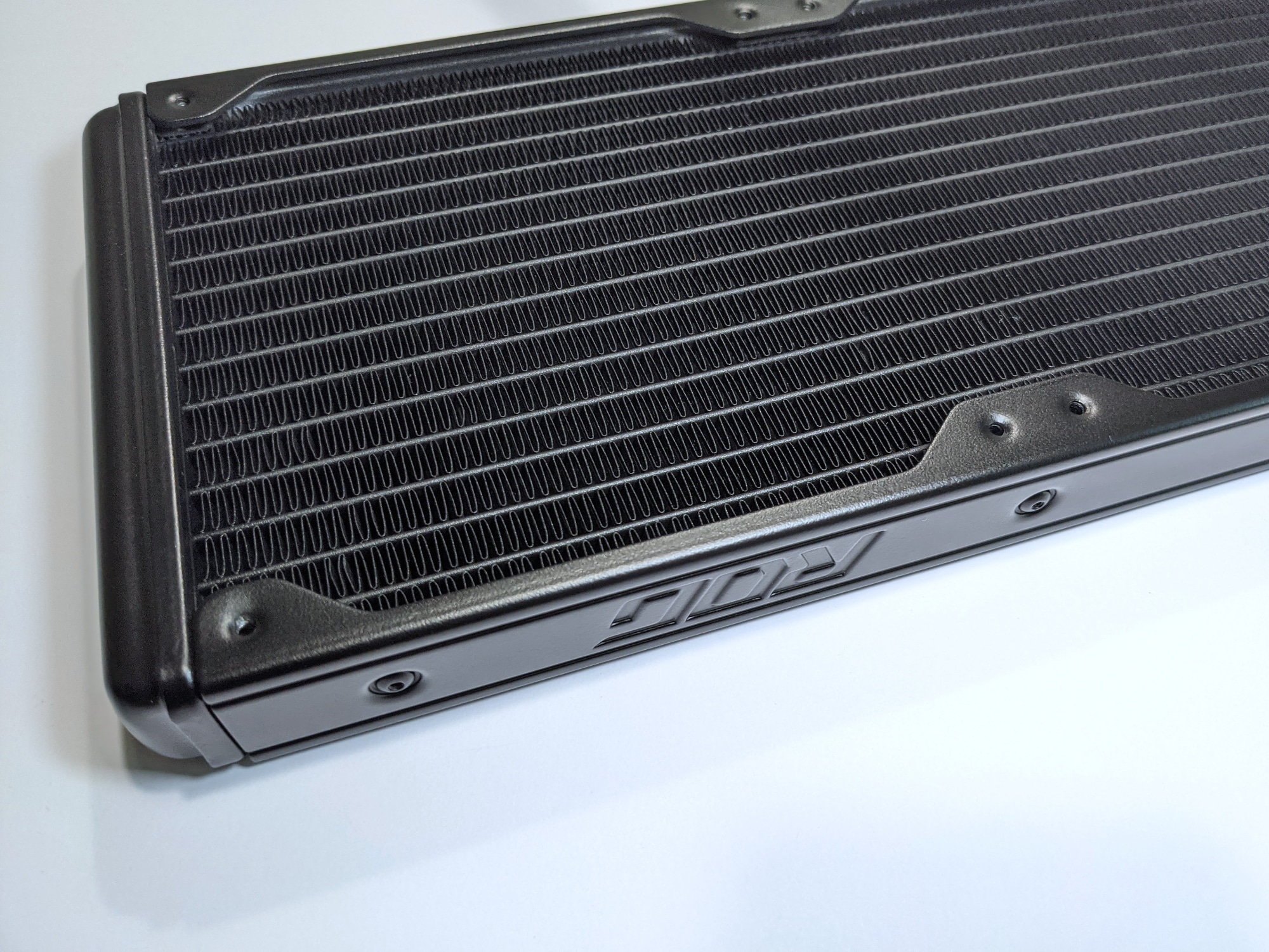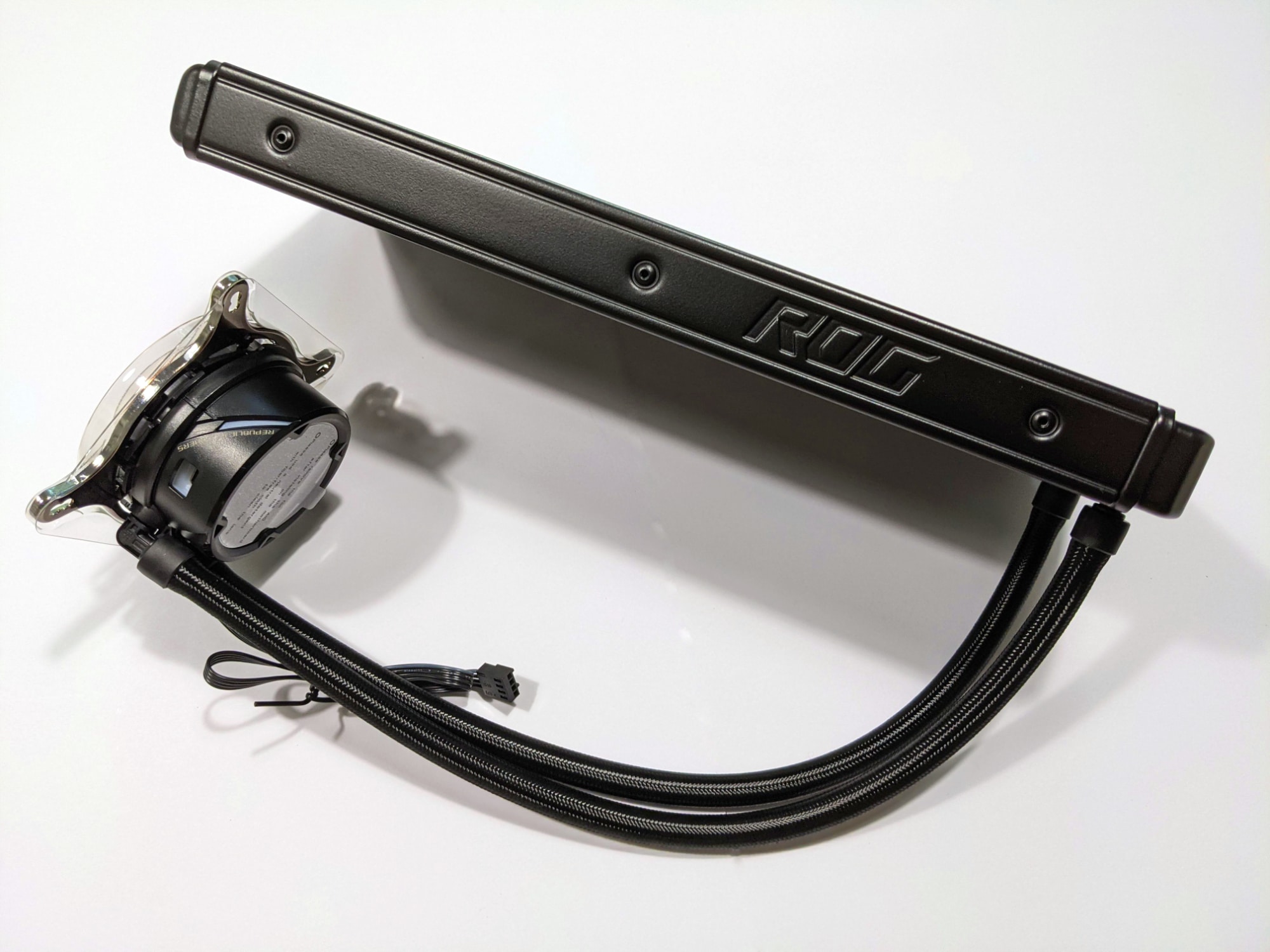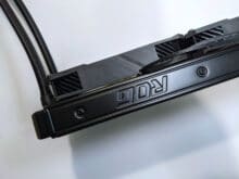 Die Rahmen der Lüfter, die Schläuche und auch der Radiator sind komplett schwarz. An letzterem befindet sich zudem ein ROG-Logo. Auffallen möchte man vor allem mit dem kompakten runden Kühlerblock. Dieser wird rundherum von mehreren ROG-Schriftzügen geziert und kann streifenweise beleuchtet werden. Die Oberseite des flachen Kühlerblocks ist stark glänzend. Im Betrieb, oder auf Wunsch auch immer, wird hier ein ROG-Logo mit verschiedenen Effekten und Farben beleuchtet. Im Gegensatz zu einigen anderen, ähnlich hochpreisigen, AiOs kann das Logo leider nicht gedreht werden, so dass die Anschlüsse der Schläuche, für die richtige Ausrichtung des Logos, immer rechts vom Kühlkörper sein müssen.