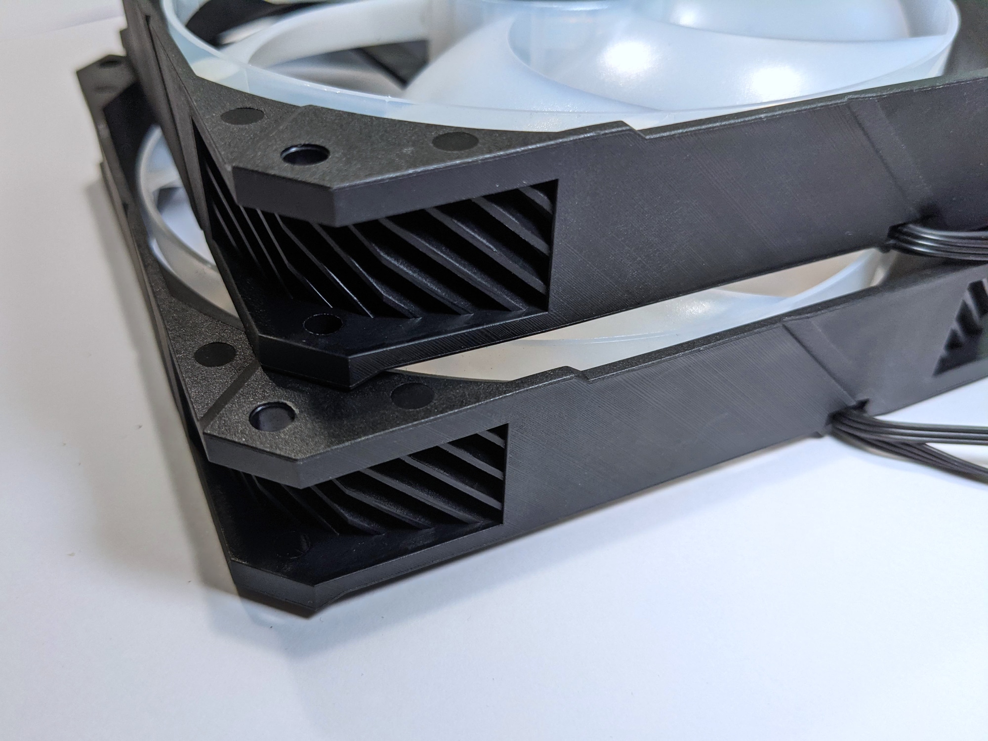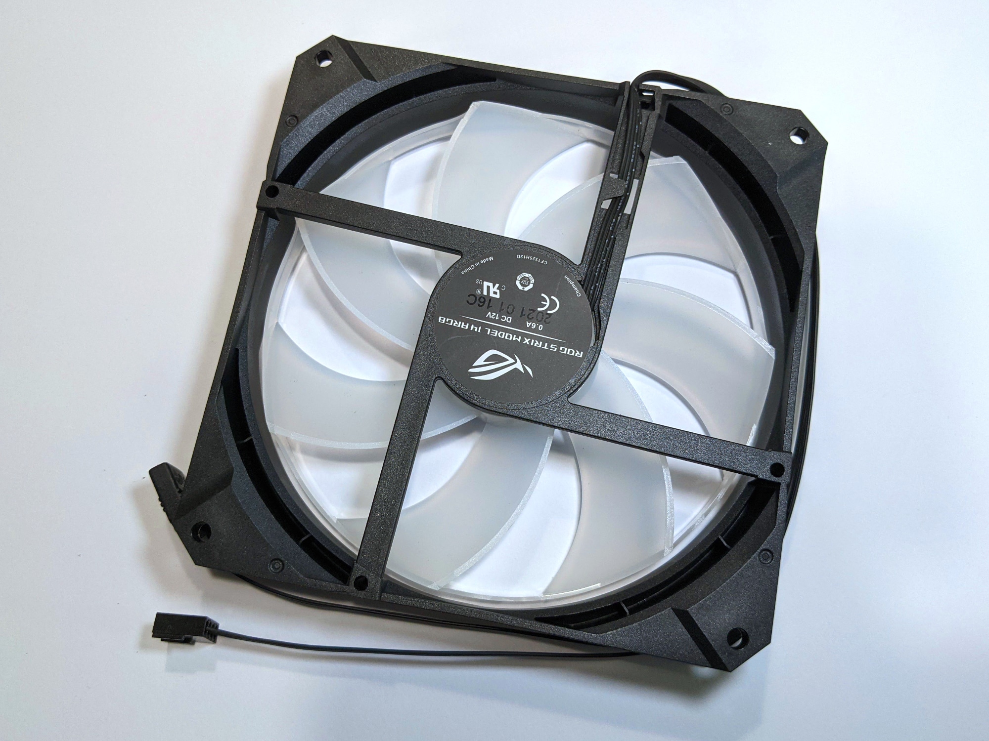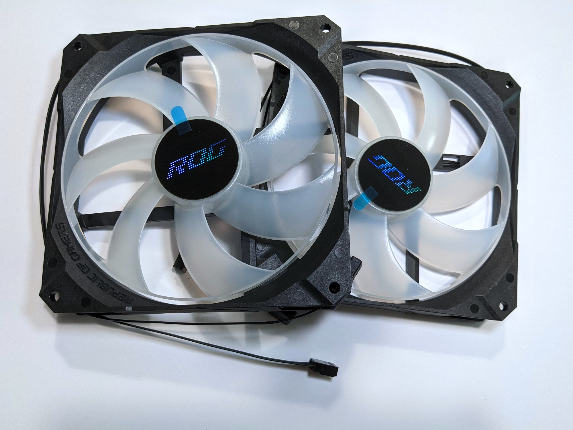 Die beiden 140-mm-Lüfter der Strix LC II 280 ARGB verfügen über schwarze Rahmen und leicht transparente hellgraue Lüfterblätter. Auch hier weisen reflektierende, mittig angebrachte Logos und Schriftzüge am Rahmen sehr deutlich auf die Zugehörigkeit zur ROG-Serie hin.