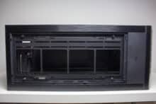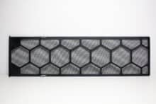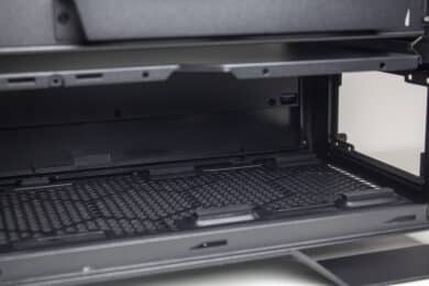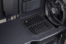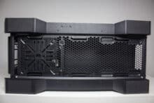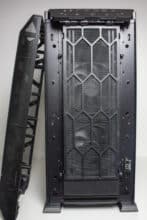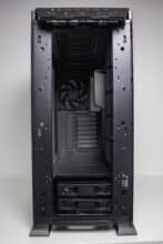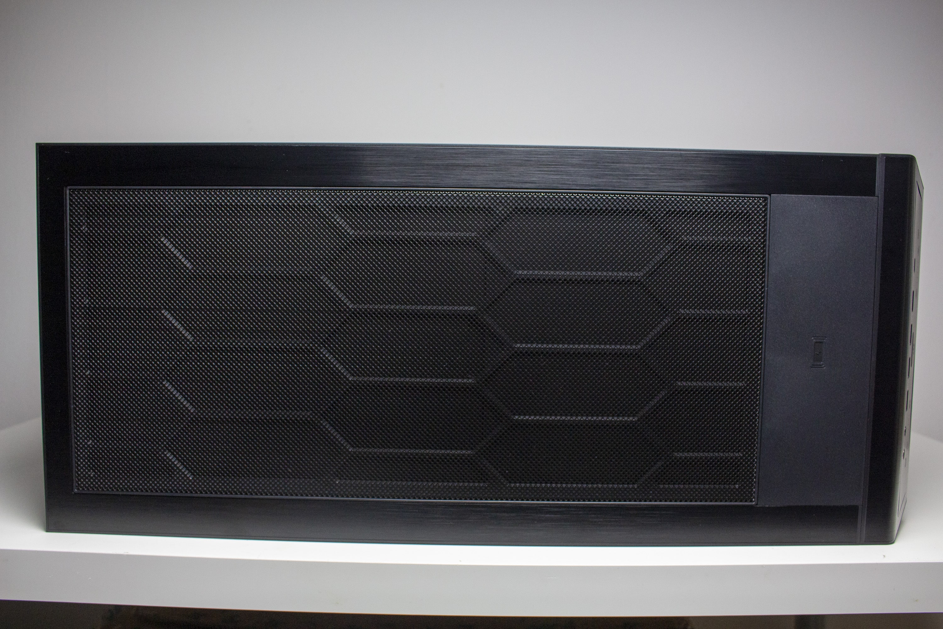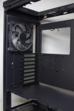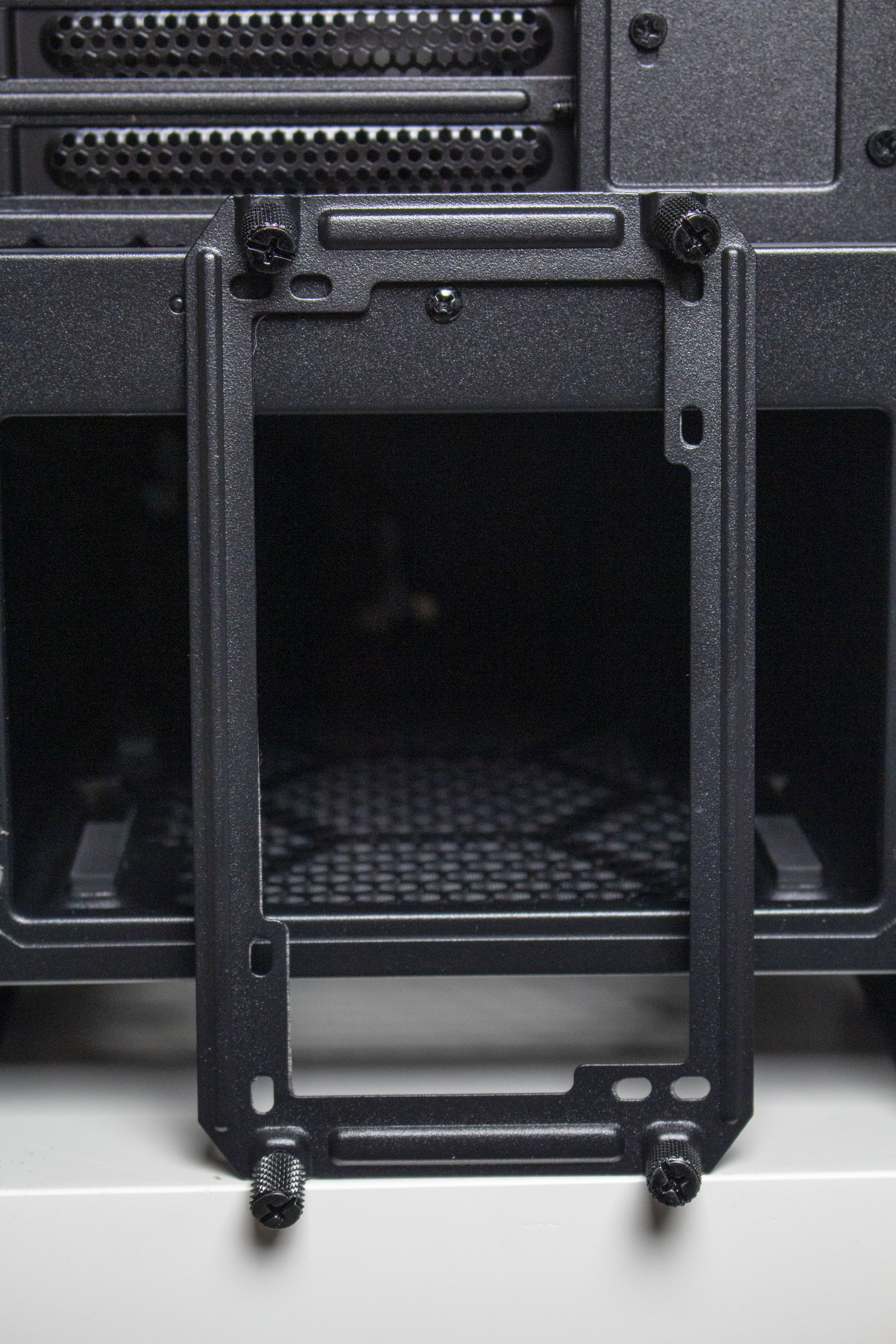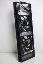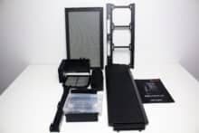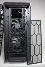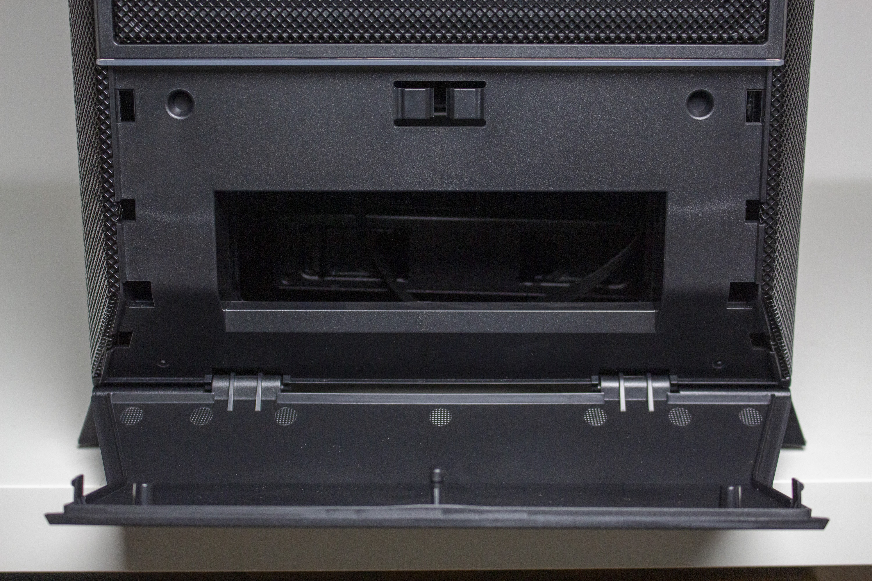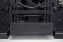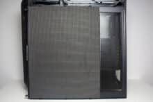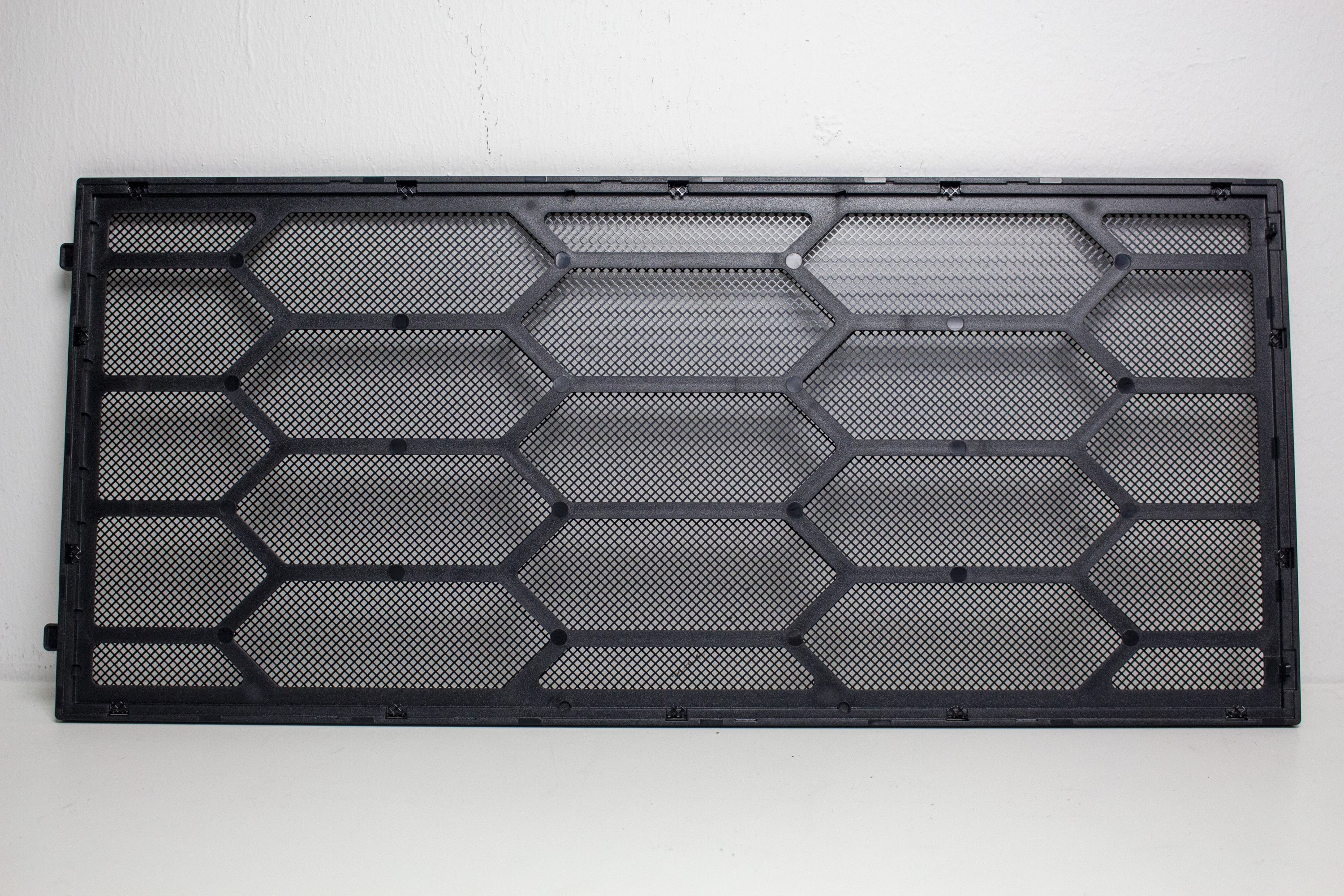 Hinter dem Frontpanel findet sich ein feiner und einfach zu entfernender Staubfilter sowie ein modularer Lüfterrahmen, der drei 140-mm- oder drei 120-mm-Lüfter bzw. entsprechende Radiatoren aufnehmen kann. Eine volle Bestückung mit 140-mm-Lüftern kann jedoch nur erfolgen, wenn kein 5,25″-Laufwerk verbaut wird. Zudem gibt es für den unteren Bereich keine Mesh-Einsatz und es bleiben lediglich die seitlichen Belüftungsöffnungen. Die Demontage des Lüfterrahmens erfolgt mittels vier Rändelschrauben.