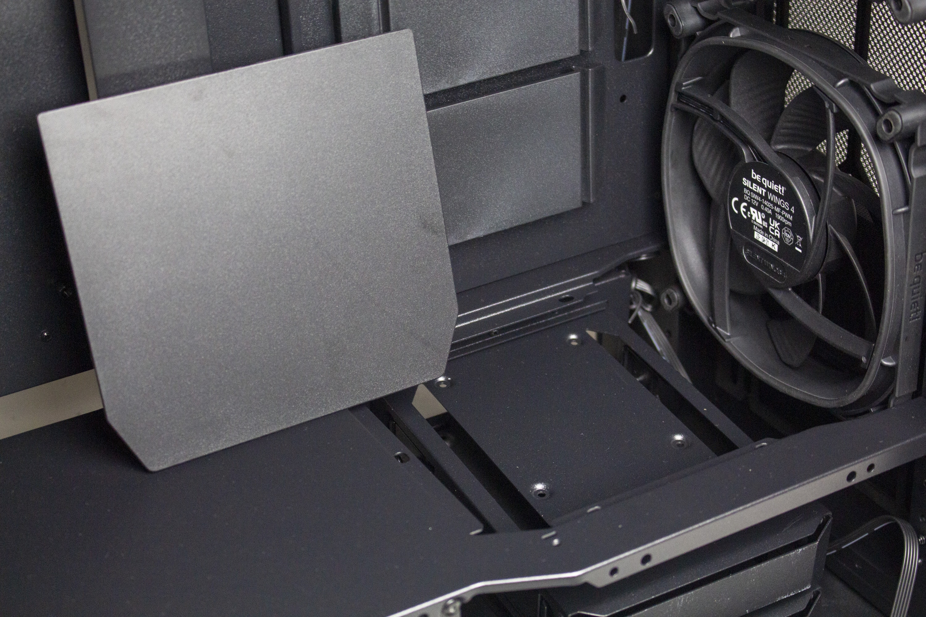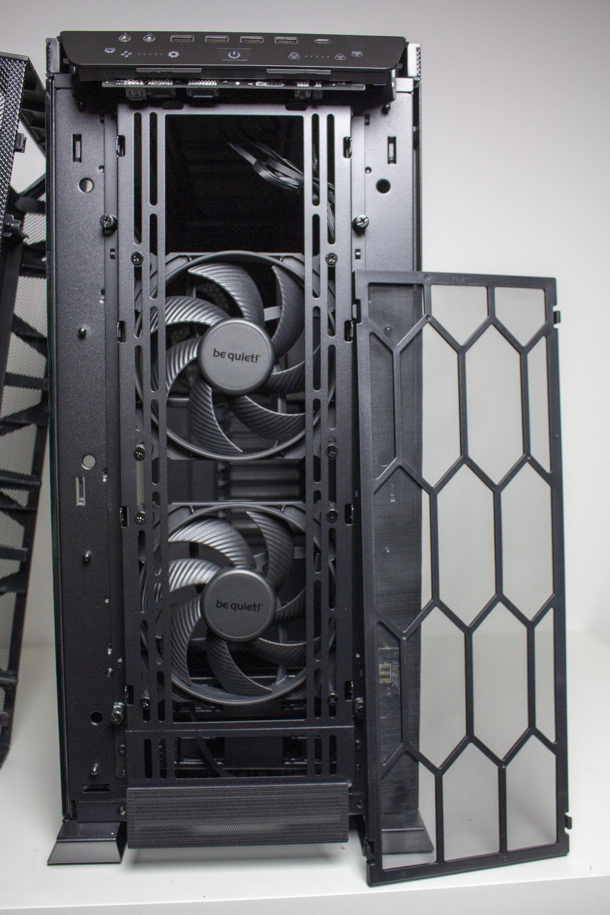 Nun geht es weiter im Deckel. Dieser besteht aus einer großen Meshplatte, die in einen Kunststoffrahmen sowie zwei längliche Streifen aus gebürstetem Aluminium eingefasst wurde. Im vorderen Bereich befinden sich zwei versteckte Push-Pin-Mechanismen (ebenfalls aus Kunststoff) unterhalb des Panels. Drückt man also kräftig auf beide Seiten, dann hebt sich die Meshplatte und kann herausgehoben werden. Darunter lassen sich dann zwei Abdeckungen mit einer Geräuschdämmung erkennen. Die Platten können bei Bedarf anders positioniert oder ganz entnommen werden. Noch eine Stufe tiefer platziert be quiet! einen modularen Halterahmen für drei 120- oder drei 140-mm-Lüfter.