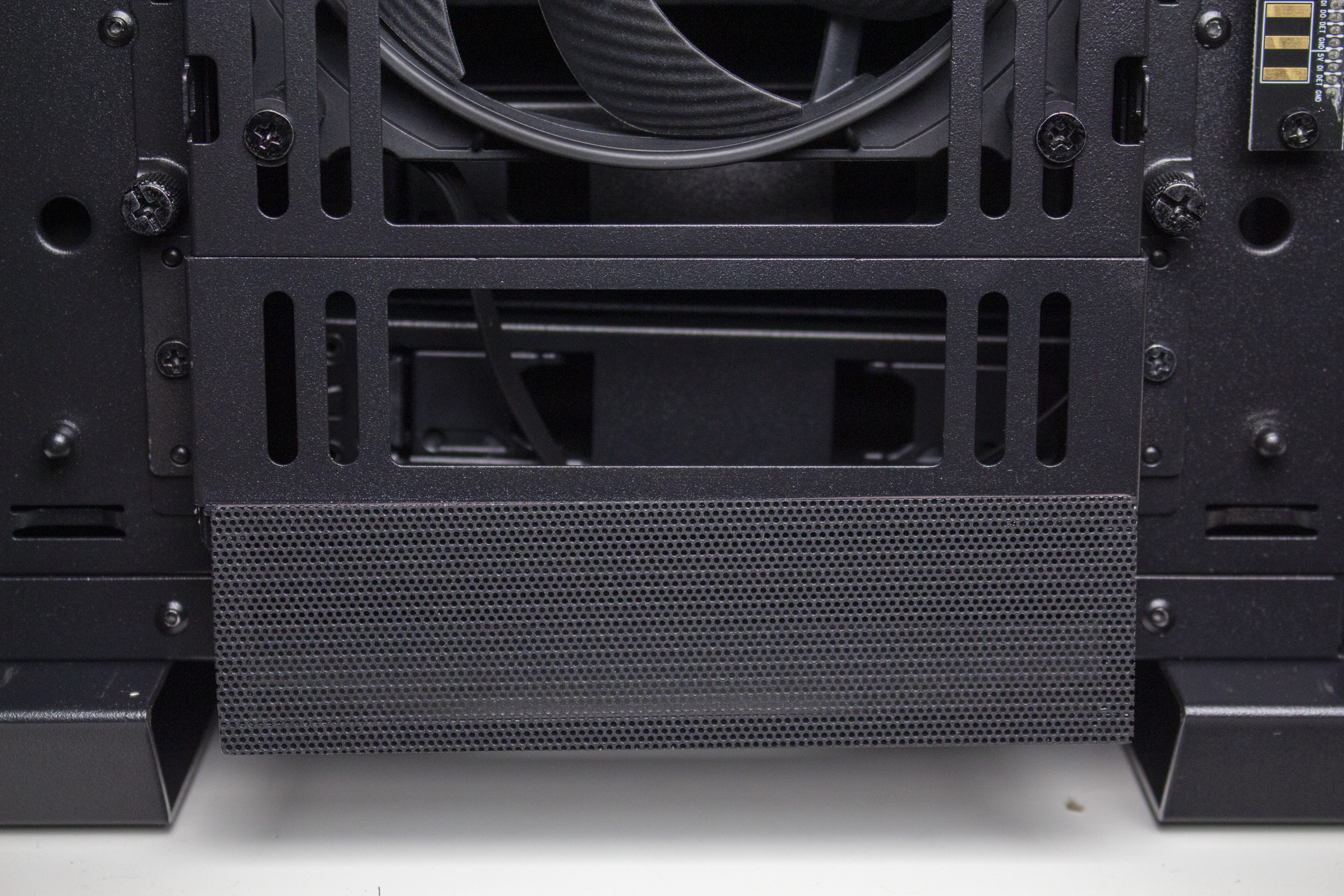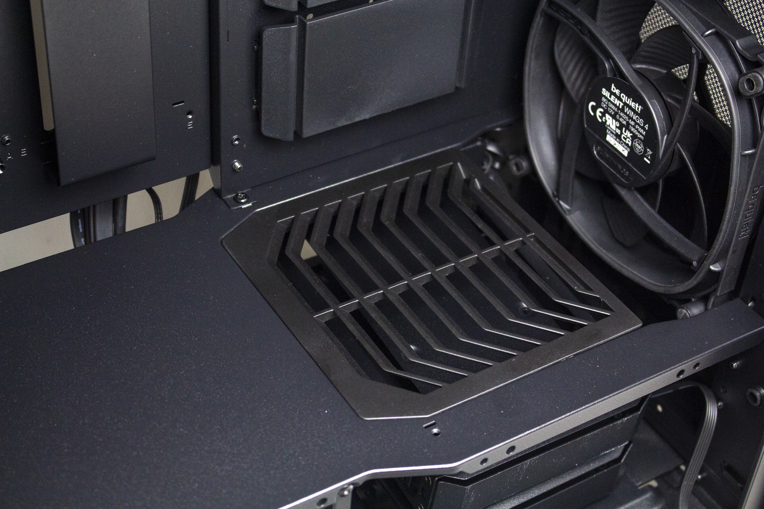 Das Netzteil wird, wie gewohnt, am Boden platziert und über einen modularen Rahmen von hinten in den Netzteiltunnel geschoben. Oberhalb des Netzteils lassen sich acht wiederverwendbare Slotblenden erkennen, die, zur Verbesserung des Airflows, perforiert wurden. Darüber verbaut be quiet! einen dritten 140-mm-Lüfter vom Typ Silent Wings 4 PWM und bereitet den Ausschnitt für das I/O-Panels des Mainboards vor.