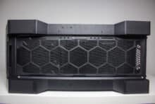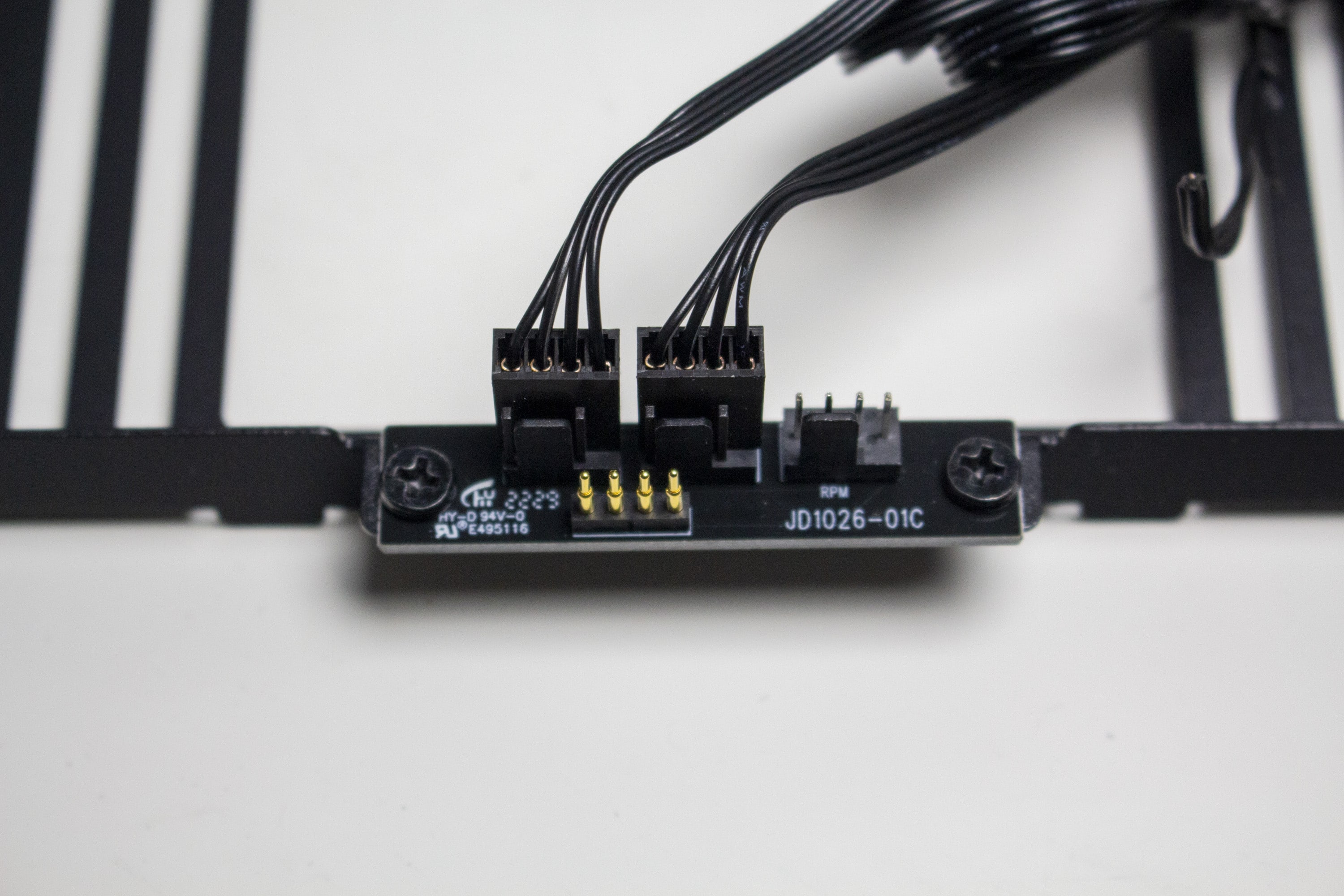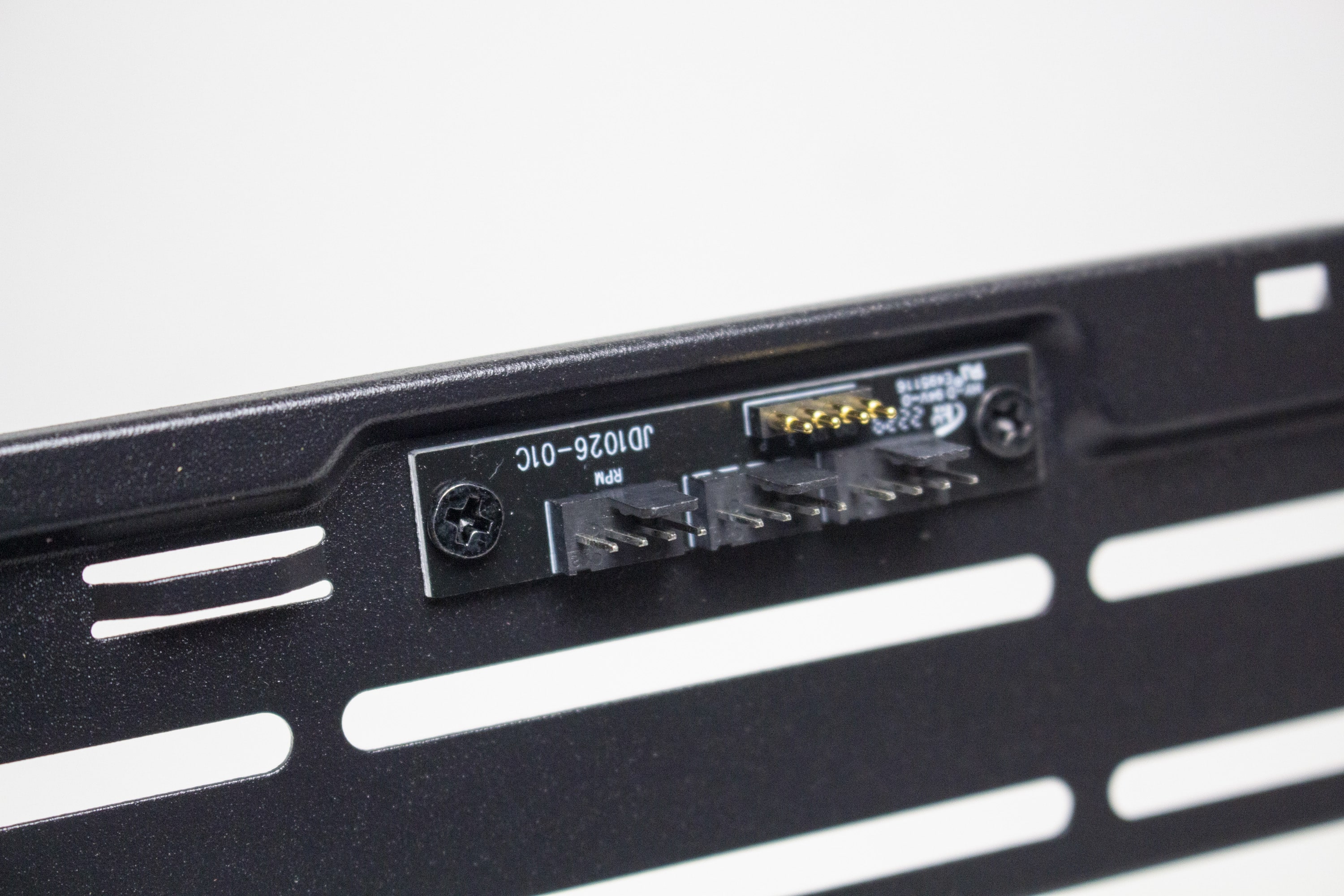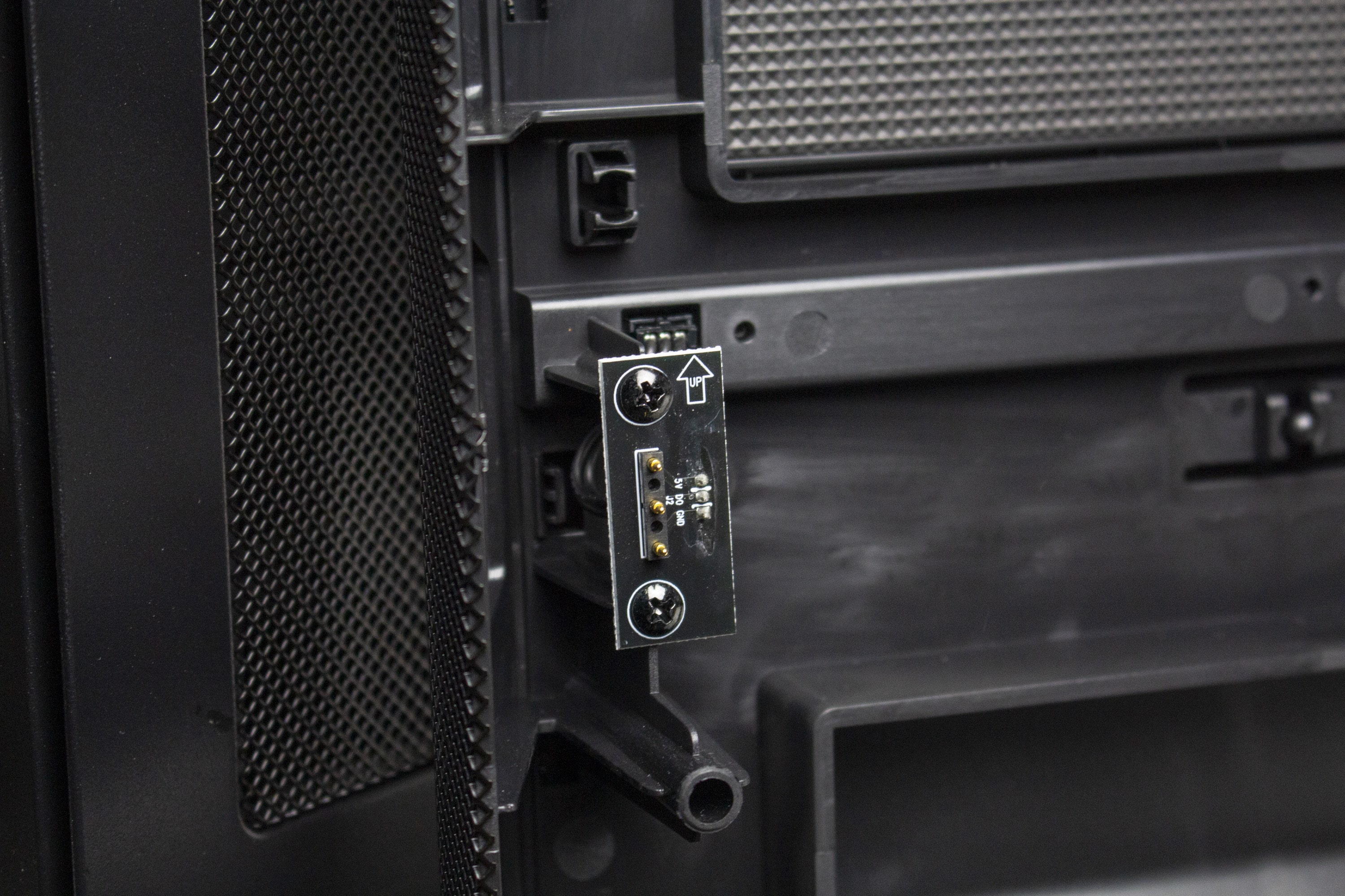 Eine Besonderheit der modularen Lüfterrahmen ist zudem, dass diese jeweils mit einer integrierten PWM-Anschlussplatine für bis zu drei Lüfter ausgestattet wurden. Über Stiftkontakte und eine Platine am Korpus kann der Rahmen also inklusive der Lüfter demontiert werden, ohne dass man mit nervigen Kabeln kämpfen muss. Die Kabel der Platine werden in beiden Fällen an die Lüftersteuerung im Frontpanel weitergeleitet. Dieses Feature dürfte eine Verkabelung der Gehäuselüfter oder den Einbau eines Radiators äußerst einfach gestalten.