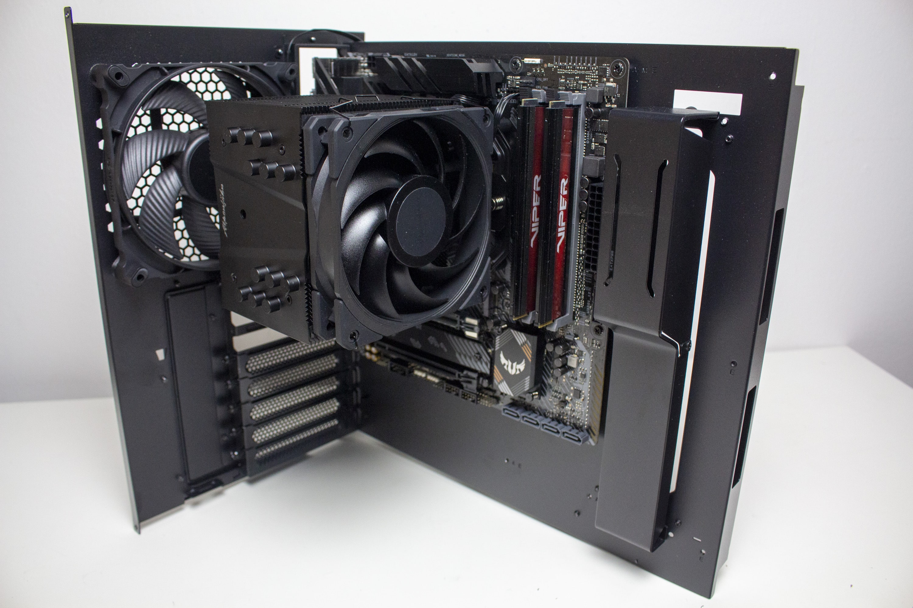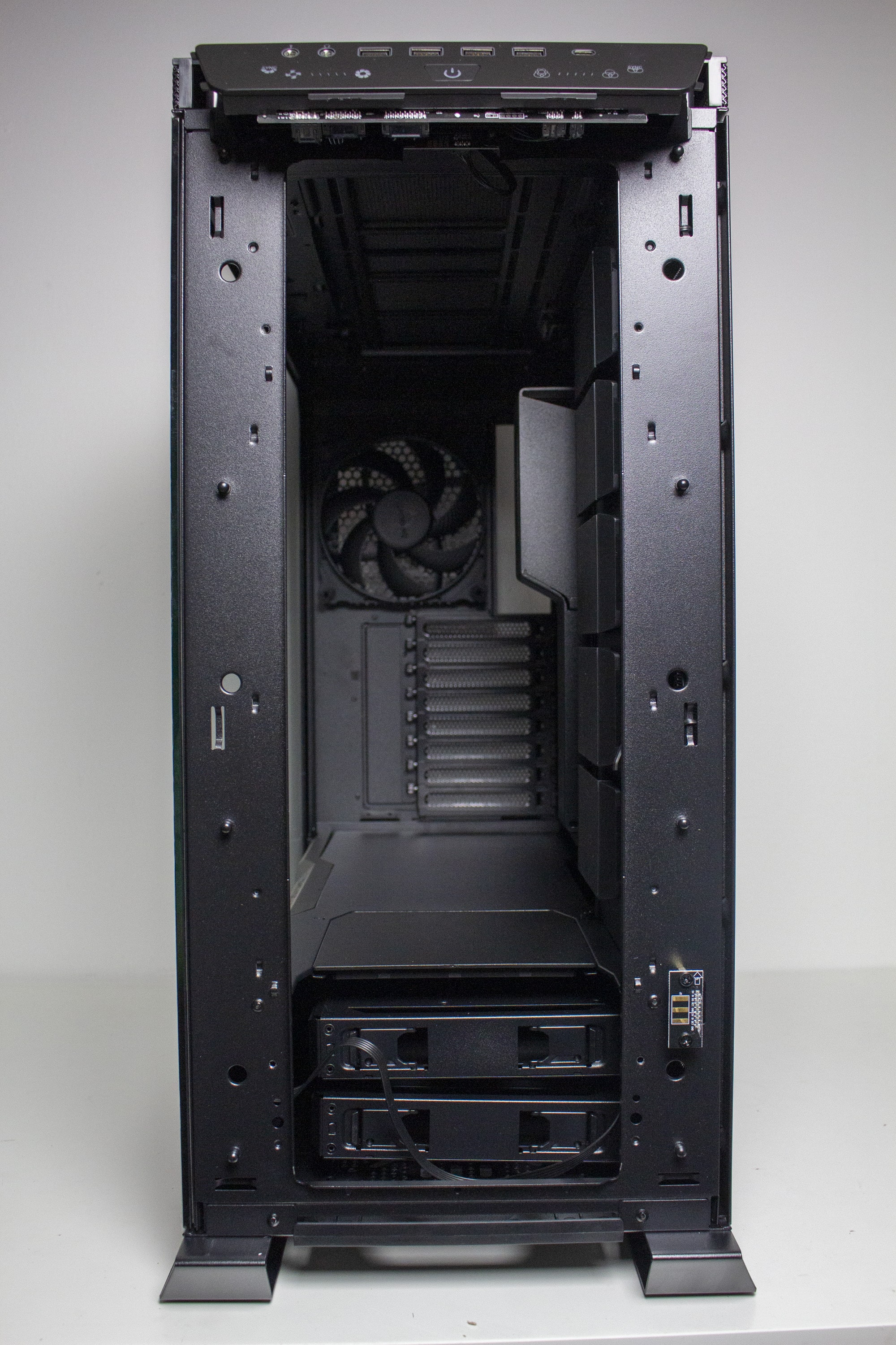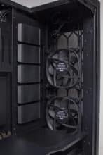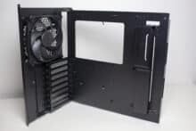 Im Auslieferungszustand können die zwei vorinstallierten Frontlüfter ungehindert Luft in den Innenraum befördern, da sich keine HDD-Schlitten im Weg befinden. Durch den Erwerb von optionalem Halterahmen können diese direkt hinter den Frontlüftern platziert werden. Dazu müssen lediglich die Kunststoffabdeckungen entfernt werden. Hat sich die eingeblasene Luft erwärmt, dann befördert der dritte vorinstallierte Gehäuselüfter am Heck diese wieder nach außen. Außerdem kann die warme Luft passiv über die Belüftungsöffnungen im Deckel sowie durch die Slotblenden entweichen.