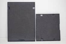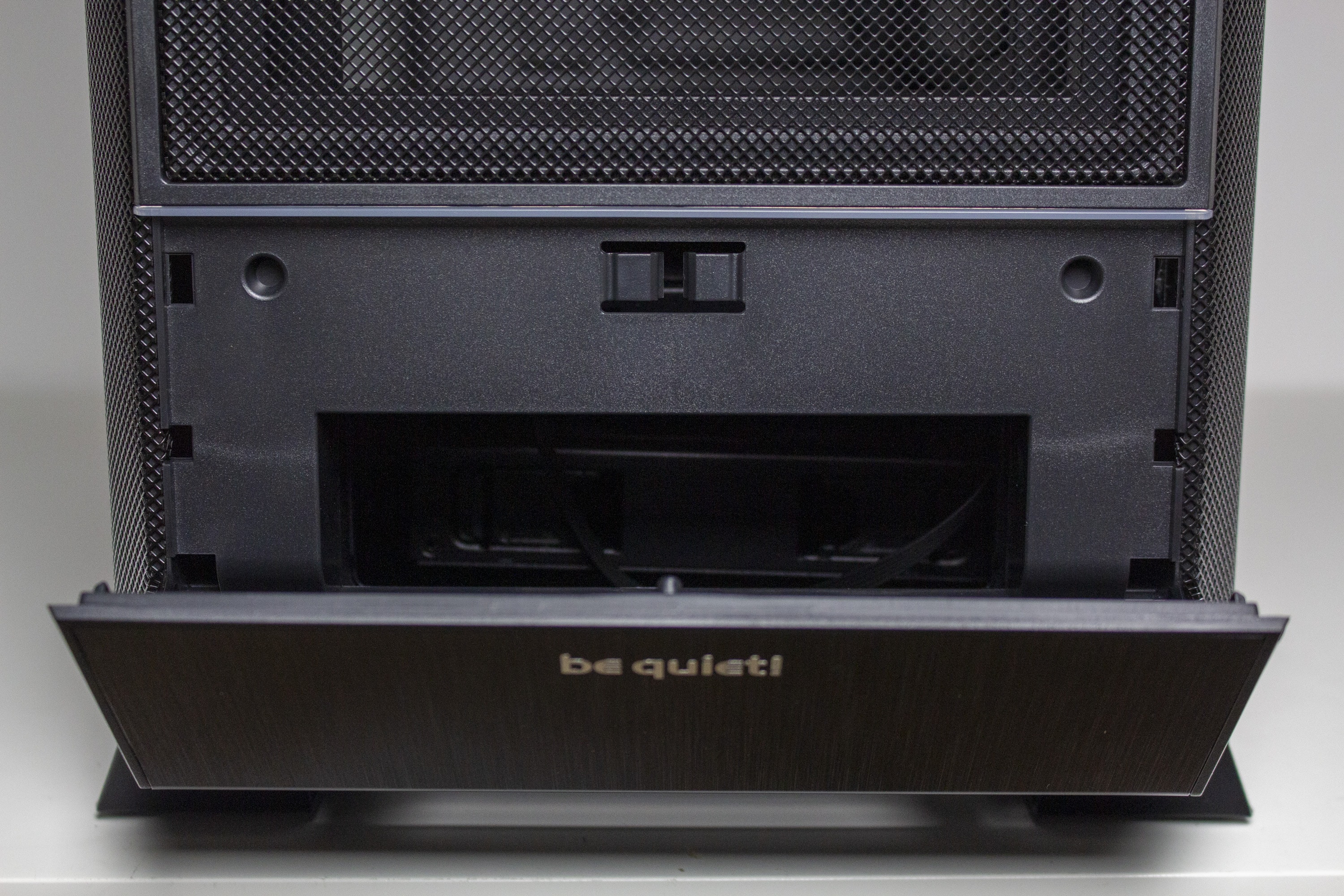 Die obere Platte ist modular gestaltet und kann, zur Verbesserung des Airflows, gegen die beigelegte Mesh-Blende ausgetauscht werden. Dazu müssen von hinten die Haltenasen aus den Löchern gedrückt werden. Der untere Bereich des Frontpanels verfügt über eine aufklappbare Blende für das externe 5,25″-Laufwerk. Die Arretierung erfolgt dabei über einen Pin aus Kunststoff in der Mitte. Das Aufklappen der Blende gleicht aber leider eher einer Herkulesaufgabe für die Fingernägel – bzw. -kuppen. Dafür hat be quiet! aber an eine separate Staubfilterung in Form einer magnetischen Filtermatte gedacht.