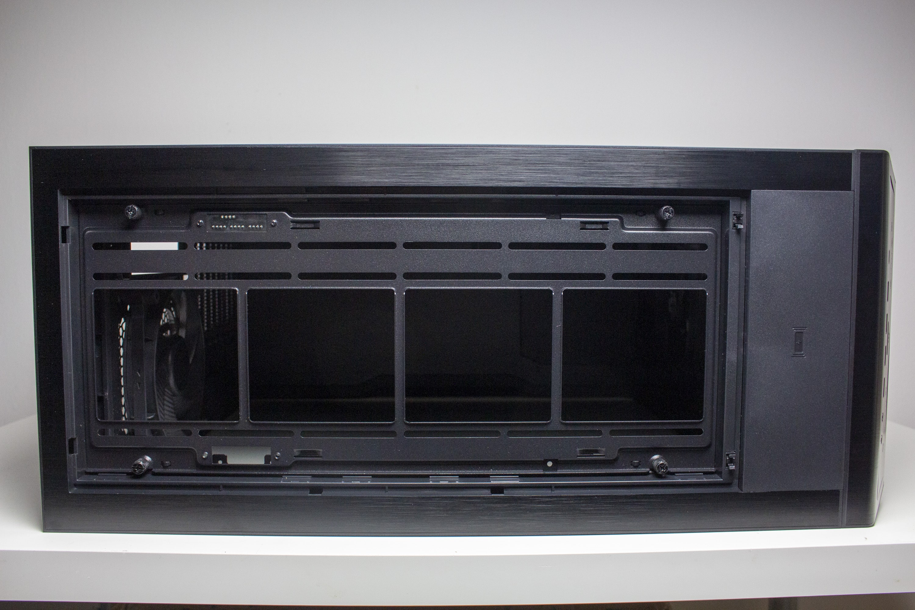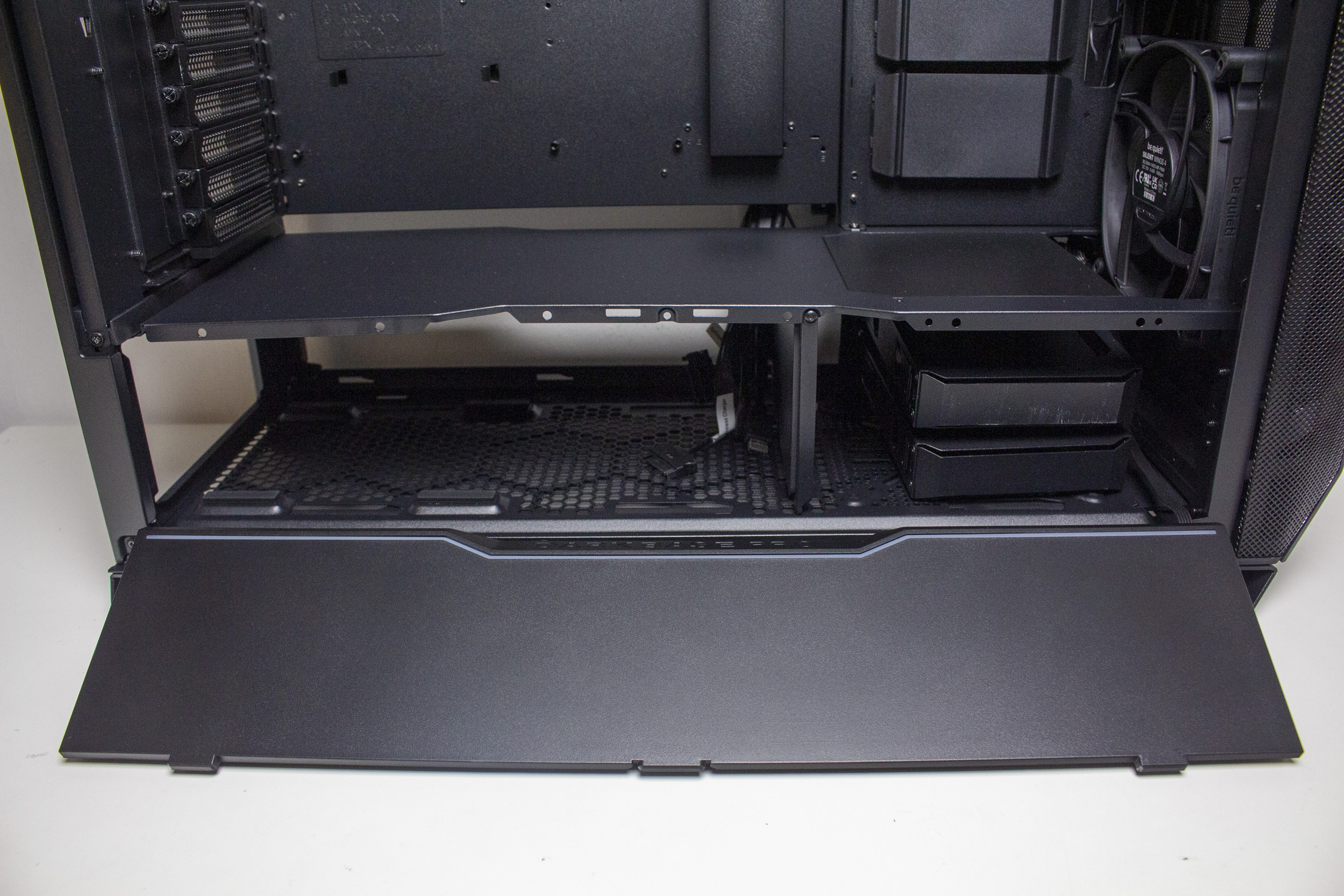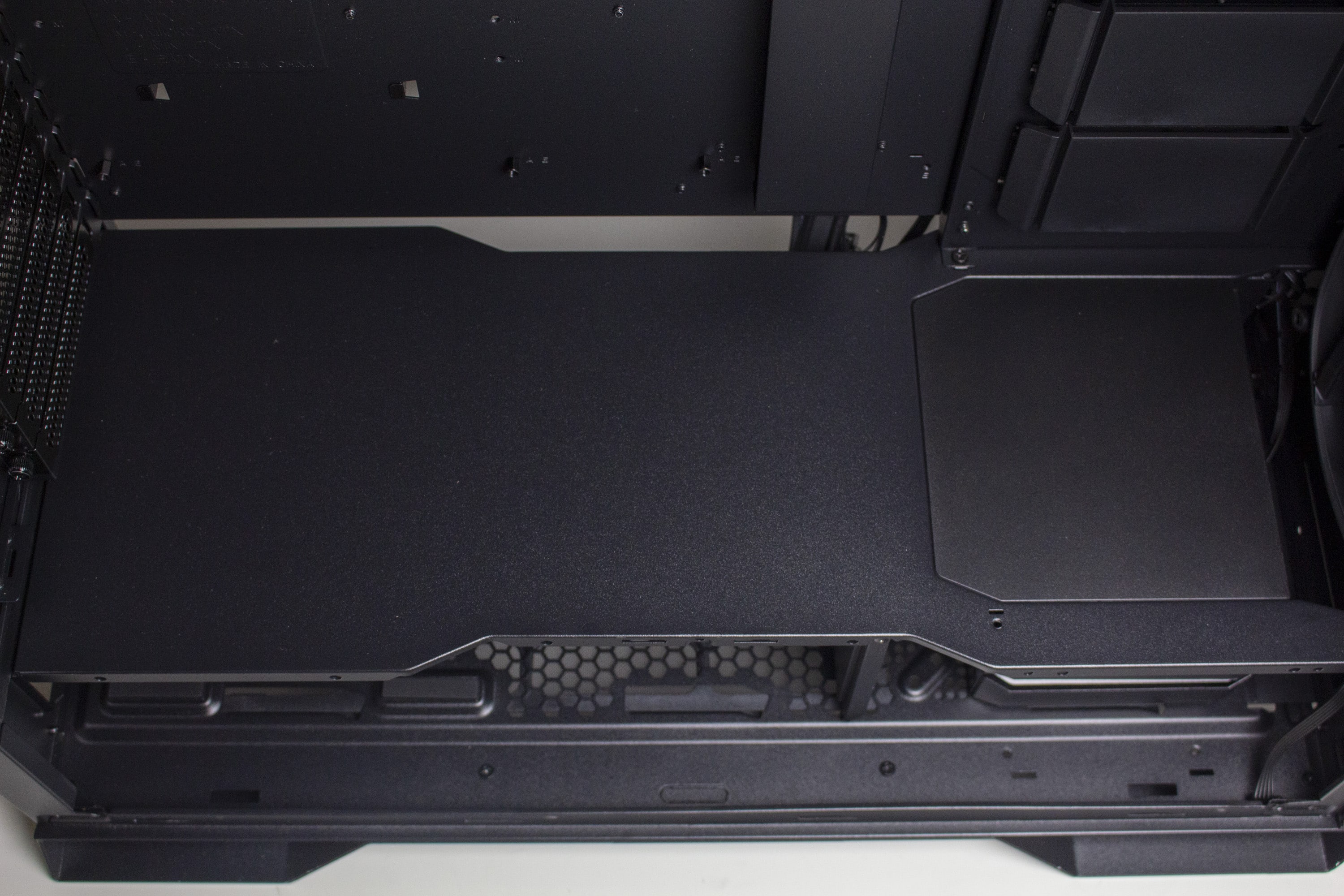 Anders als bei vielen anderen Gehäusen besteht die Netzteilabdeckung aus zwei Teilen. Die Oberseite ist aus Stahl gefertigt und am Korpus vernietet. Sie verfügt außerdem über eine längliche Kabelmanagementöffnung unter dem Mainboard-Tray sowie über eine geschlossene bzw. modulare Kunststoffplatte im vorderen Bereich, die weichen muss, wenn in der Front ein besonders dicker Radiator verbaut werden soll. Alternativ kann die geschlossenen Abdeckung auch durch eine im Zubehör befindliche Blende mit Belüftungsschlitzen ersetzt werden.