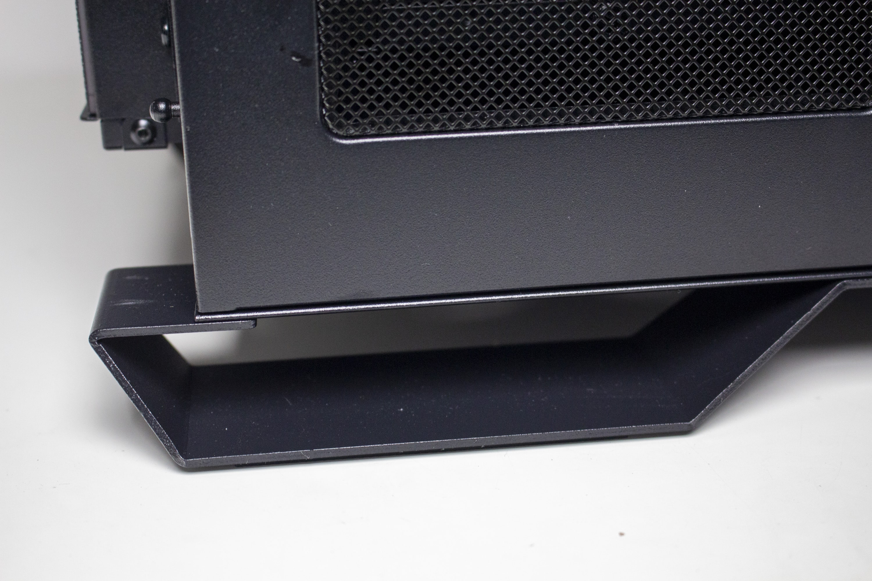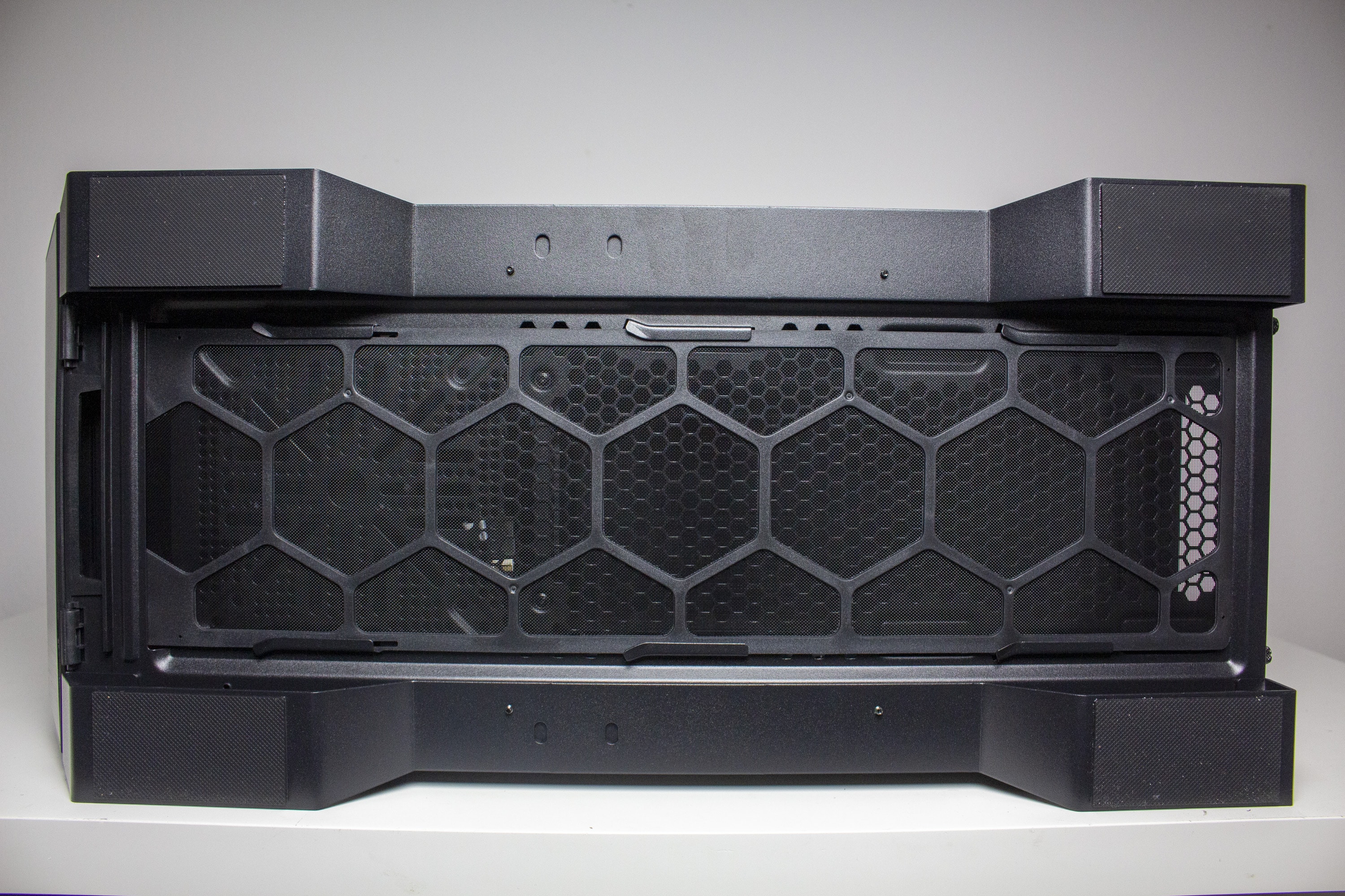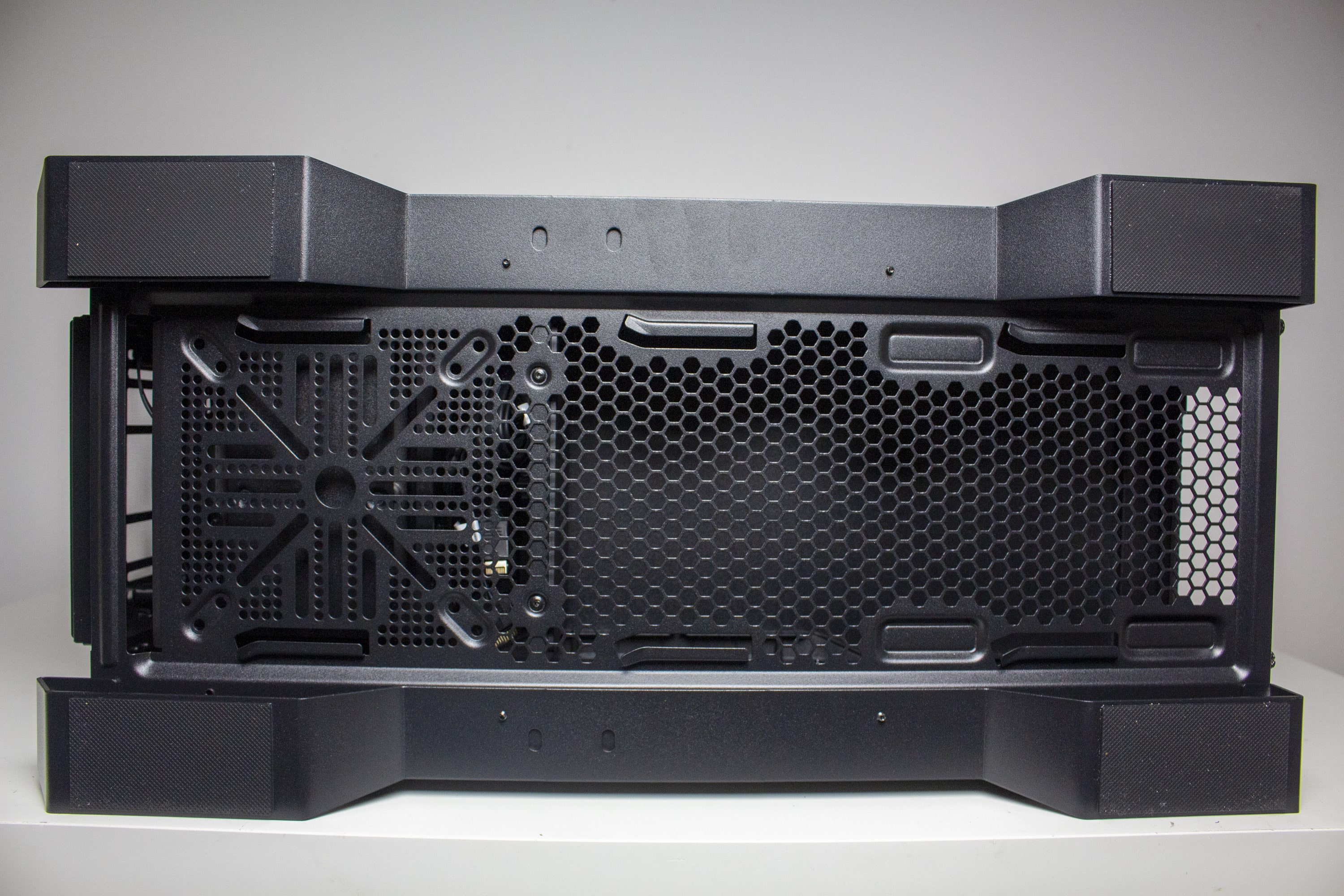 Aufgrund des hohen Gewichts setzt be quiet! beim Dark Base Pro 901 auf vier sehr stabile Standfüße aus Stahl. Diese wurden schwarz lackiert und wirken durch die offene Form optisch sehr ansprechend. Außerdem wurden die Unterseiten der Standfüße mit dicken Gummimatten beklebt, um für einen rutschfesten und möglichst vibrationsarmen Stand zu sorgen. Ansonsten lässt sich noch ein großer, feinmaschiger Staubfilter erkennen, der zum Ausbau nach vorne entnommen werden kann. Letzteres lässt sich aber nur realisieren, wenn das Frontpanel zuvor entfernt wurde. Ansonsten ist die Unterseite großzügig perforiert und bietet zudem Platz für einen 120- oder 140-mm-Lüfter.