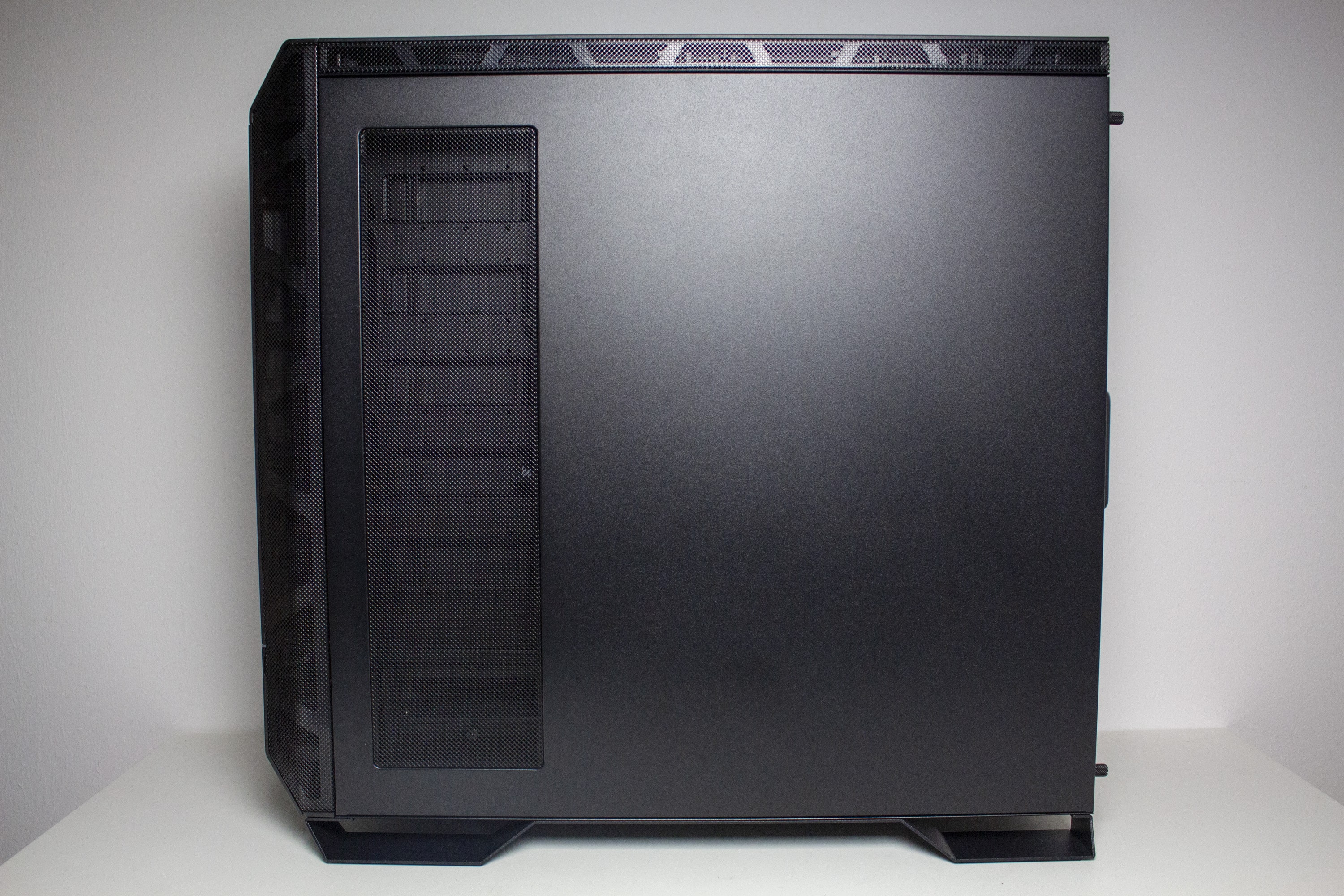 Bei den Seitenteilen bleibt be quiet! etwas hinter unseren Erwartungen zurück. So werden bei anderen Gehäusen dieser Preisklasse mittlerweile häufig Sidepanels mit Scharnier verbaut. Beim Dark Base Pro 901 setzt man aber auf eine klassische Befestigung mit Stahlnasen und jeweils zwei Rändelschrauben sowie Griffmulden an der Rückseite. Die linke Seite besteht aus Tempered Glass, welches auf einen Stahlrahmen geklebt wurde, und die rechte Seite besteht aus Stahl und wurde von Innen mit einer Dämmmatte ausgekleidet. Außerdem verfügt das rechte Seitenteil über ein großes aber ungefiltertes Belüftungsgitter im vorderen Bereich. Die Stabilität beider Seitenteile ist sehr gut und vermutlich wiegen diese zusammen mehr als so manches Gehäuse.