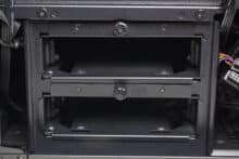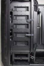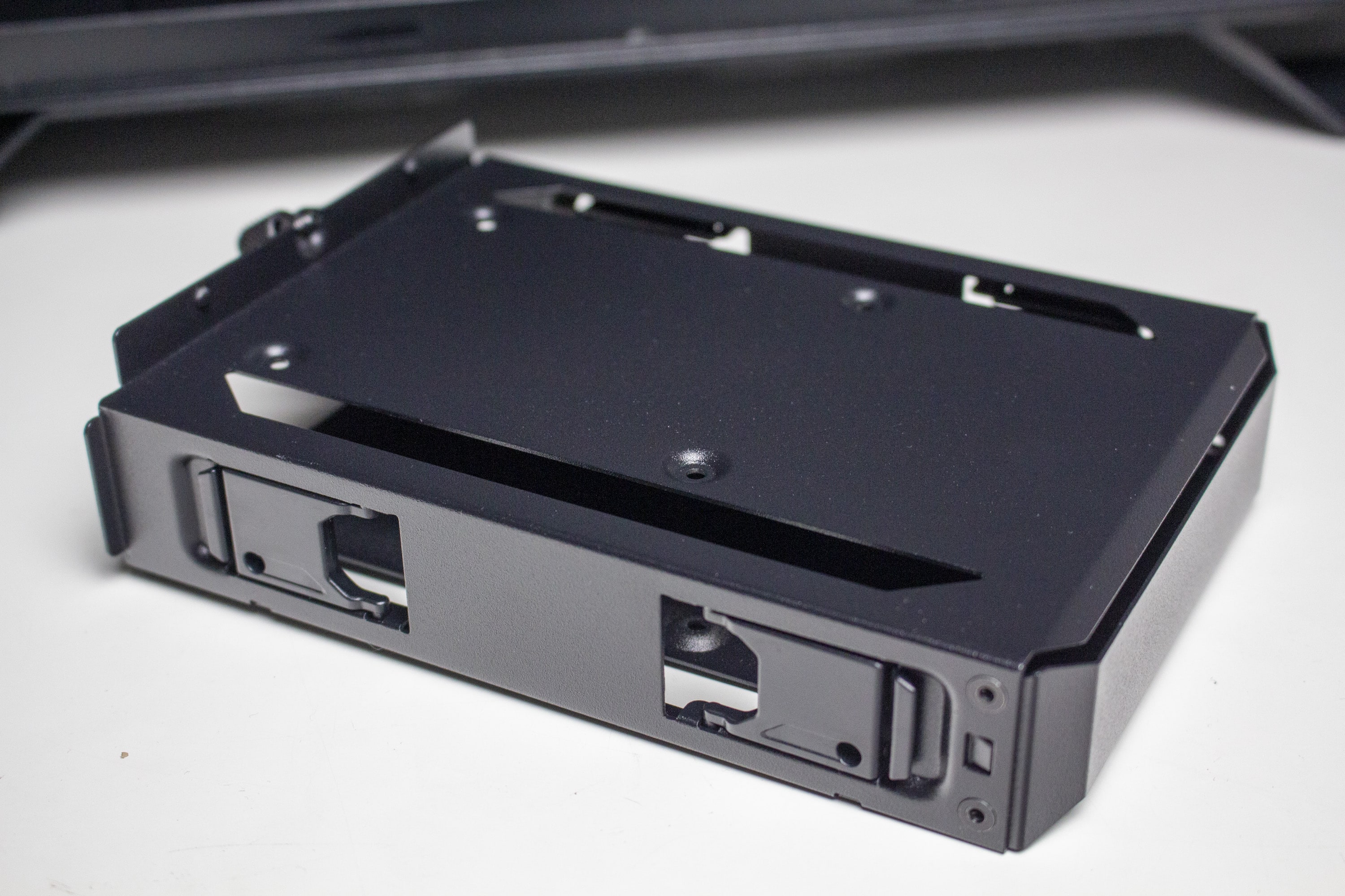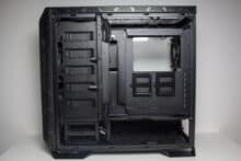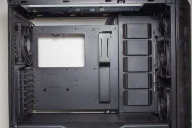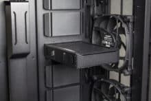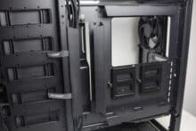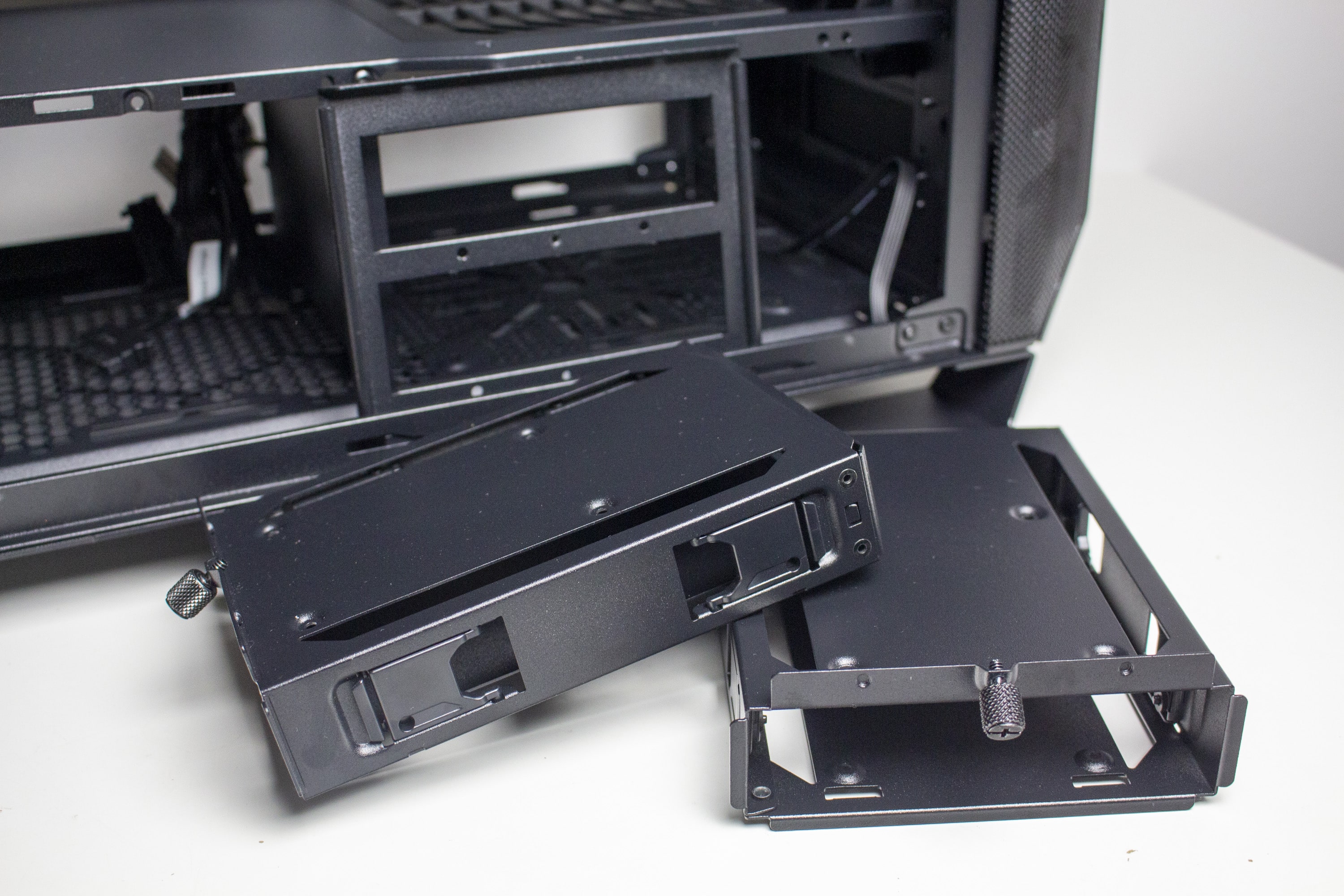 Ab Werk bietet das Dark Base Pro 901 Platz für zwei 3,5″- und zwei 2,5″-Datenträger oder optional für sechs 2,5″-Datenträger. Diese werden im HDD-Käfig oder am Rahmen hinter dem Mainboard-Tray platziert. Die Befestigung von 2,5″-SSDs erfordert Schrauben, 3,5″-HDDs können hingegen mit Schnellverschlüssen im Rahmen befestigt werden. Optional bietet das Dark Base Pro 901 mit optionalen HDD-Rahmen Raum für fünf weitere 3,5″- oder zehn weitere 2,5″-Datenträger. Die Rahmen können im Innenraum hinter den Frontlüftern befestigt werden.