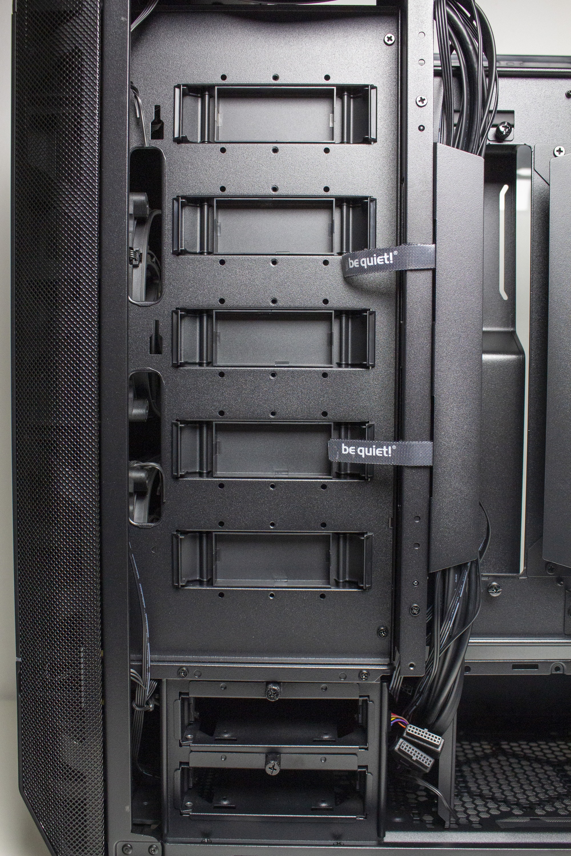 Hinter dem Mainboard-Tray gibt es ansonsten sehr viel Platz für Kabel und ein hervorragend ausgearbeitetes Kabelmanagementsystem. So spendiert be quiet! dem Big-Tower nicht nur wiederverwendbare Kabebinder, es lassen sich zudem Kabelmanagement-Kanäle erkennen, die außerdem noch modular sind. Auch auf klassische Stahlösen und einen Ausschnitt für Backplates von großen CPU-Kühlern verzichtet der Hersteller nicht. An der linken Seite kann zudem die im Lieferumfang enthaltene Kunststoffblende positioniert werden. Diese verdeckt dann die Sicht durch das Gitter des Seitenteils auf mögliche Festplattenkabel.