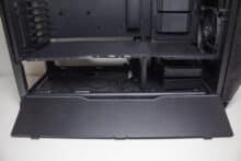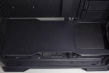 Unter der Netzteilabdeckung lassen sich ein modularer HDD-Käfig sowie der Montagepunkt für das Netzteil erkennen. Um eine Übertragung von Schwingungen auf den Korpus zu verhindern, platziert der Hersteller im Boden unter dem Netzteil längliche Streifen aus Gummi auf denen die Spannungsversorgung ruhen kann. Wie bereits im vorherigen Kapitel erwähnt, wird das Netzteil beim Dark Base Pro 901 über einen modularen Netzteilrahmen von hinten in den Netzteiltunnel geschoben. Die davor platzierte Halterung für die HDD-Rahmen kann nach der Entfernung von vier Schrauben ausgebaut werden.