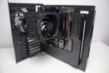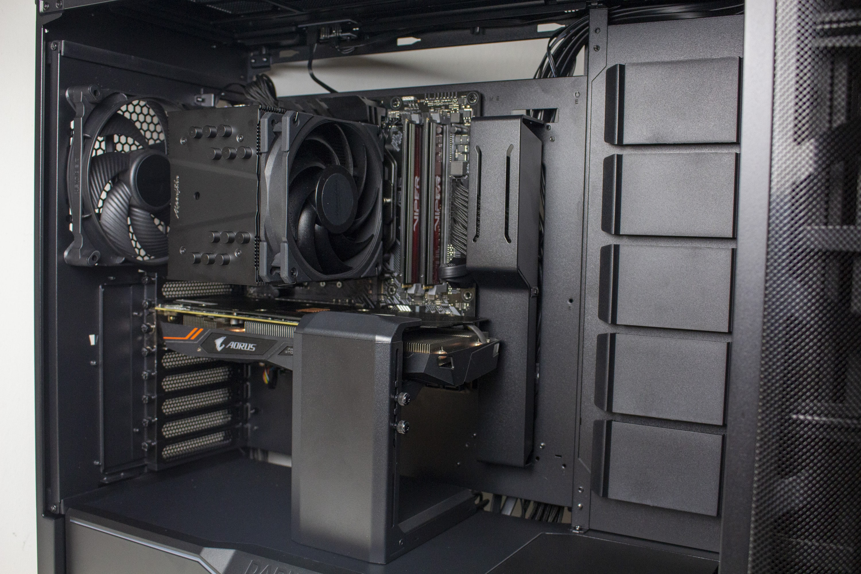 Wie zu erwarten war, konnte der Einbau aller Komponenten des Testsystems sehr einfach und innerhalb kürzester Zeit durchgeführt werden. Besonders praktisch war dabei das entfernbare Mainboard-Tray. So konnte man dieses problemlos außerhalb des Gehäuses mit dem Mainboard und allen anderen Komponenten bestücken und es dann zurück in den Innenraum schieben. Auch die Verkabelung war aufgrund des sehr großzügigen Platzangebots hinter dem Mainboard-Tray und durch die hervorragenden Kabelkanäle ein Kinderspiel. Zuletzt sei auch noch die magnetische GPU-Halterung zu erwähnen. Diese verhindert nicht nur ein Absacken der Grafikkarte, sie sieht auch noch schick aus und lässt die Netzteilkabel perfekt verschwinden. Durch den magnetischen Fuß ist sie zudem variabel platzierbar. Insgesamt konnten wir ein optisch ansprechendes System im Dark Base Pro 901 kreieren.