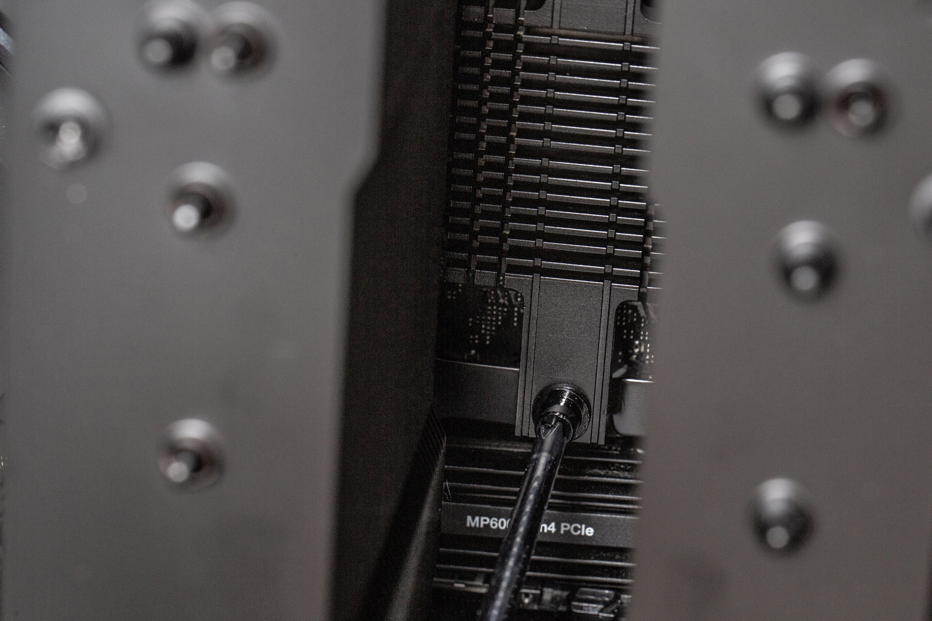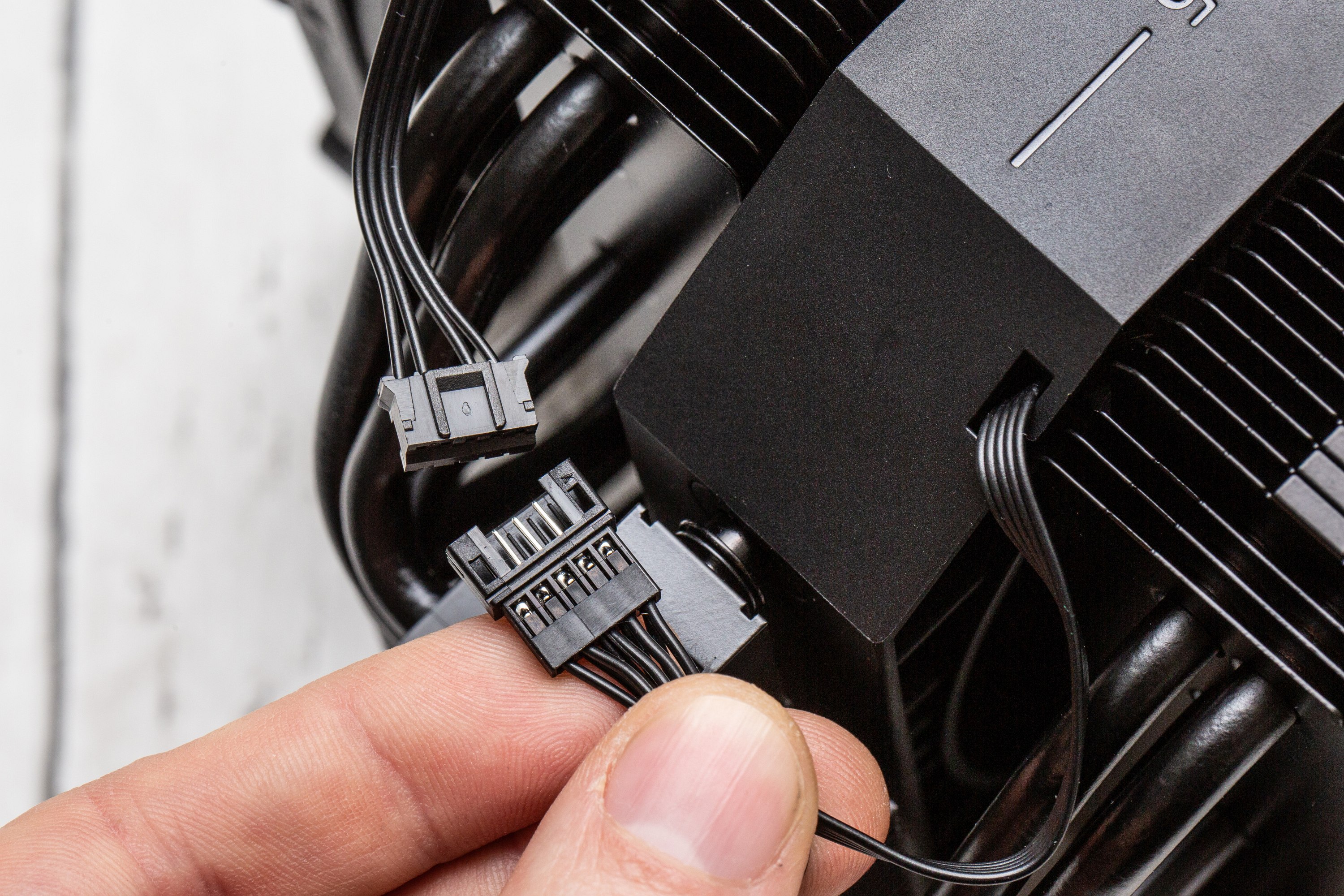Die Verarbeitungsqualität des be quiet! Dark Rock Elite ist, wie man es von einem Kühler der nicht gerade günstigen Oberklasse erwarten würde: hervorragend. Die Materialstärke ist ordentlich, sodass auch die Lamellen sich nicht so leicht verbiegen. Die schwarze Beschichtung wirkt rundum sauber und es gibt auch sonst keine Stellen, die negativ auffallen. Der mittlere Lüfter wird mit der oberen Platte an vier Stellen oben eingeklickt und an den Schrauben vom Montagemechanismus gehalten. Die Kabel sind kurz, weshalb auch auf eine Ummantelung verzichtet wurde. Damit reichen die Kabel sehr gut für das Erreichen des Lüfter-Headers, ohne dass viel Gekabels übrig bleibt, das verteilt werden müsste. Lediglich das ARGB-Kabel ist ein wenig länger, aber auch dieses hält sich in Grenzen und kann bei Nichtverwendung auch einfach unter dem Kühlkörper versteckt werden.