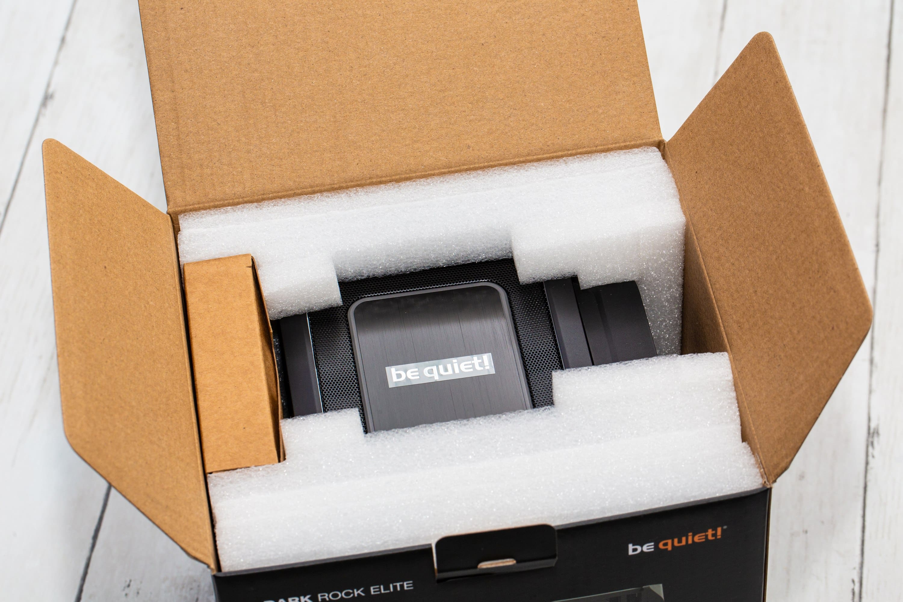Die Verpackung des be quiet! Dark Rock Elite folgt dem klassischen Stil der Marke. Eine schwarze Schachtel mit sehr klarem Aufdruck des Produkts mit dessen Bezeichnung. Ansonsten finden sich an der Seite die Spezifikationen und auf der Rückseite ist der be quiet! Dark Rock Elite deutsch und englisch beschrieben. Öffnet man die Box, sieht man von oben auf den Kühler, der von zwei weichen Schaumstoffschalen gehalten wird. Daneben steckt die Schachtel mit dem Montagematerial.