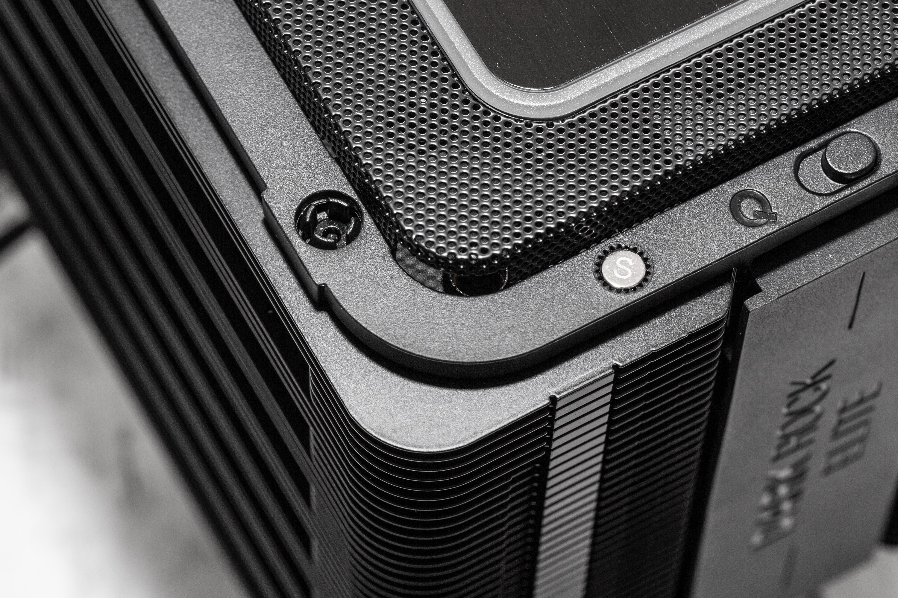 Eine Besonderheit der neuen Premium-Kühler von be quiet! sind die Schalter zur Auswahl der Maximaldrehzahl. Ein ähnliches Feature war bereits an den be quiet! Silent Wings Pro 4 zu finden. An CPU-Kühlern war dieses Konzept beispielsweise am DeepCool Assassin IV, einem weiteren großen Luftkühler mit besonders sauberem Design, zu sehen. Dieser stellt auch einen modernen Konkurrenten zum be quiet! Dark Rock Elite dar und wird daher in den Leistungsvergleich mit aufgenommen. Aber zurück zum Schalter: Dieser fungiert als Limitierung der Höchstdrehzahl. Man hat also die Wahl zwischen voller Leistung und geringerer Maximallautstärke. Am be quiet! Dark Rock Elite ist dieser Schalter unter der magnetisch gehaltenen Lamellenabdeckung zu finden, er stört also die Optik nicht.