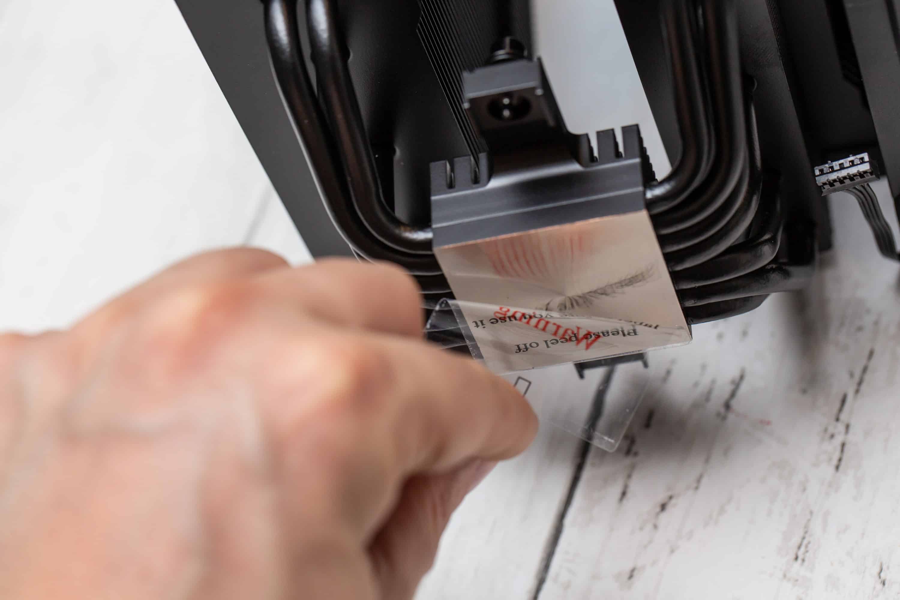 Zwei Brackets werden samt Abstandhaltern bei AMD in die Backplate geschraubt. Für Intel wird eine Backplate mitgeliefert, die selbst zusammengesteckt werden muss, was aber mit der übersichtlichen Bedienungsanleitung auch kein Problem ist. Sind die Brackets platziert, kommt die Wärmeleitpaste auf den Prozessor. Nun muss der mittlere Lüfter aus dem Kühlkörper genommen werden und der Aufkleber von der Kontaktfläche muss entfernt werden. Dann kann der Kühlkörper mit dem langen Schraubendreher sehr einfach befestigt werden. Anschließend muss der mittlere Lüfter eingesetzt und festgeclippt werden, was etwas Kraft erfordert.